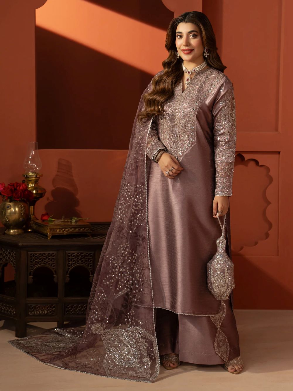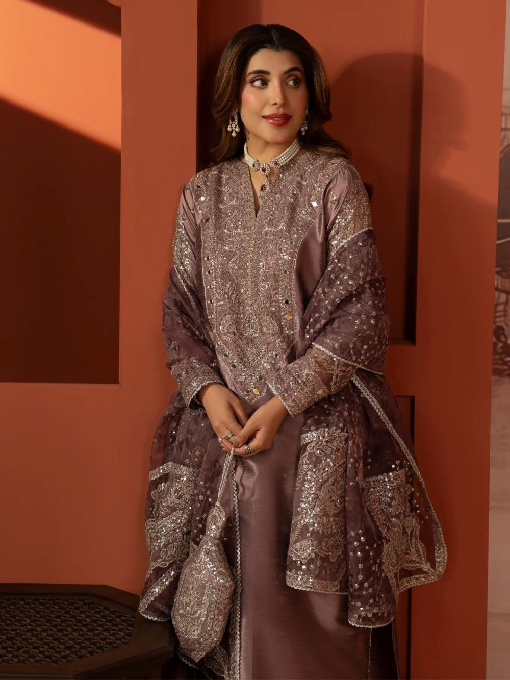 DYED INDIAN RAW SILK EMBROIDERED SHIRT WITH MIRROR WORK