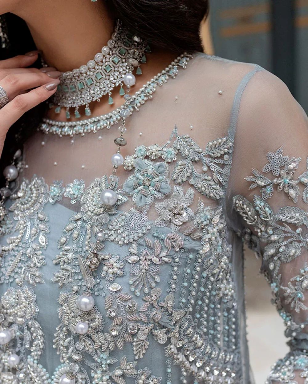 This ice blue long shirt crafted from pure silk organza is heavily ornamented with Crystal’s and thread work. This luxurious outfit is finished with raw silk pants and a pearl embellished dupata for an ethereal look.