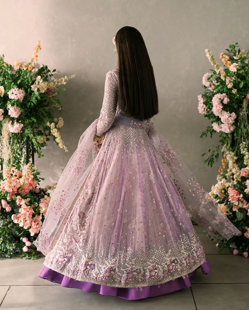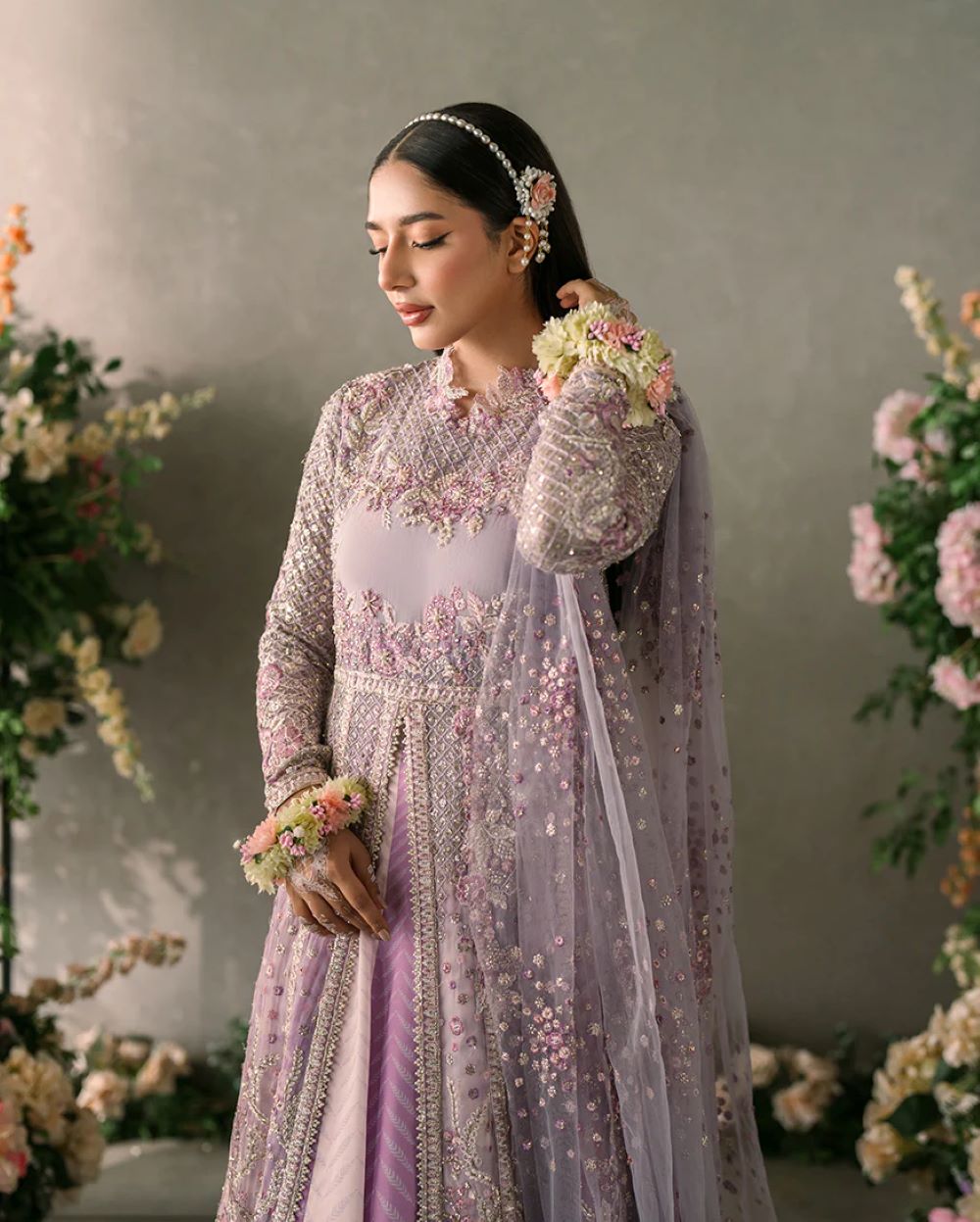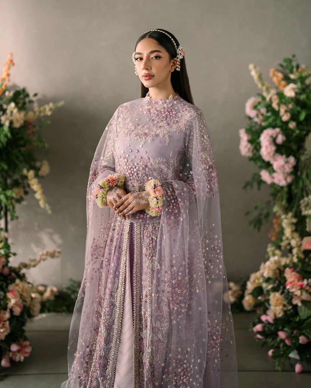 Alyana —a true statement of elegance and artistry. Featuring hand-embellished details on delicate chiffon, this ensemble combines timeless sophistication with modern flair. The look is elevated by a net dupatta, intricately embroidered and adorned with sequins, adding a touch of shimmering grace.