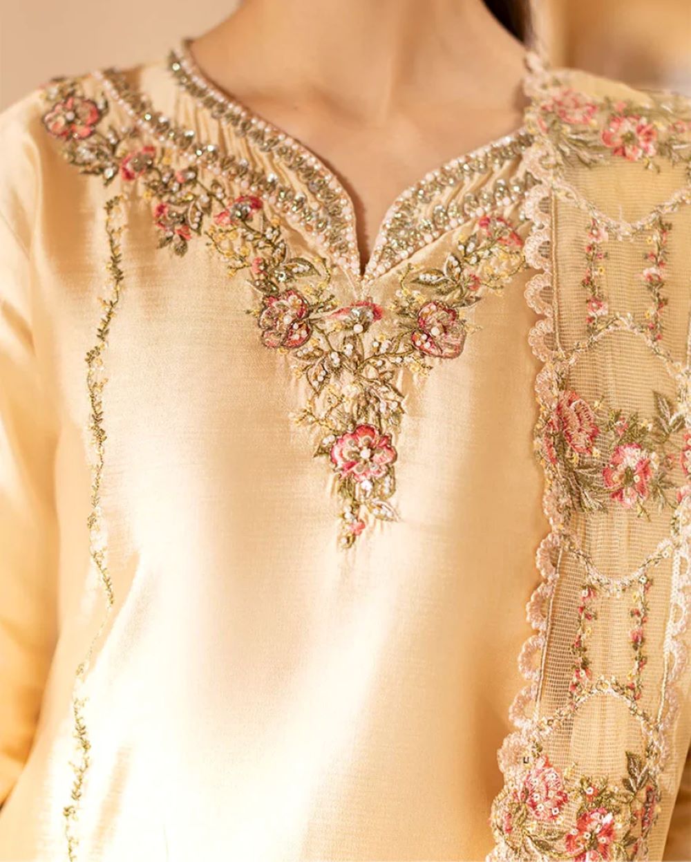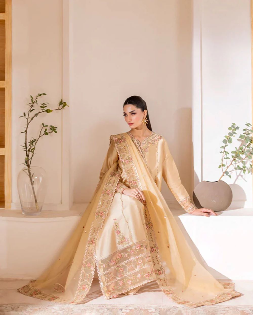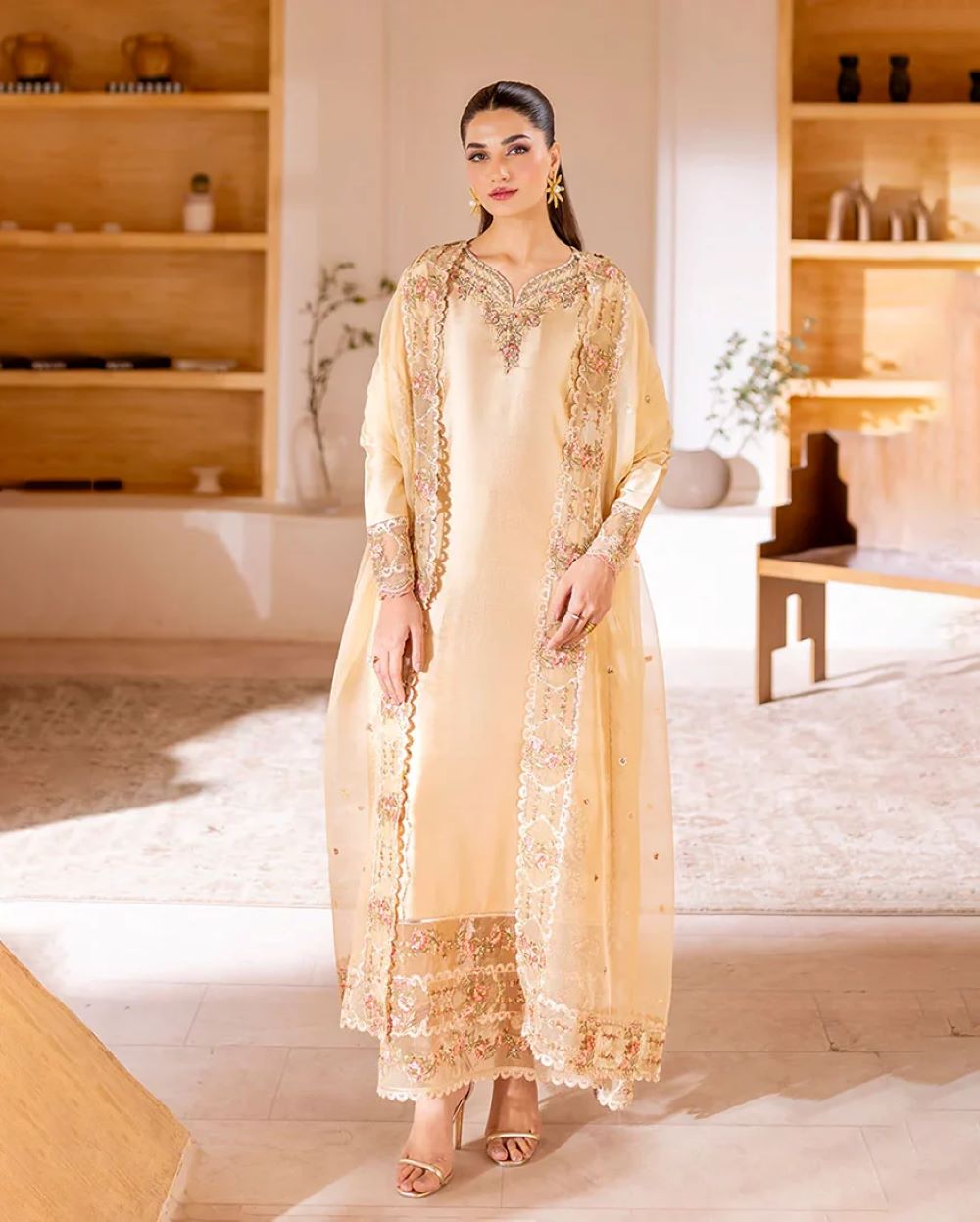 Auréa – A celebration of subtle grandeur. Draped in a radiant gold hue, Auréa features a lustrous sheesha silk shirt adorned with delicate hand ample pearl and sequin embellishments along the neckline, with soft, scattered accents that catch the light just right. It’s paired with tailored raw silk pants for a sleek silhouette. A dreamy rocket net dupatta completes the look – framed with embroidered organza borders on all four sides, adding just the right touch of timeless elegance.