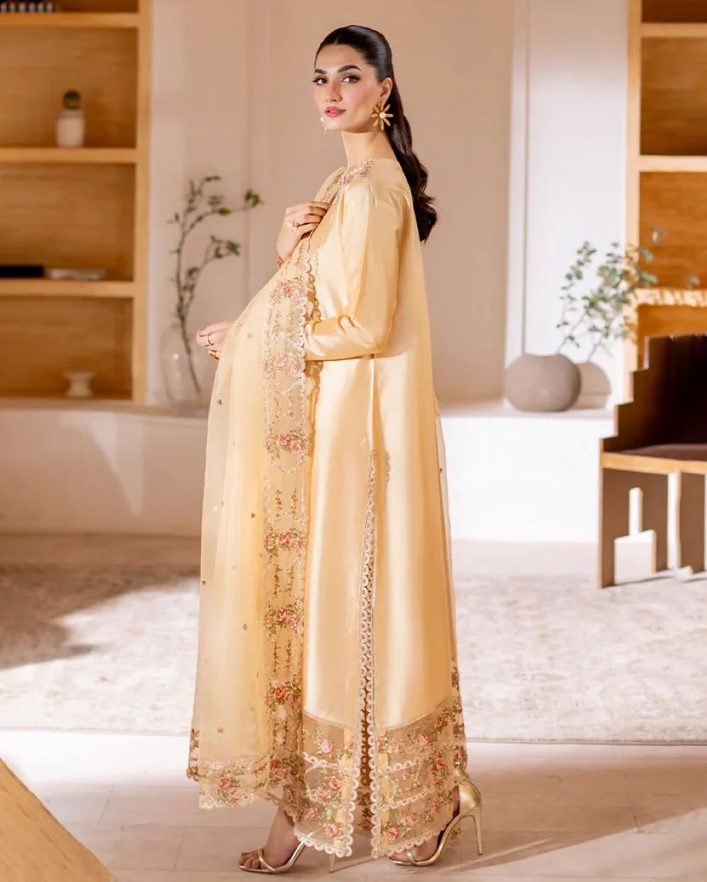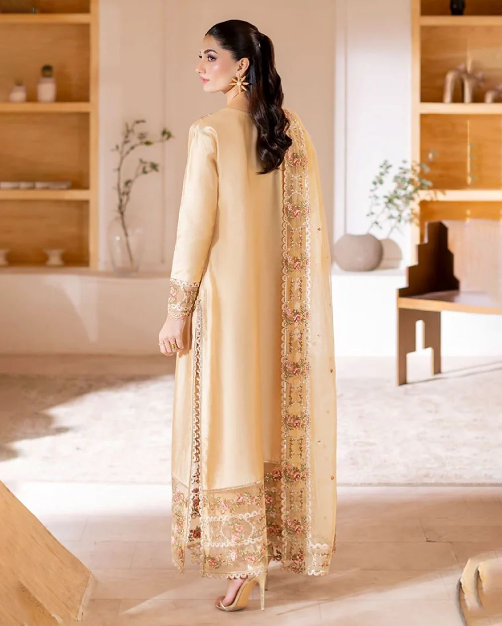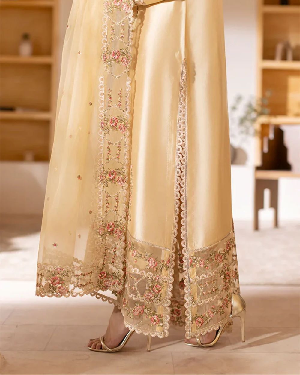 Auréa – A celebration of subtle grandeur. Draped in a radiant gold hue, Auréa features a lustrous sheesha silk shirt adorned with delicate hand ample pearl and sequin embellishments along the neckline, with soft, scattered accents that catch the light just right. It’s paired with tailored raw silk pants for a sleek silhouette. A dreamy rocket net dupatta completes the look – framed with embroidered organza borders on all four sides, adding just the right touch of timeless elegance.