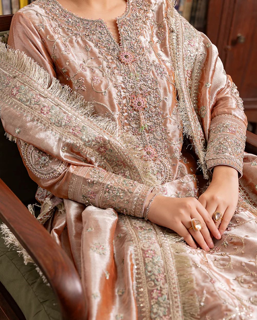 Dupatta: • Zari tissue dupatta featuring fringed edges and delicate floral motifs.