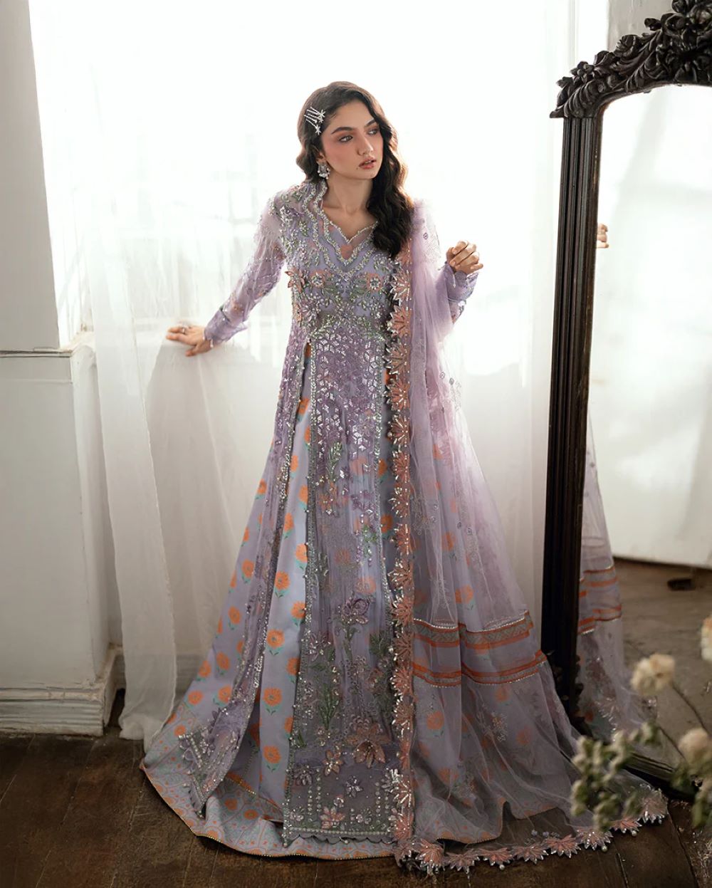 Finishing: • Hand made tassels for back neckline • Hand made tassels for front daman & sleeves • Golden samosi lace for finishing • Silver CD lace for finishing • Pearls for finishing