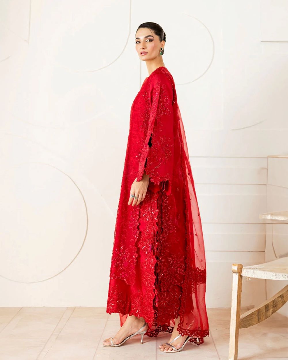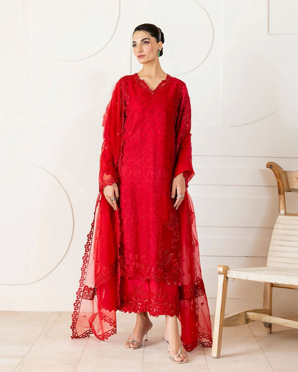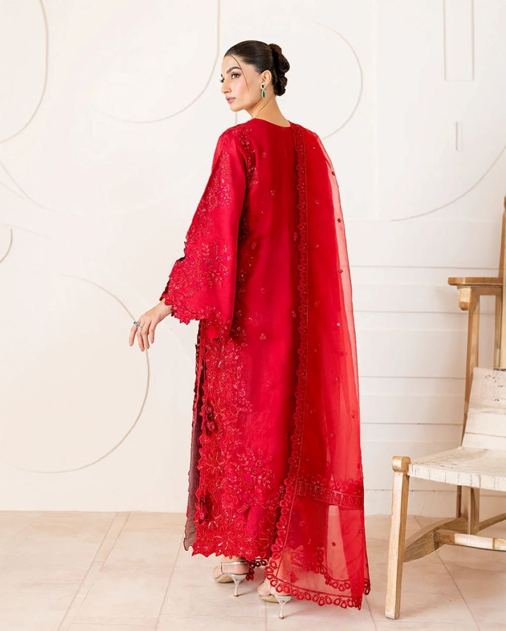 Rubea – Bold elegance, beautifully crafted. Draped in a striking red, Rubea features a mix organza shirt with intricate tonal embroidery and subtle hand ample sequin embellishments, layered over a soft China medium silk inner lining for comfort and sophistication. Finished with organza dupatta showcasing a delicately embroidered border, and paired with straight-cut raw silk trousers for a sleek and polished silhouette. A statement of grace and confidence.