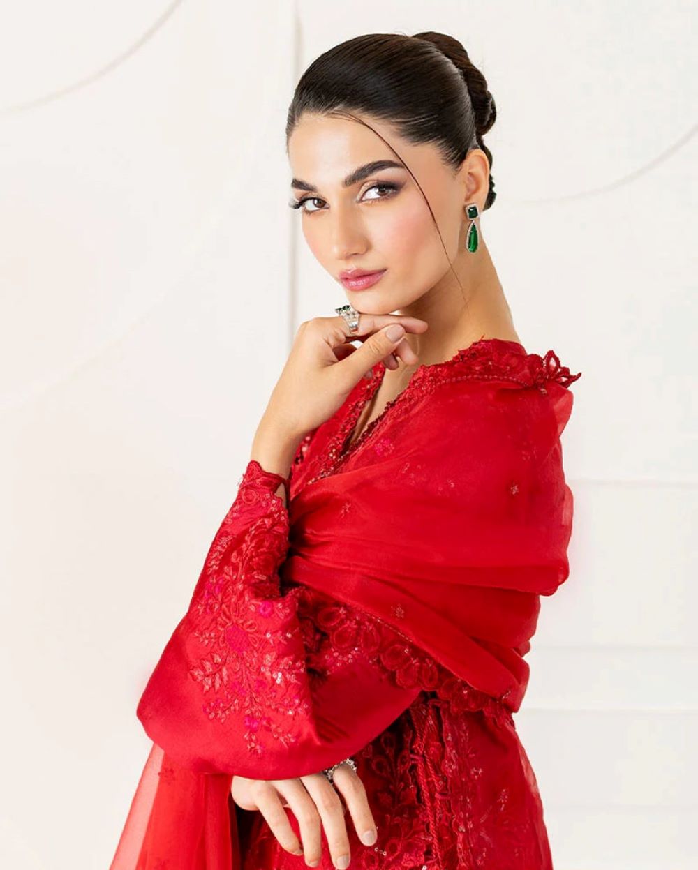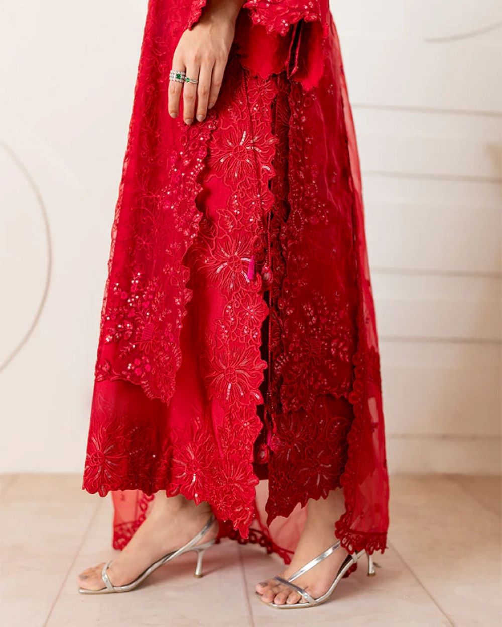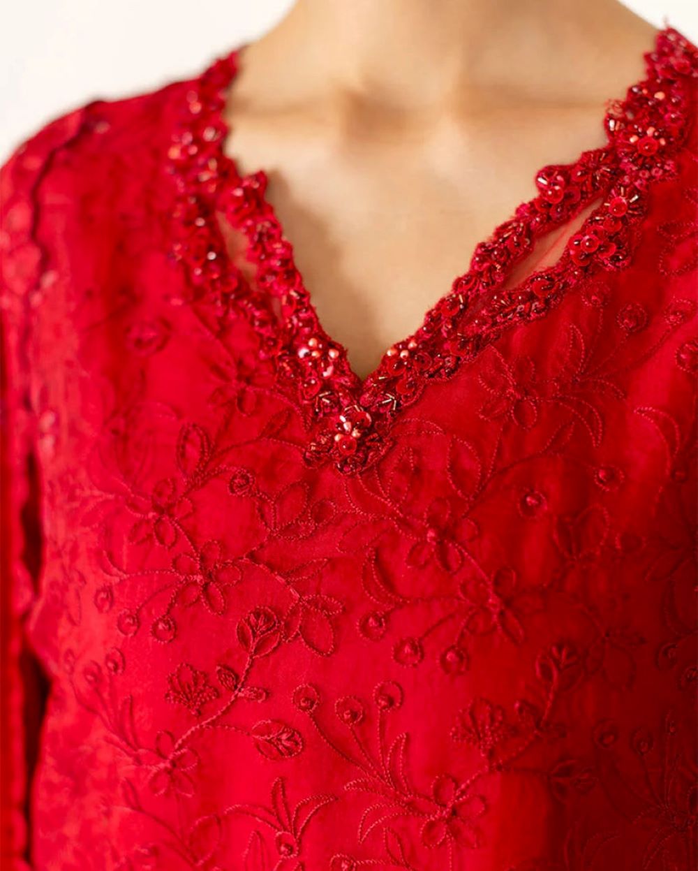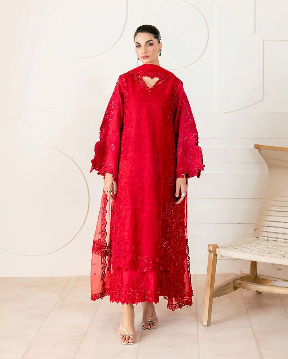 Rubea – Bold elegance, beautifully crafted. Draped in a striking red, Rubea features a mix organza shirt with intricate tonal embroidery and subtle hand ample sequin embellishments, layered over a soft China medium silk inner lining for comfort and sophistication. Finished with organza dupatta showcasing a delicately embroidered border, and paired with straight-cut raw silk trousers for a sleek and polished silhouette. A statement of grace and confidence.