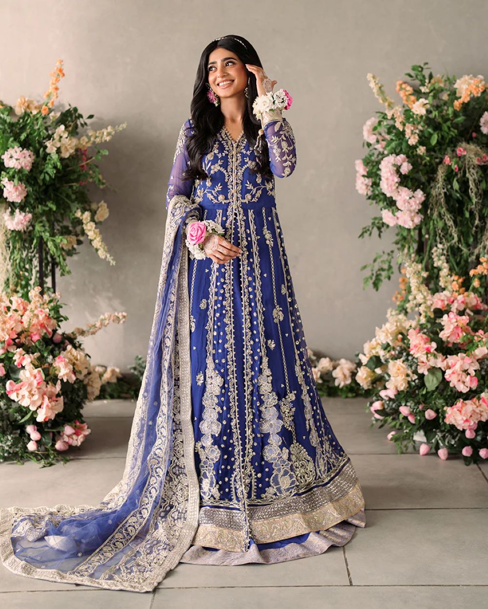 Sehar” an exquisite creation in a captivating shade of blue. Crafted from luxurious chiffon, this hand-embellished ensemble features intricate detailing that adds a touch of opulence to its refined silhouette. The delicate embellishments shimmer and create a mesmerizing effect that’s perfect for any special occasion. The look is complete with an embroidered and sequined net dupatta and silk trouser.