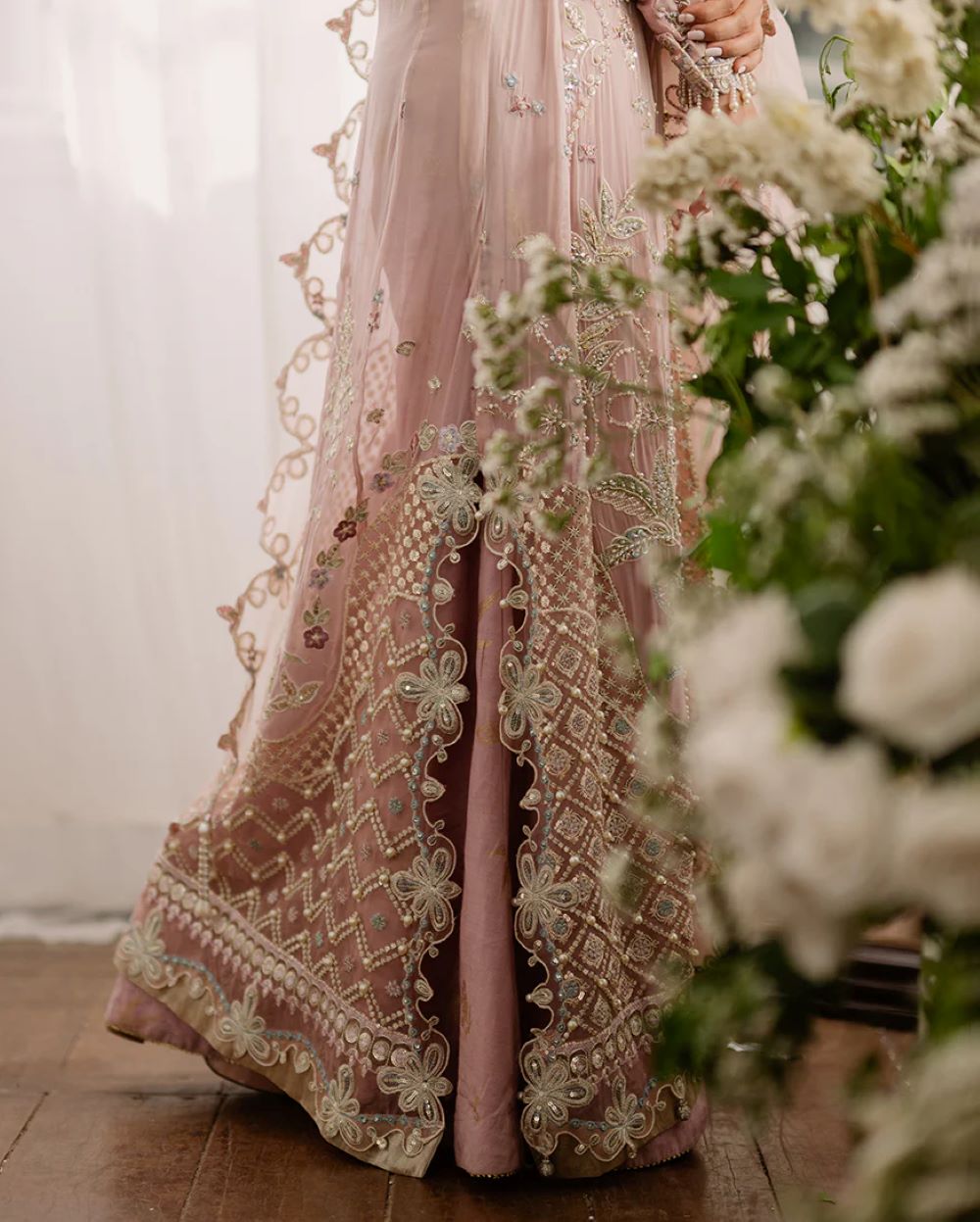 • Embroidered, sequinned pearl embellished front daman border (organza)