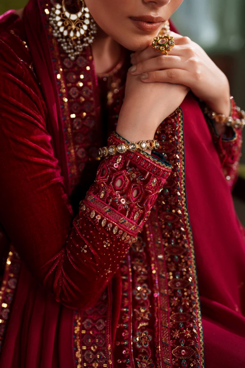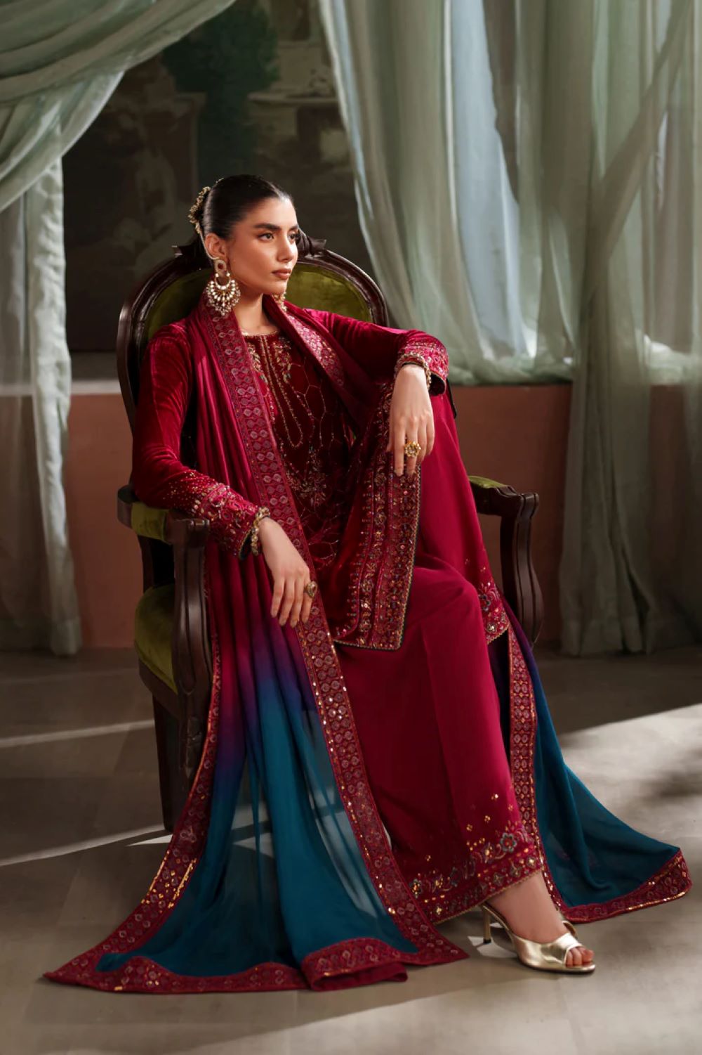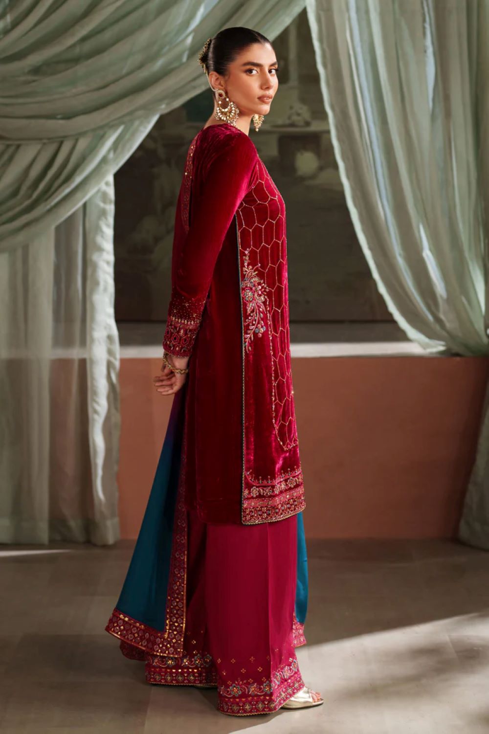 A striking 3-piece velvet outfit featuring heavy adda, embroidery, sequins, and cut-dana detailing on the neckline, center panel, sleeves, and borders. The pure velvet shirt is styled with a boat neckline and refined embellishment throughout. Paired with raw silk culotte trouser finished with embroidered borders. The tissue silk dupatta comes in a digital gradient print, completed with an embroidered organza border. A bold shocking-pink ensemble perfect for semi-formal winter occasions.