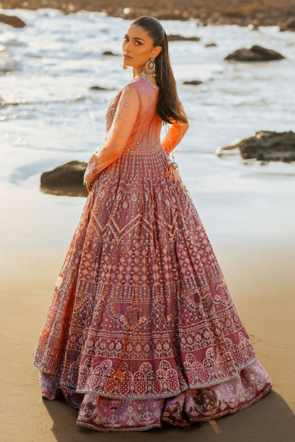 This opulent layered frock is adorned with a round neckline. The bodice & sleeves are adorned with composed motifs & hand adda embellishments all over, along with handmade hangings, crystals & stone work along with embroidery textures & sequin work. The back is adorned with mini hand-embellished motif spray & heavy handmade tassels. The voluminous frock is finely composed with motifs & texture play inspired by the roots of Mughal motifs, Islamic architecture & geometrical patterns. Each panel is adorned with heavy embroidery and sequin work, finished with lavish borders & minimal lace. The second layer is adorned with embroidered & sequin detailed border that adds more volume to the outfit. The dupatta is adorned with embroidered motif spray all over & finished with a 4-sided embroidered & sequin detailed border. The outfit comes with plain straight pants.