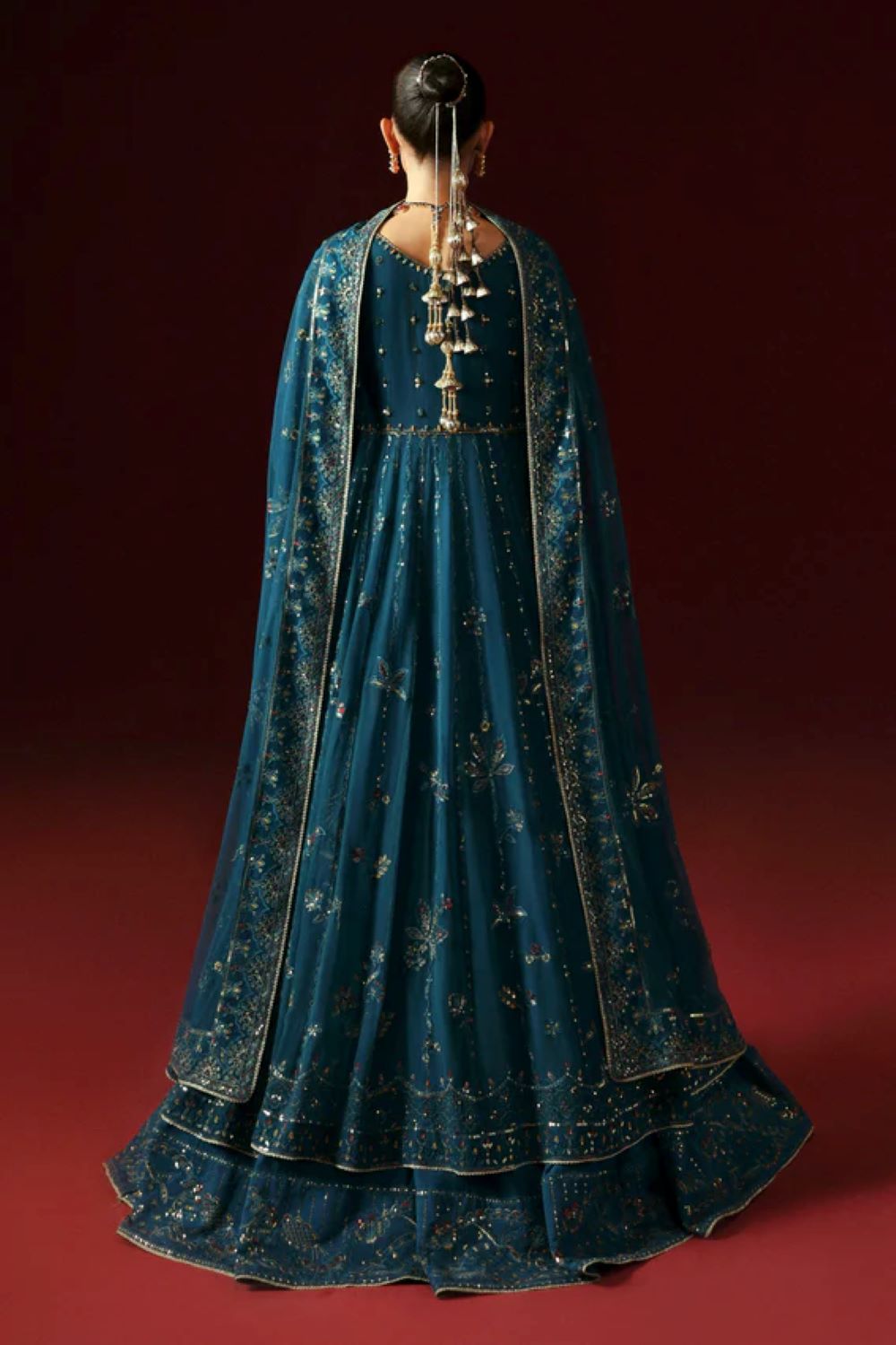 The gown flares beautifully into a full pishwas style panelled design, flowing down to the hem with intricate adda and tilla work, complemented by tassels and fine laces. The panels are precisely crafted to add volume and structure, giving the outfit a regal presence. The dupatta is delicately bordered with an elegant lace on all four sides and finished with a finely embroidered border, enhancing the overall luxury of the outfit. Ideal for festive events, weddings, or special occasions, this gown offers a perfect fusion of modern sophistication and traditional craftsmanship.