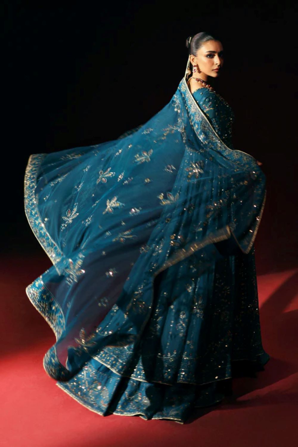 This stunning ensemble is a beautifully handcrafted gown designed with timeless elegance and intricate detailing. The gown features a broad neckline with a modest depth, creating a graceful yet sophisticated silhouette. The body of the dress is richly adorned with delicate embroidery and sequins, blending shimmer with tradition. The sleeves are full-length and equally embellished, offering a perfect balance of charm and coverage.
