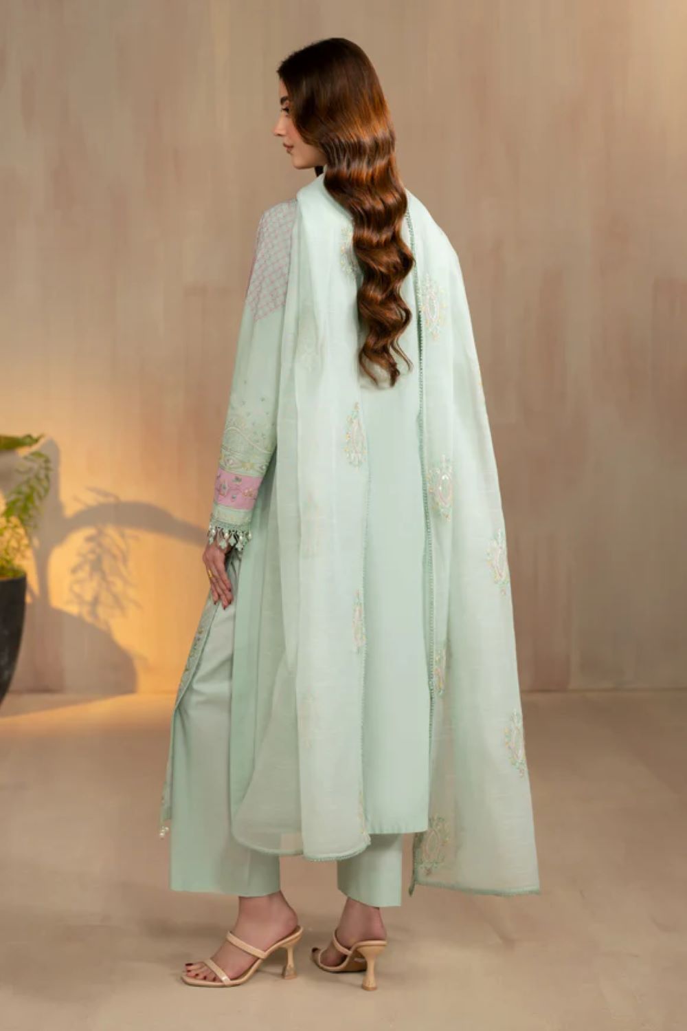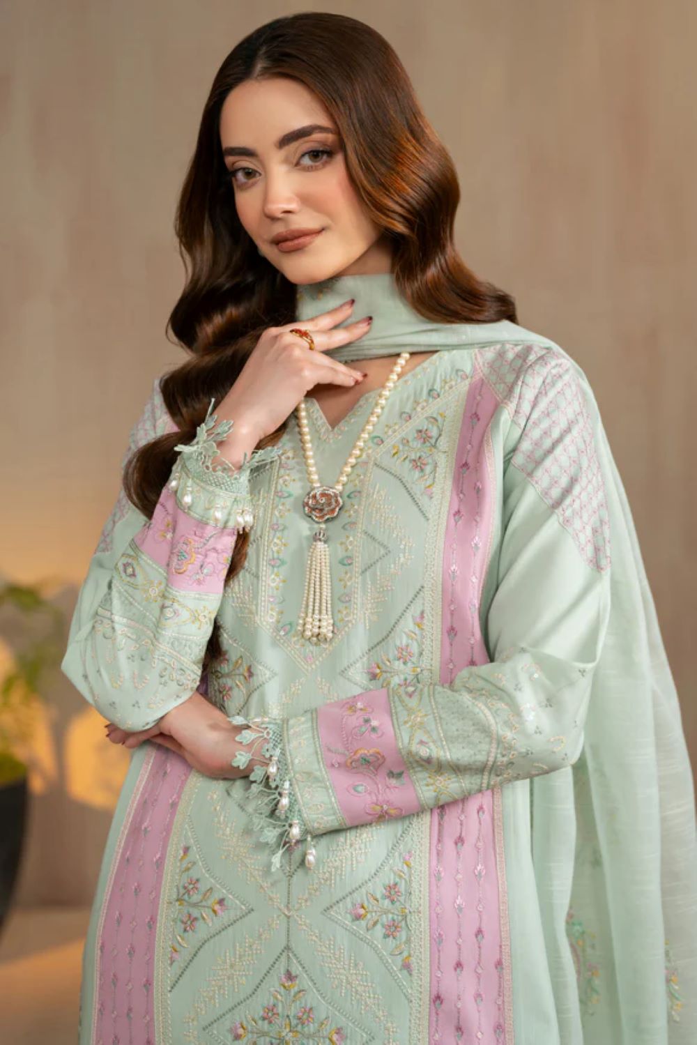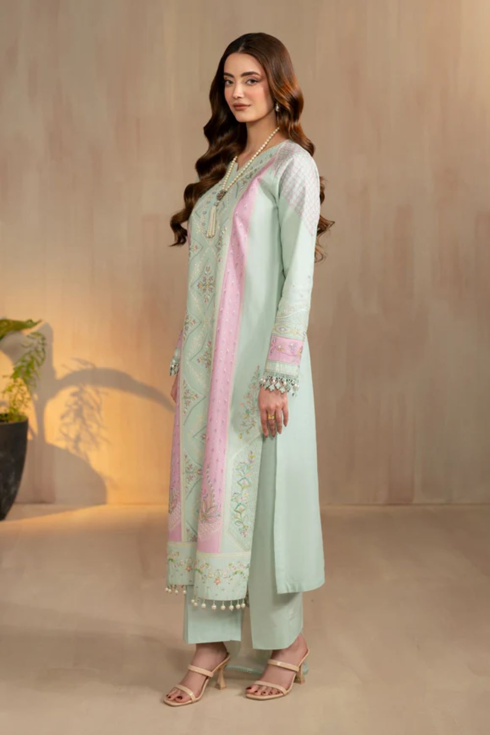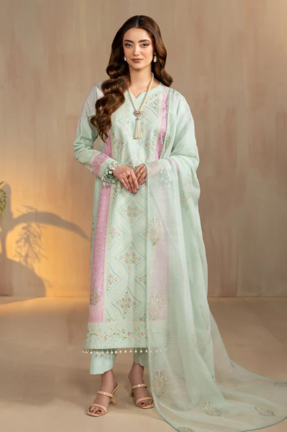 Tazila is a soft summer outfit created with a calm and refreshing appearance. The base shade is light green, which gives a cool and airy feeling suitable for gatherings and small occasions. The color keeps the overall look gentle and neat. The shirt is made in lawn fabric, so it feels light and breathable in warm weather. The shirt is long and straight, giving a modest and balanced silhouette. The front area carries fine white thread embroidery placed in repeated patterns from the neckline down to the hem. Because the embroidery is arranged carefully, the design looks tidy and complete rather than heavy.