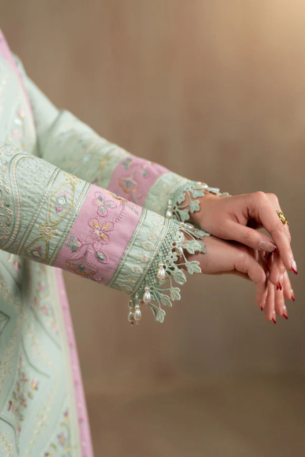 The neckline has delicate embroidered detailing that softly highlights the upper portion of the outfit. On both sides of the shirt, soft color panels are added. These panels introduce mild contrast and give shape to the design while still keeping a simple and elegant appearance. The sleeves are fitted and finished with embroidered borders. This keeps the outfit coordinated and visually connected from top to bottom. The hemline also includes an embroidered border which completes the shirt and gives it a properly dressed look for small gatherings.
