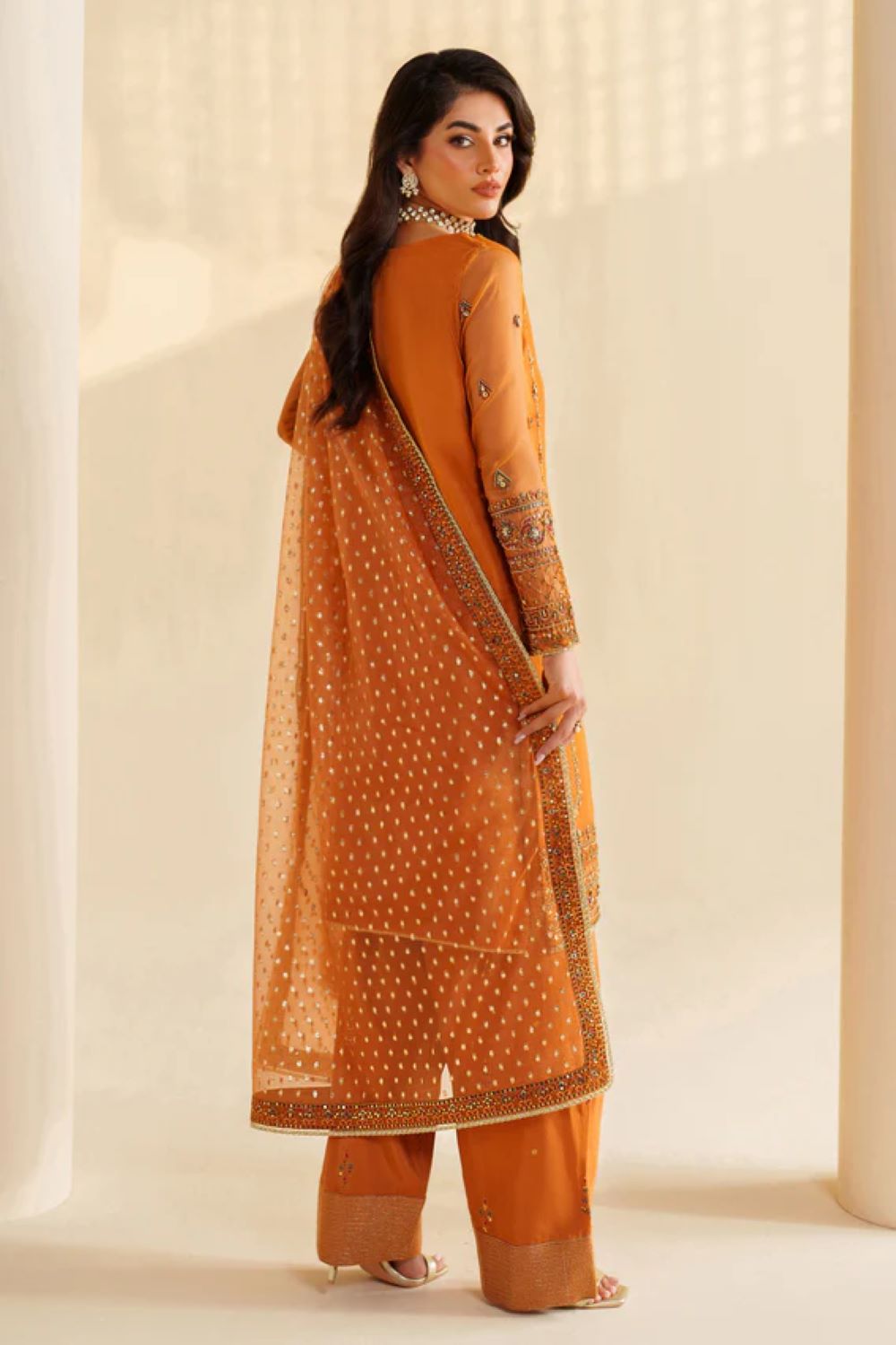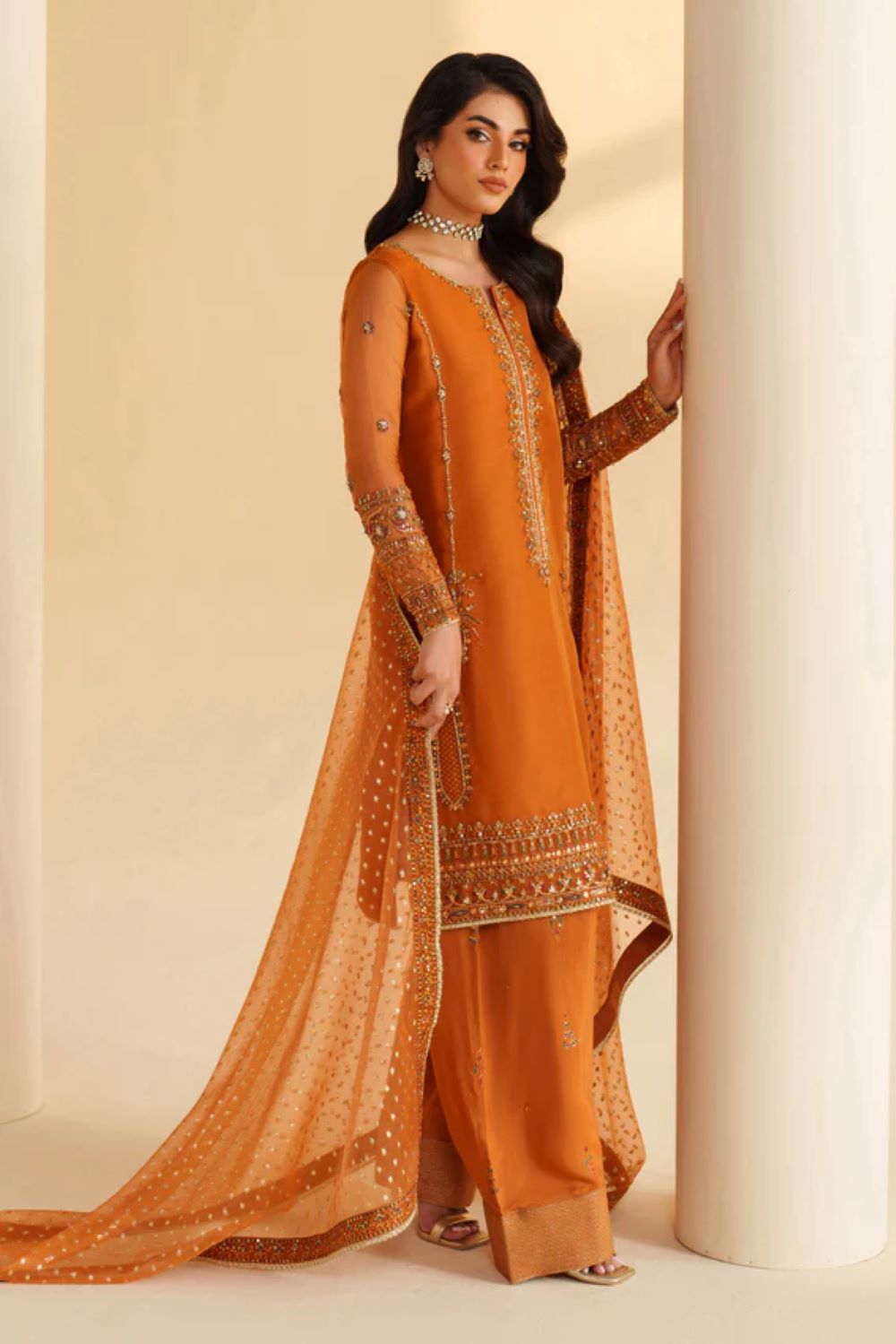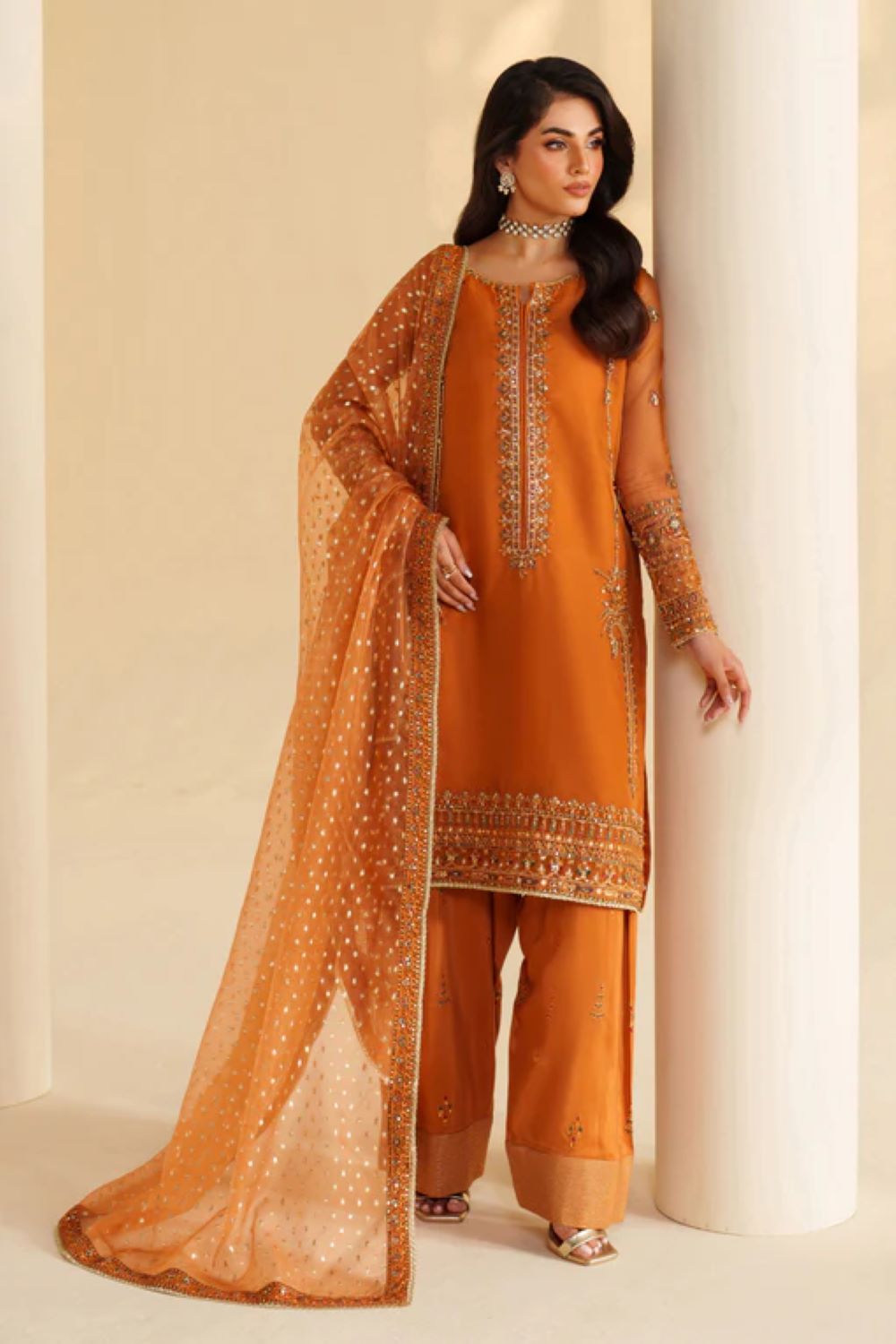 Yameen is a semi-formal rust-orange outfit crafted from premium organza. The shirt features intricate adda and sequin embroidery with tilla detailing and center piping for a refined finish. It is paired with a PK raw silk shalwar showcasing matching embroidery and a zari organza dupatta with four-sided embroidered borders for a complete elegant look.
