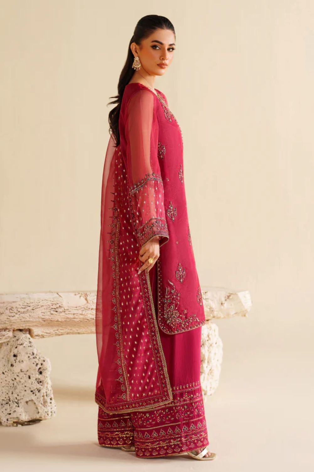 Yashal is a semi-formal masterpiece in a striking shocking-pink hue, crafted from luxurious organza. The shirt features adda and sequin embroidery with detailed borders and fine trims, paired with a chic culotte trouser in PK raw silk. The organza dupatta, adorned with embroidered borders and sequin detailing, completes the look with refined elegance — perfect for festive and formal events.