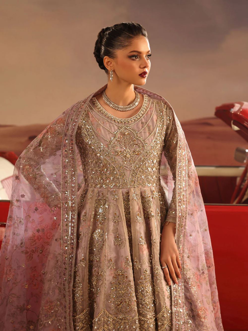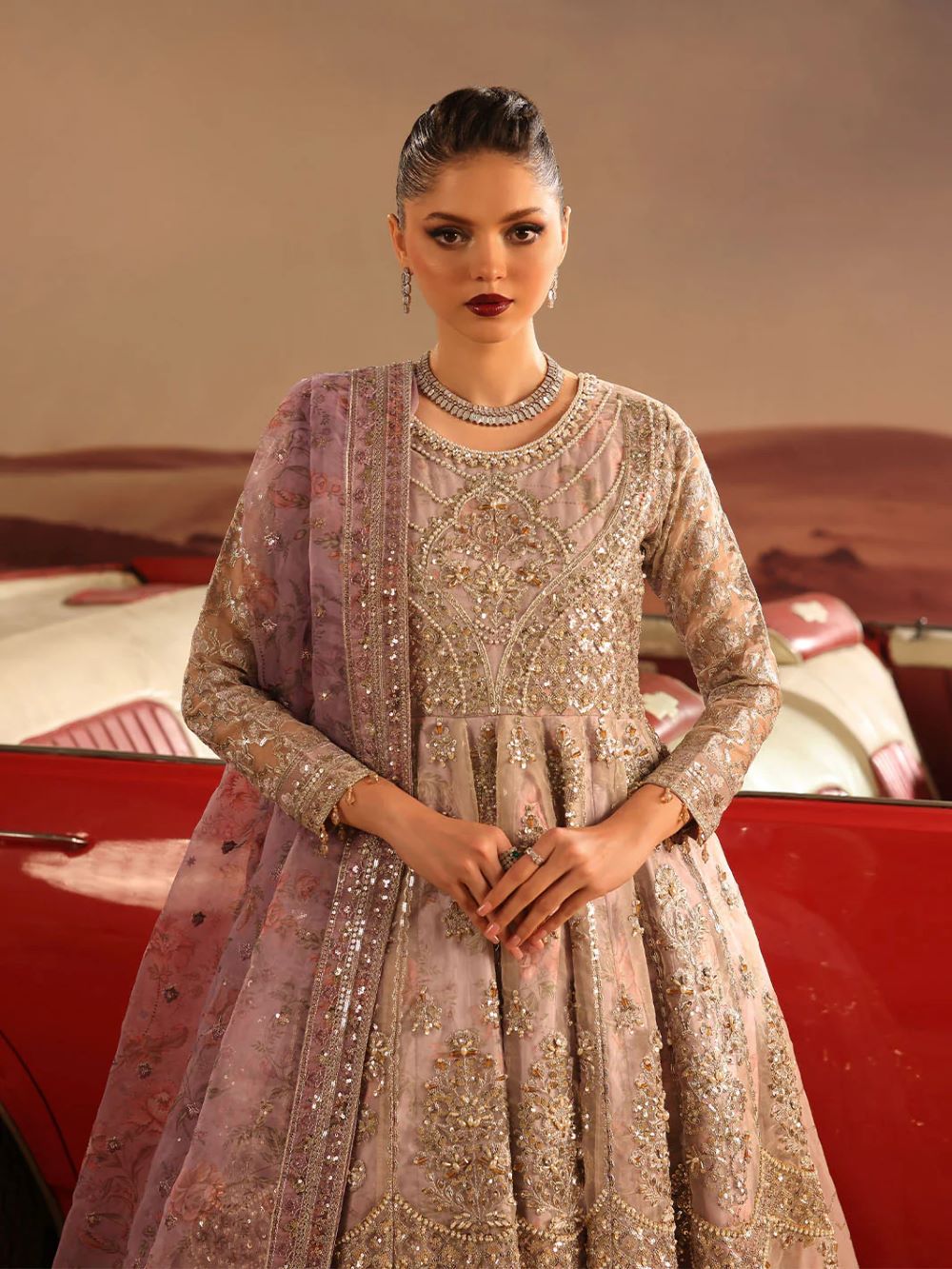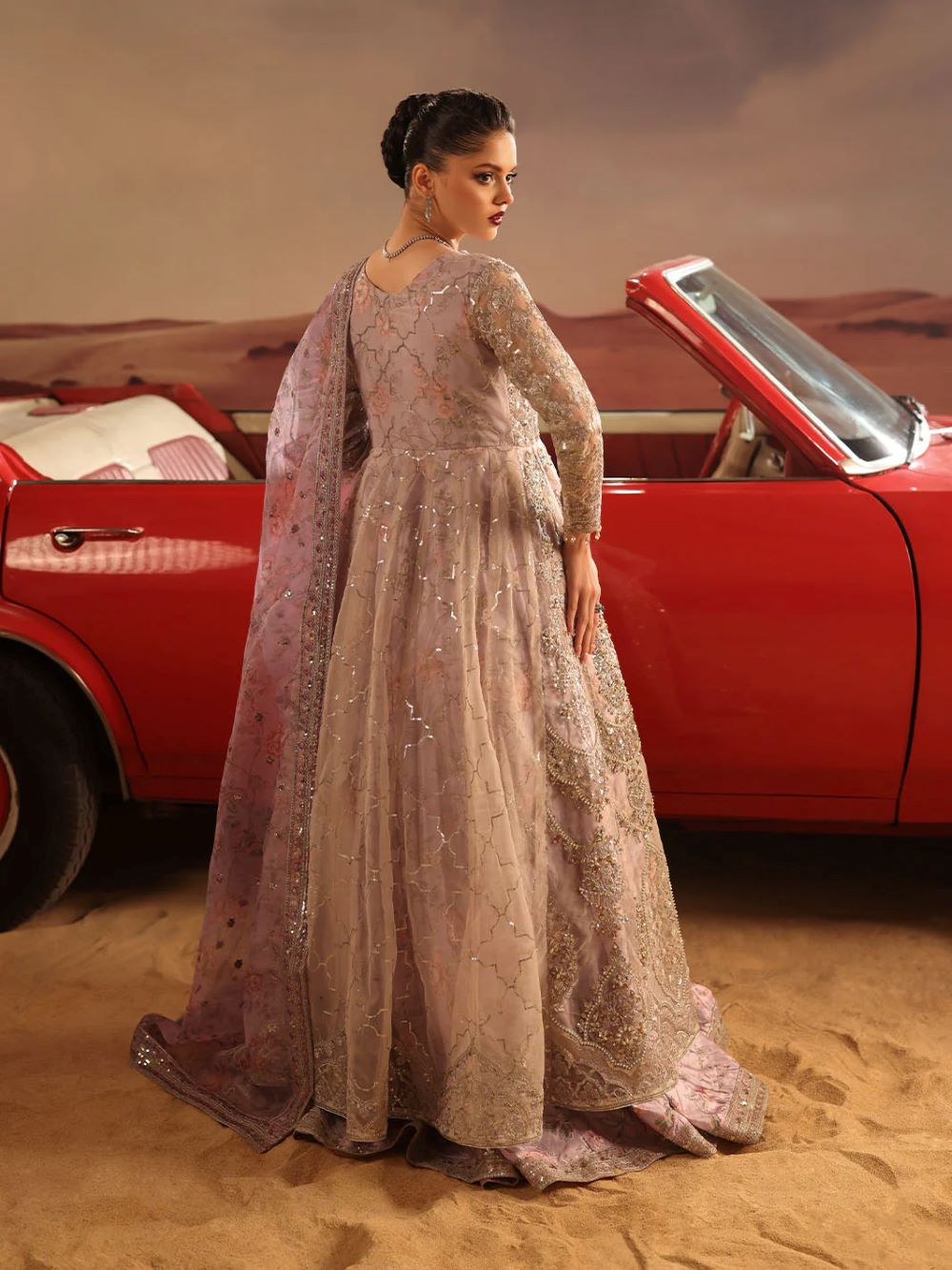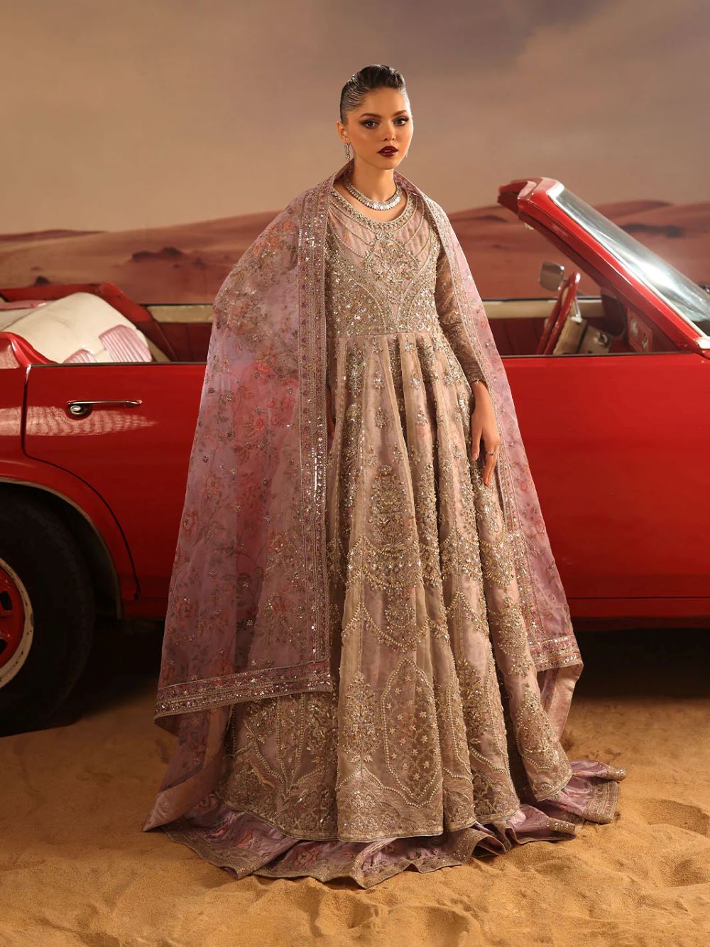 A master piece by LINA BY SHAHJAHAN introduced three piece out fit This image captures a striking fusion of traditional south Asian high fashion and cinematic,desert inspired aesthetic.