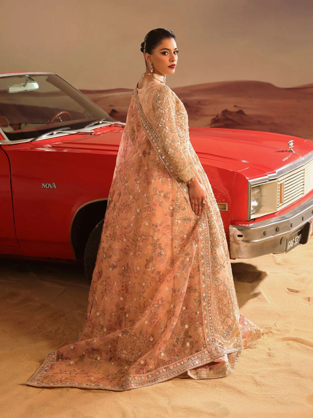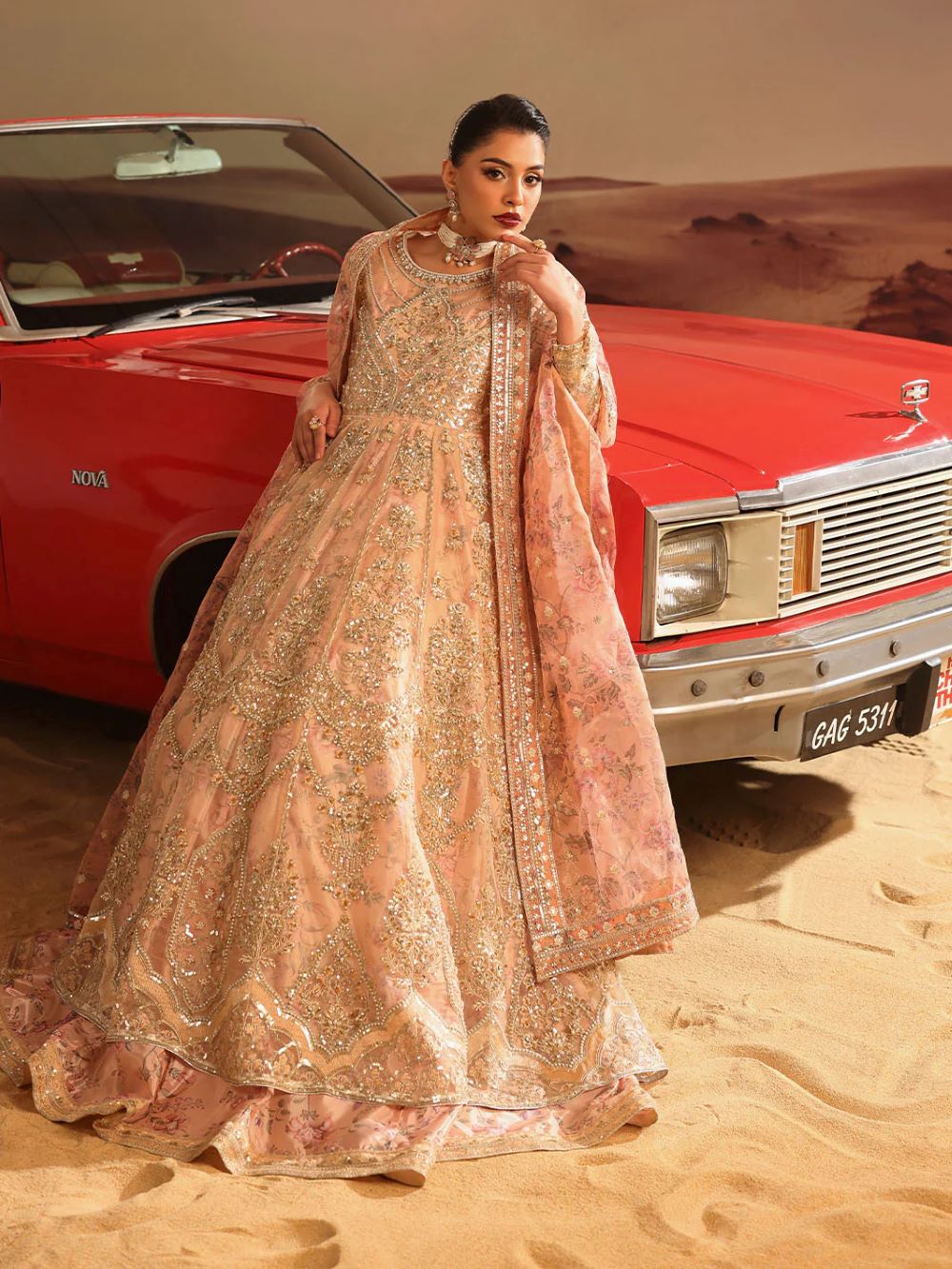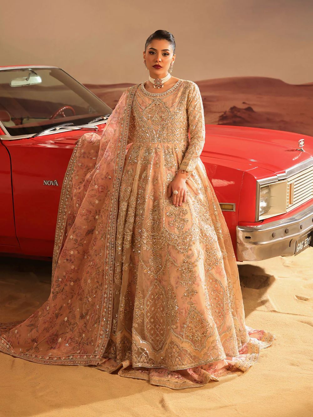 master piece by LINA BY SHAHJAHAN introduced three piece out fit This image captures a striking fusion of traditional south Asian high fashion and cinematic,desert inspired aesthetic.