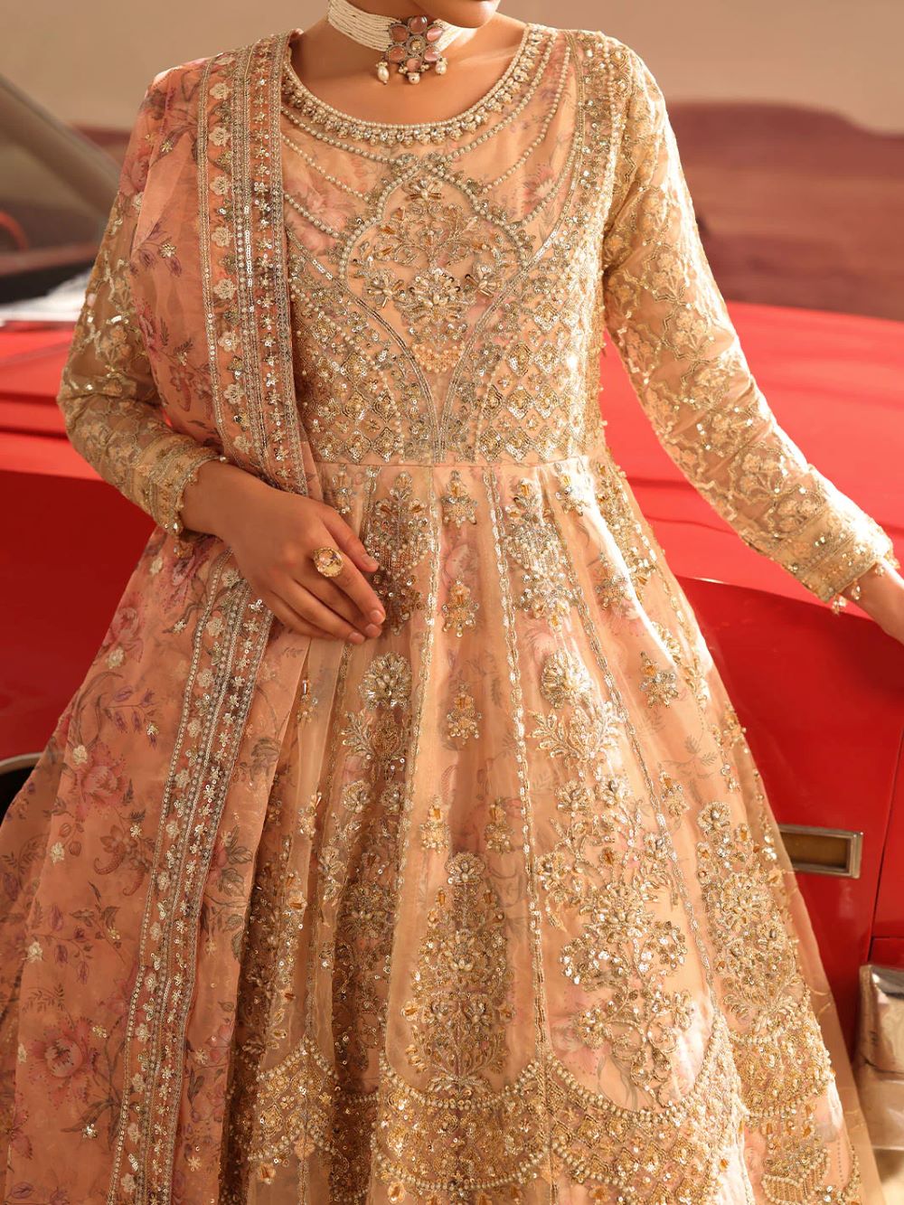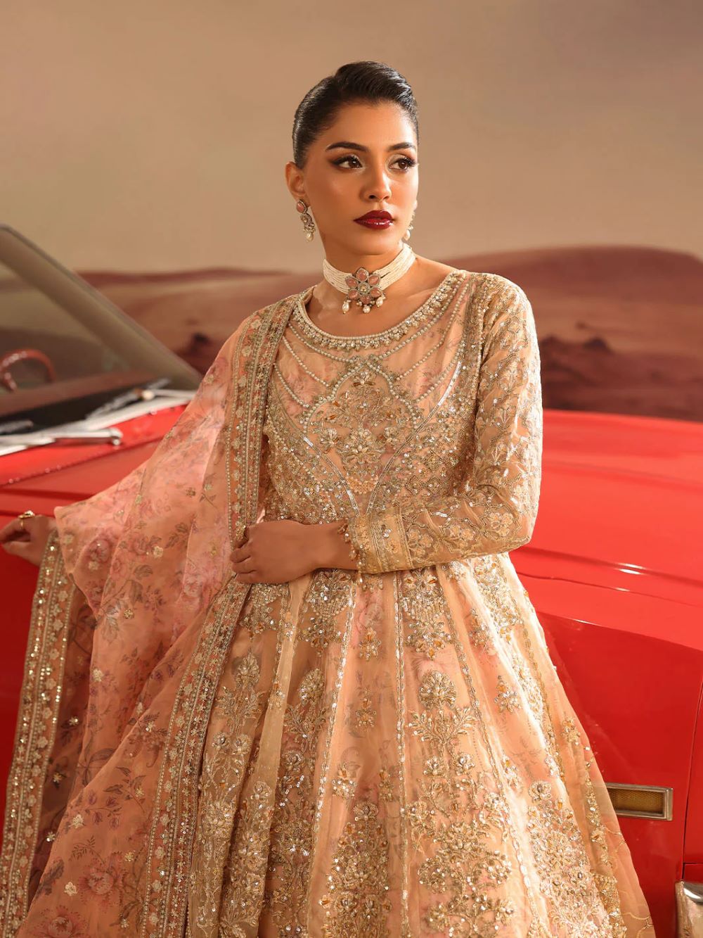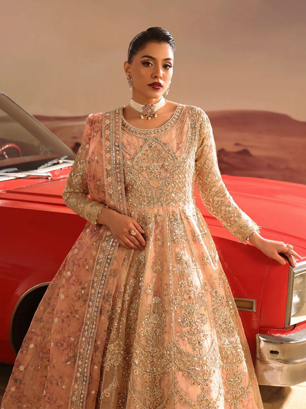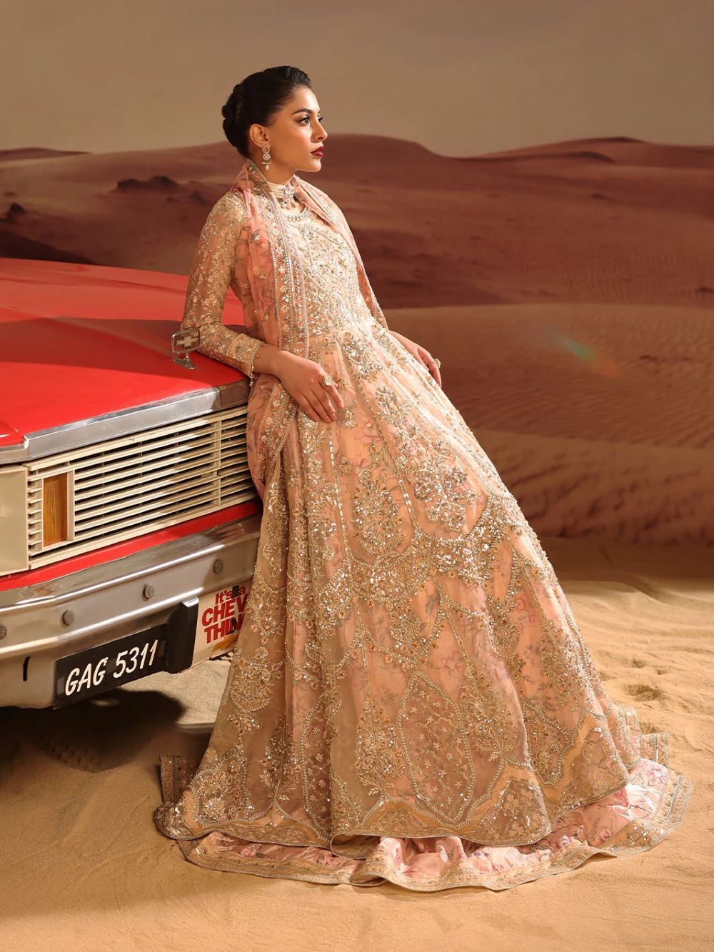 master piece by LINA BY SHAHJAHAN introduced three piece out fit This image captures a striking fusion of traditional south Asian high fashion and cinematic,desert inspired aesthetic.