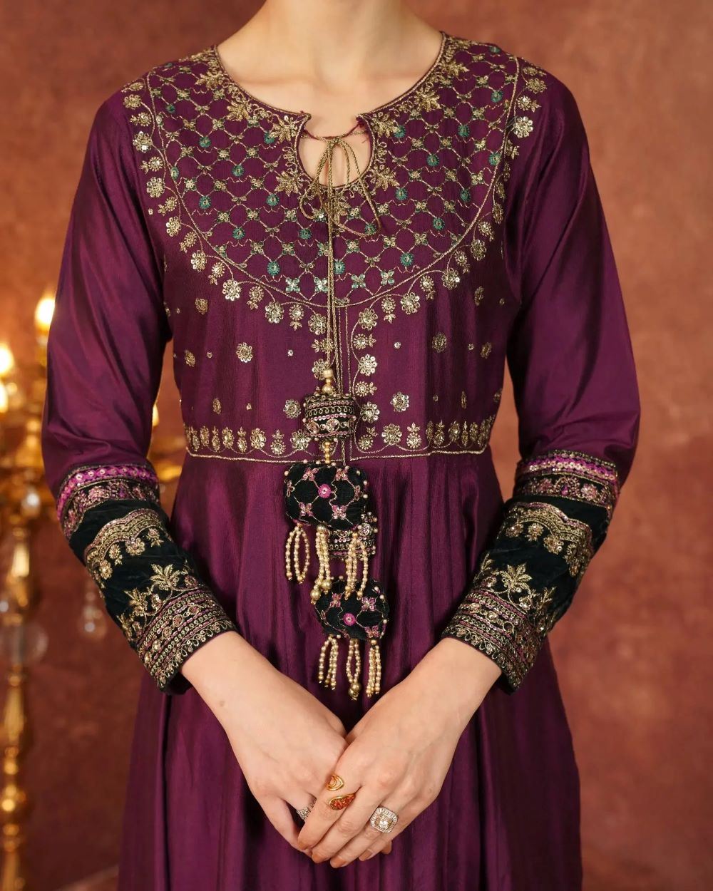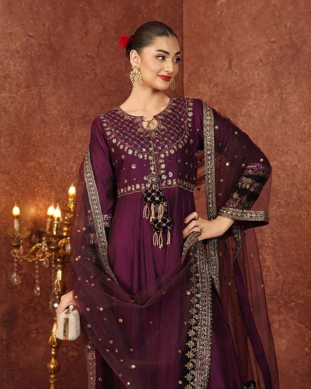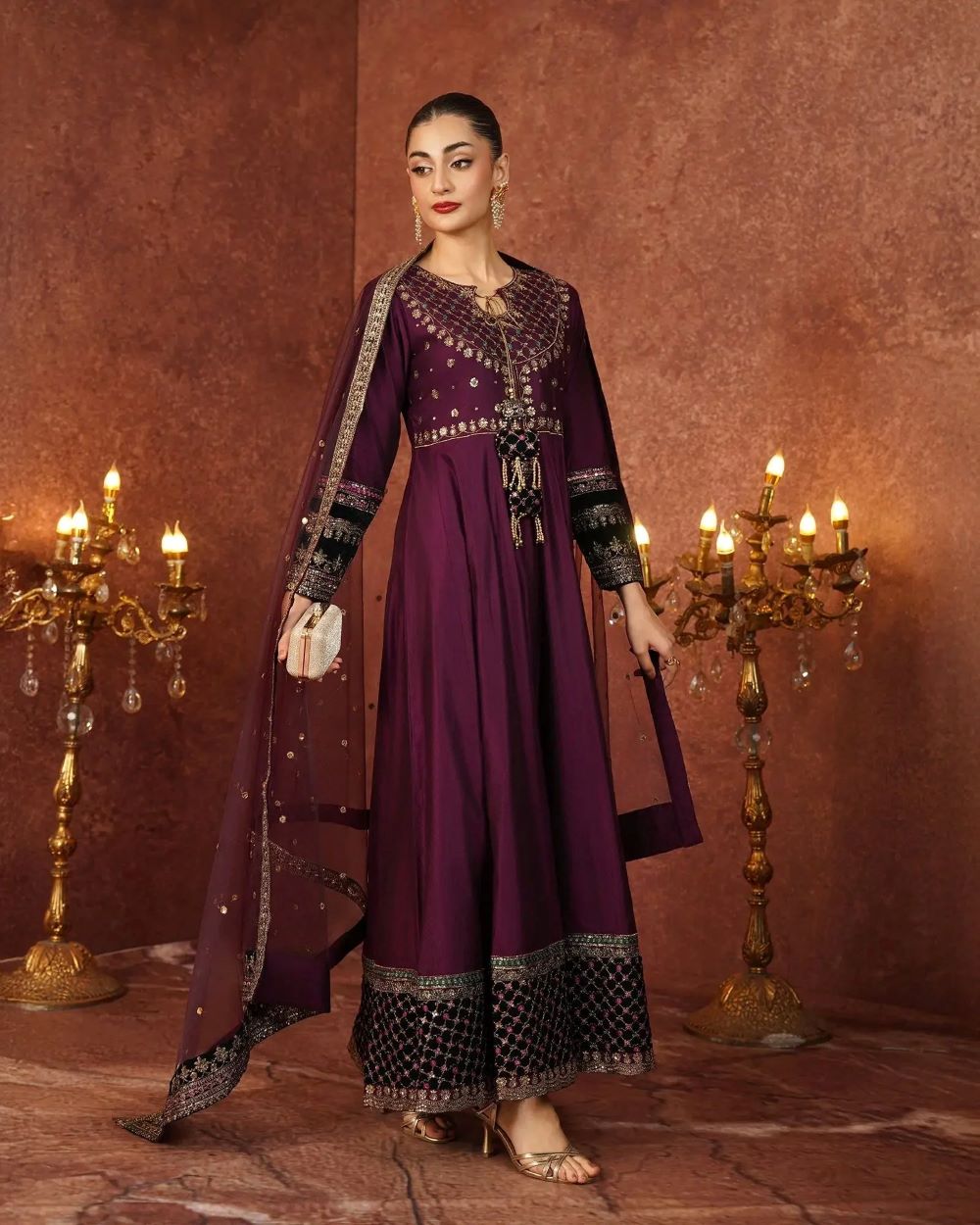 A perfect blend of tradition and modern finesse, this chambray katan 3-piece boasts a long frock with a yoke and keyhole neckline with tassel detailing and beautifully detailed sleeves. The embellished border, enhanced with tilla, sequins, lace, and velvet appliqué, brings a touch of luxe artistry. With tailored trousers and a bordered dupatta, this ensemble makes an unforgettable impression.