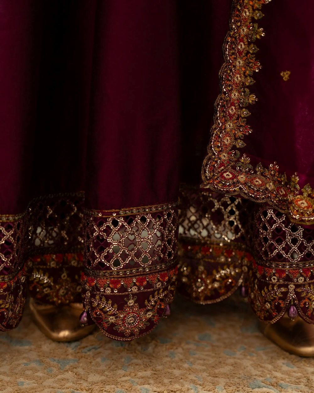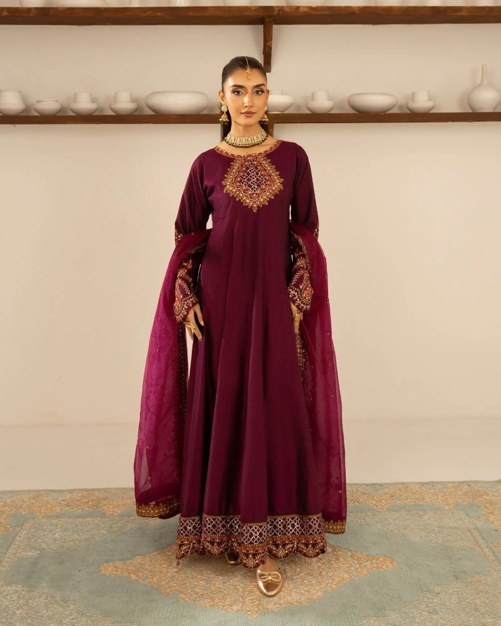 Where tradition meets modern finesse, this chambray katan 3-piece features a long maxi style with a sleek boat neckline, refined sleeve details, and finger hooks. The lavishly embellished border—highlighted with tilla, sequins, beads, and lace—adds opulent appeal. Paired with trousers and a bordered dupatta, this look is effortlessly regal.