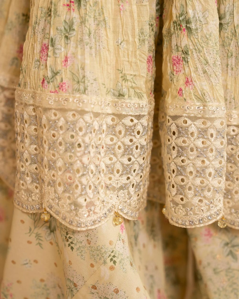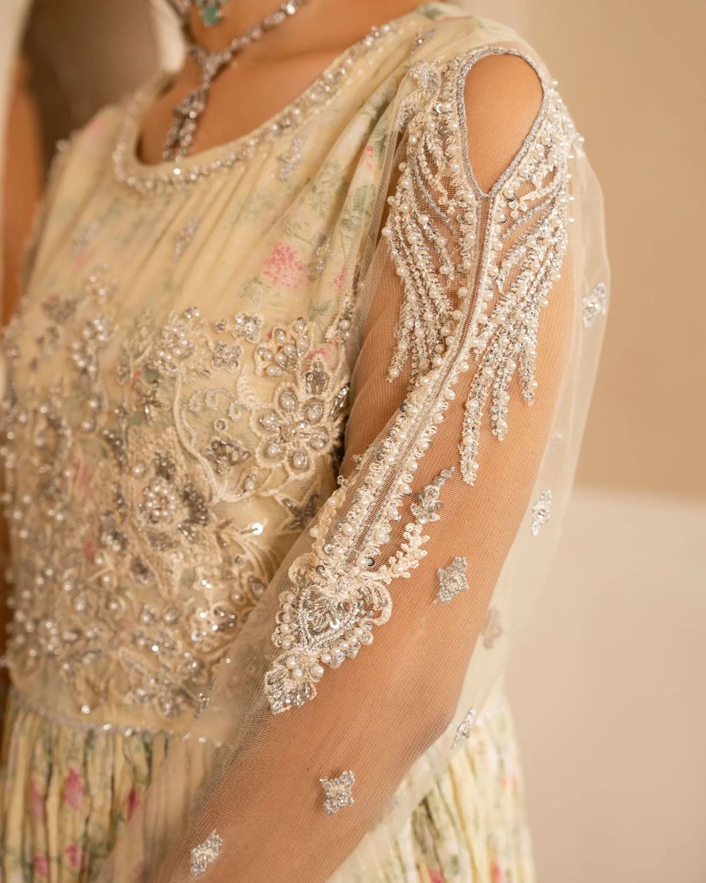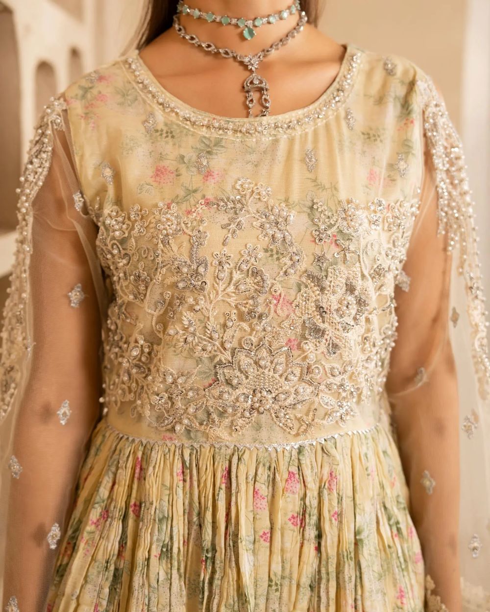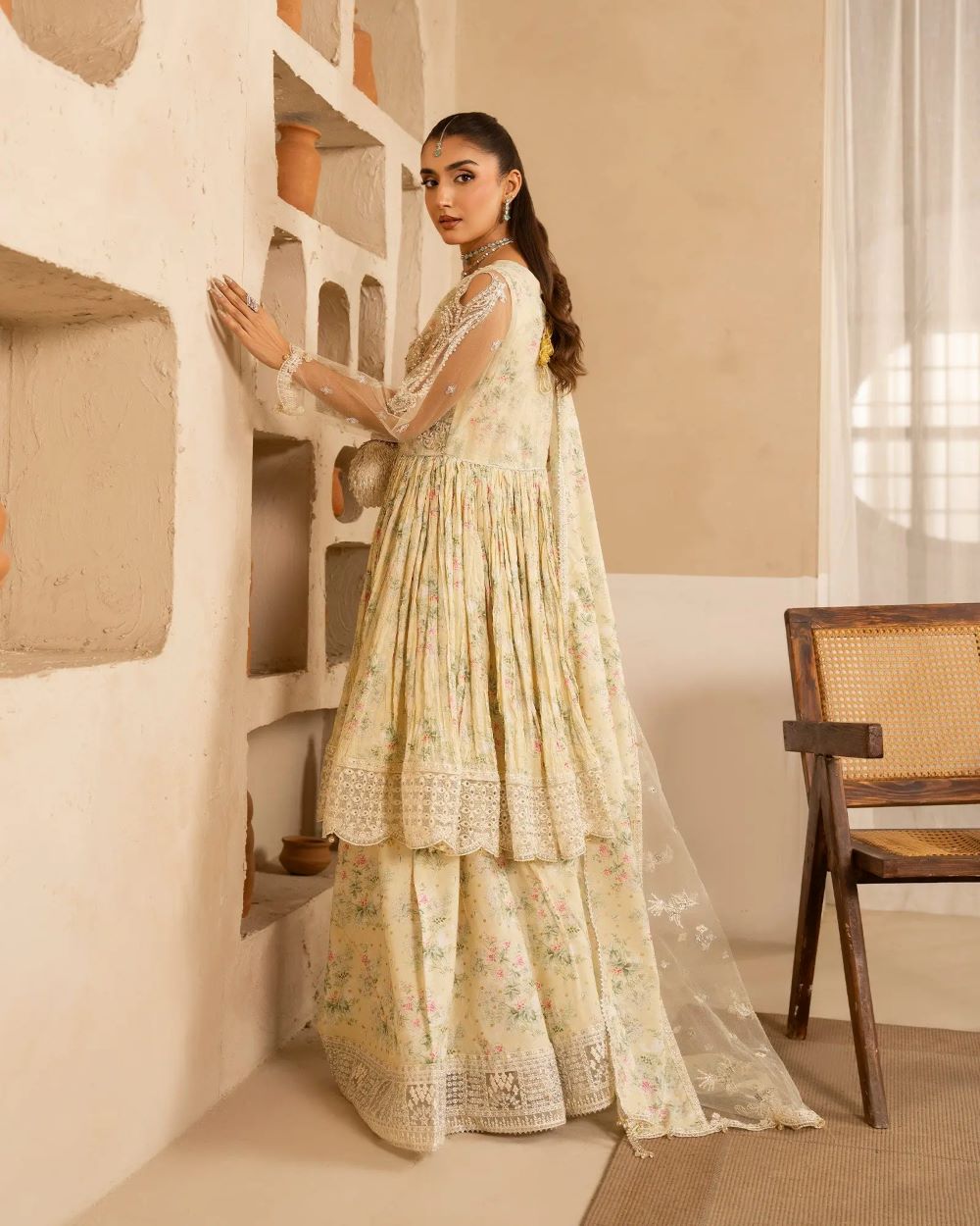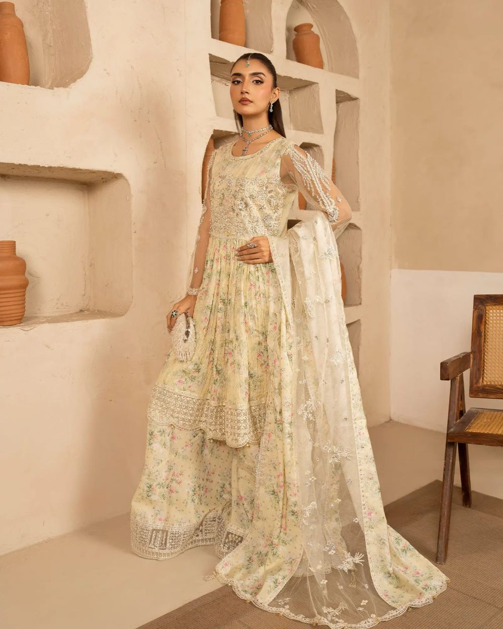 Exuding timeless elegance, this modern-meets-traditional net frock-style 3-piece is designed to leave a lasting impression. The printed base flared frock features a graceful boat neckline, detailed sleeves with a keyhole design, and an exquisitely embellished border and yoke adorned with tilla, sequins, beads, lace, organza appliqué, and intricate cutwork and handwork detailing. Paired with a tailored sharara and a bordered dupatta, this ensemble defines pure regal charm.
