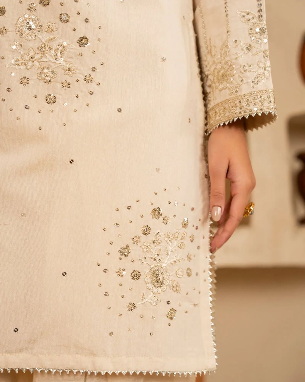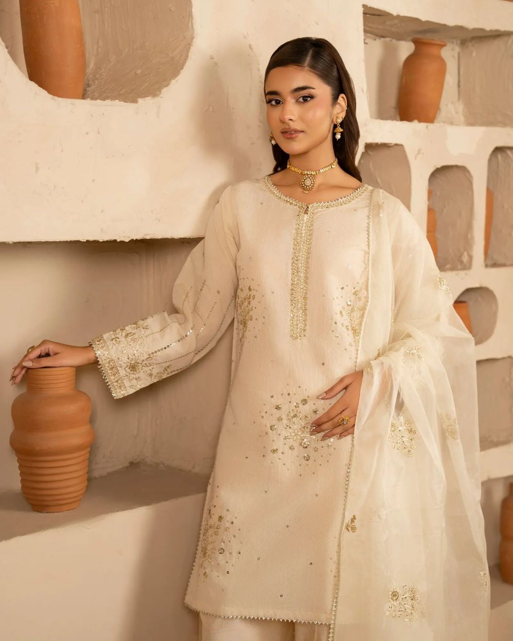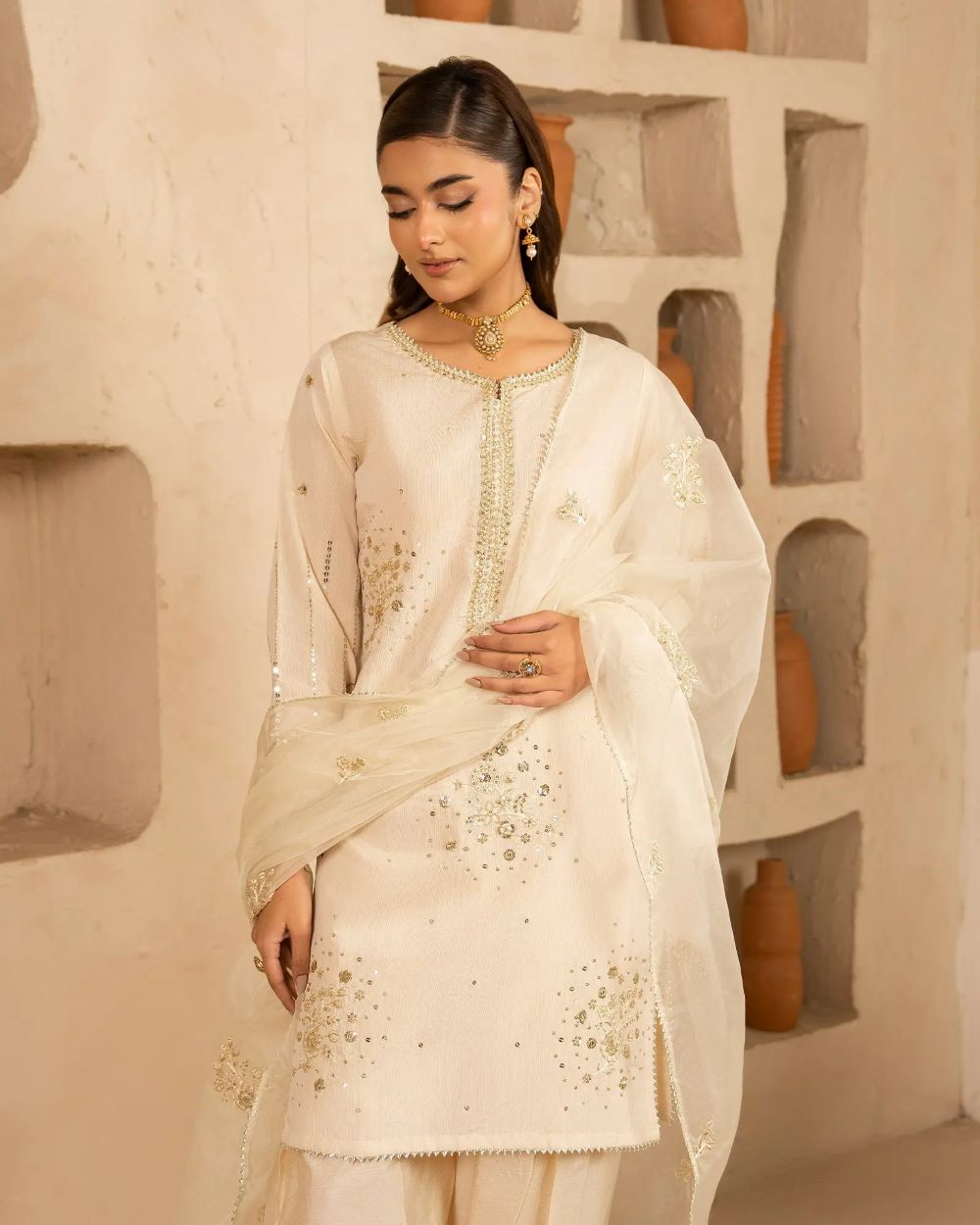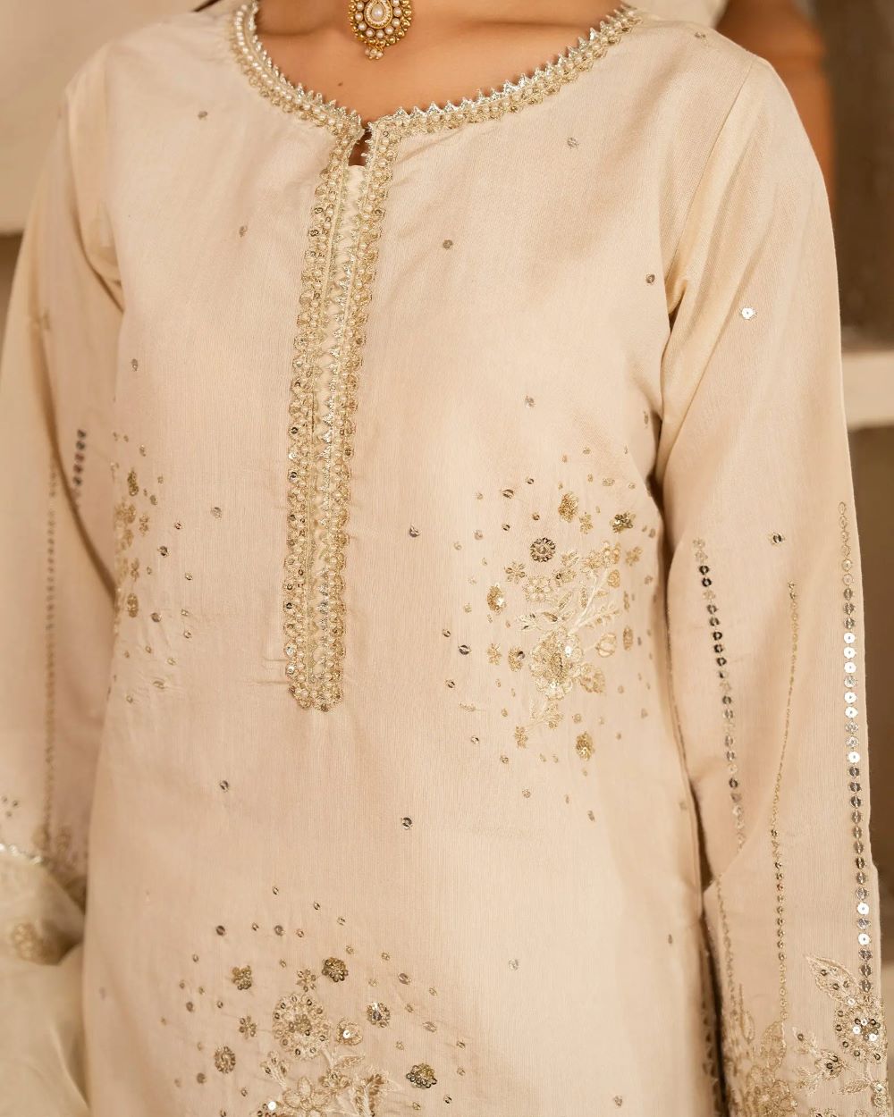 A regal fusion of tradition and trend, this plain paper katan 3-piece with embellished motif detailing, elegant sleeves, a bordered dupatta, and trendy farshi shalwar is crafted to make every occasion an unforgettable day or night.