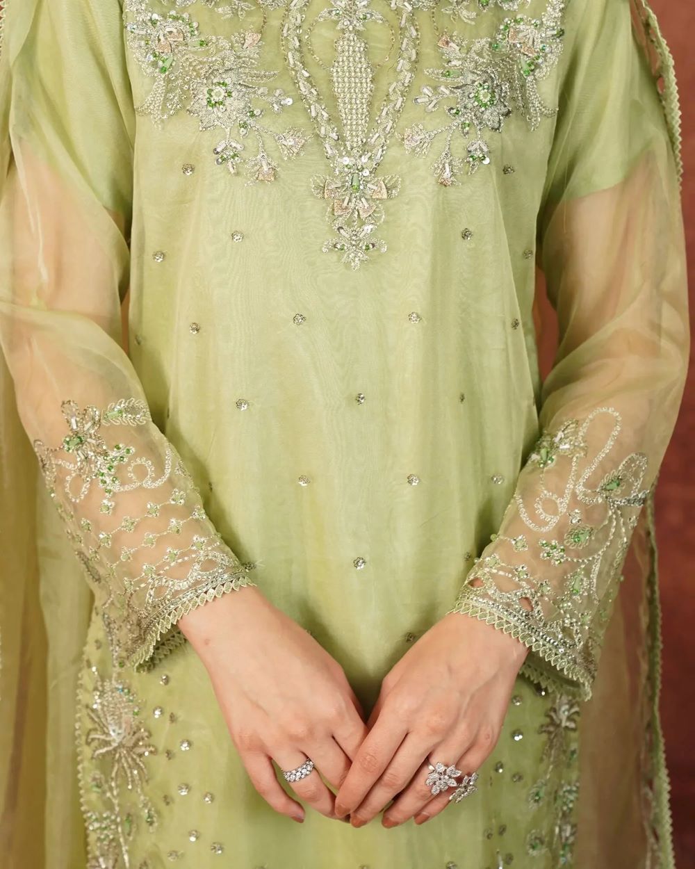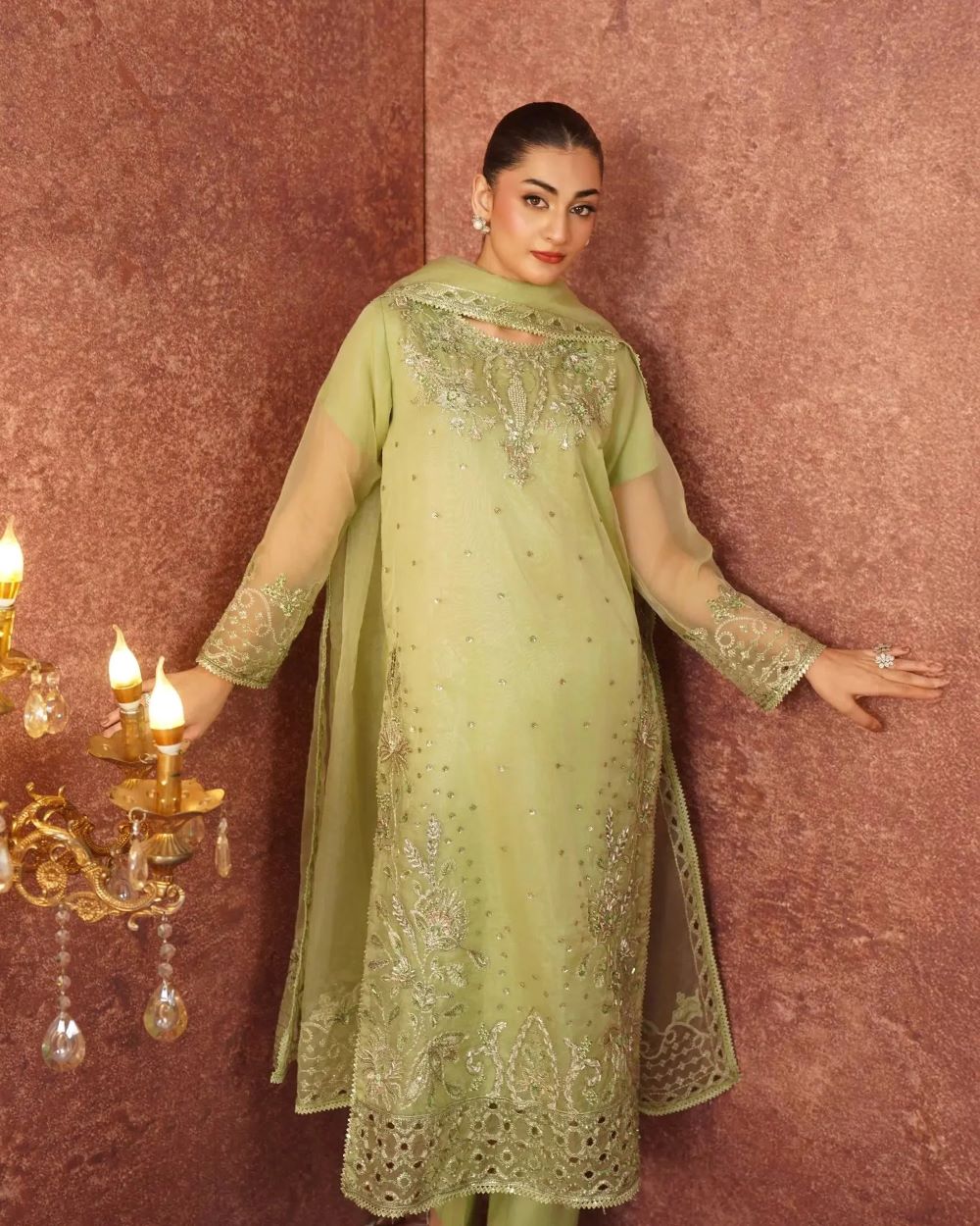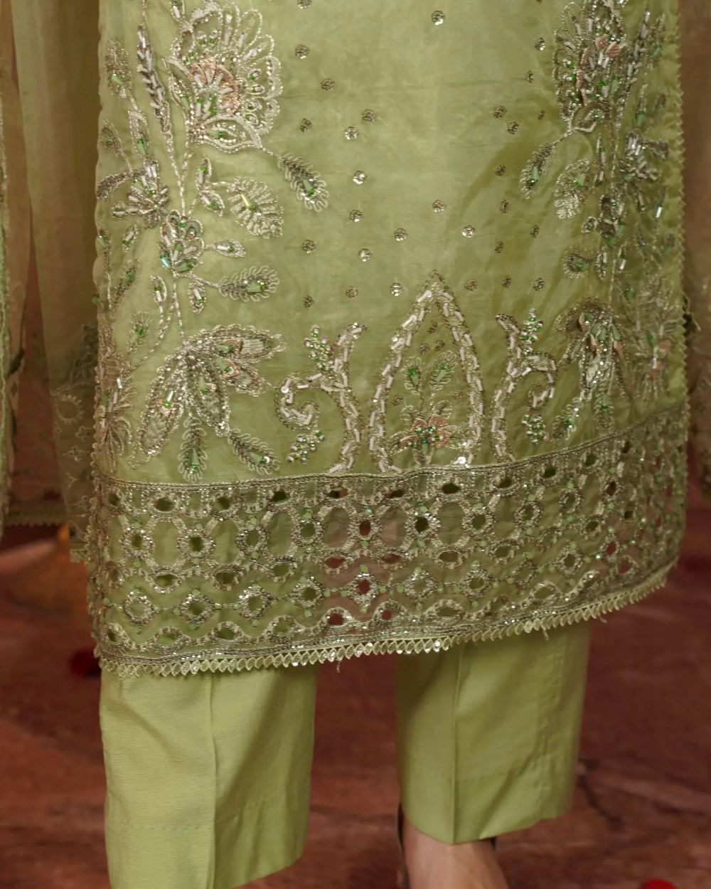 This simple but elegant attire brings a new look to your wardrobe. A classy kameez adorned with tilla, embroidery, sequins, beads, and lace added extra beauty with cutwork finishings paired with tailored trousers and a tissue dupatta with border finishings. giving a complete look.