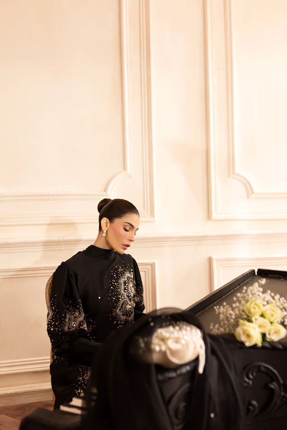 Vanya | 3 pc Black Charmeuse silk long embroidered shirt with hand embellishments ML-02| Ready to wear