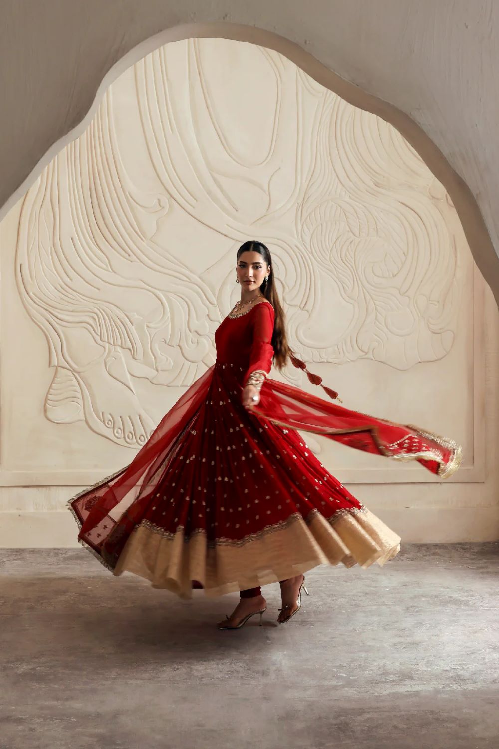 Rich red Anarkali adorned with delicate embroidery, sequins, and gold embellishments, paired with a sheer dupatta for an effortlessly regal look