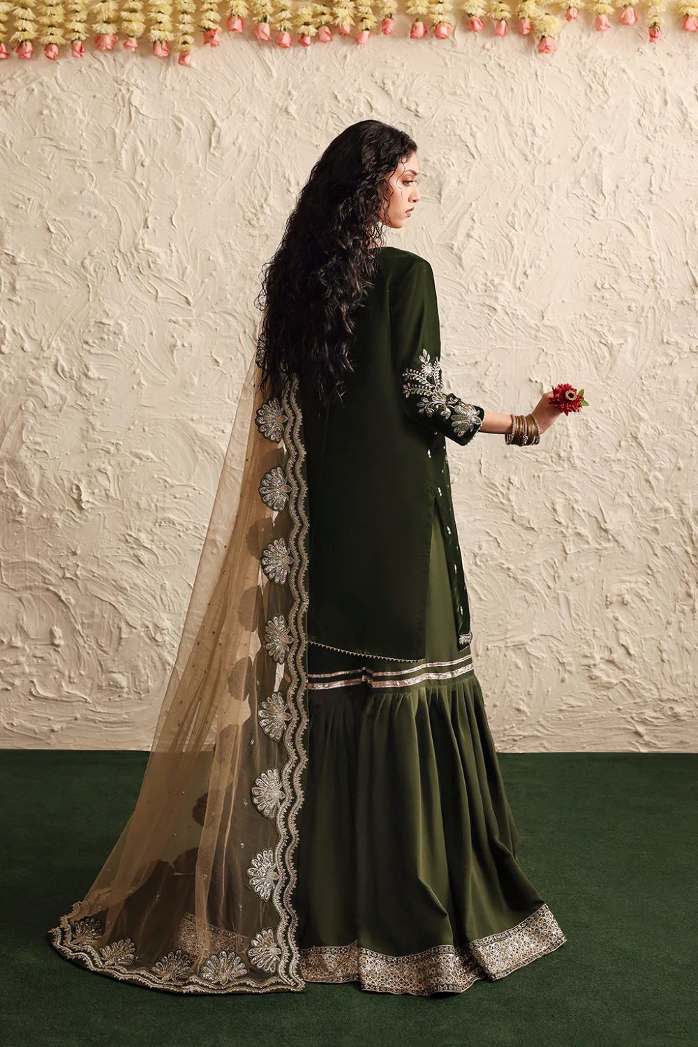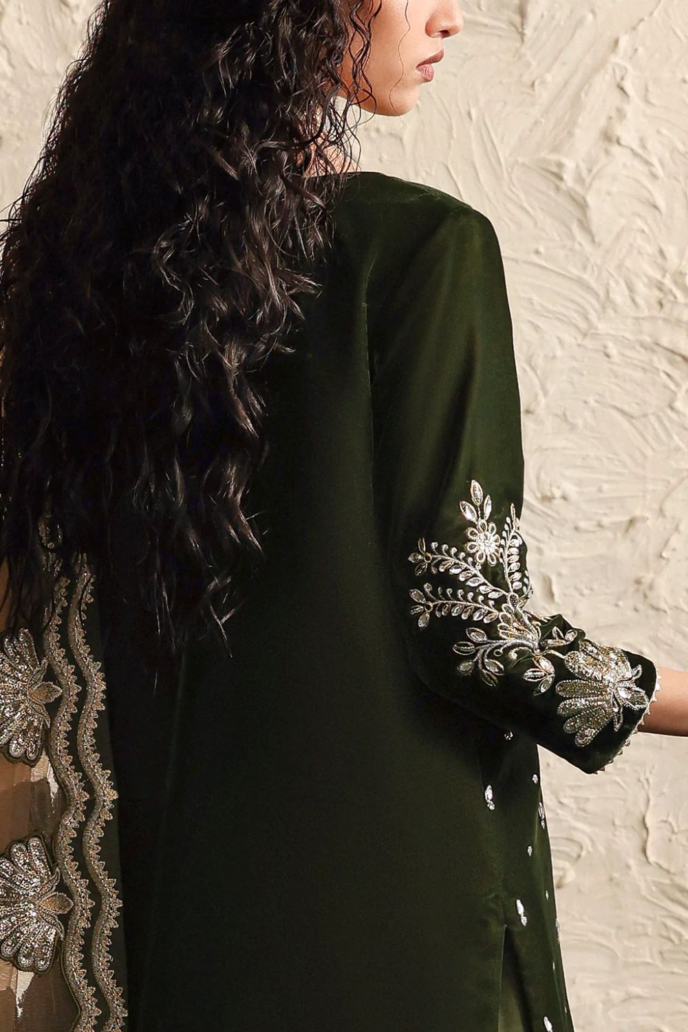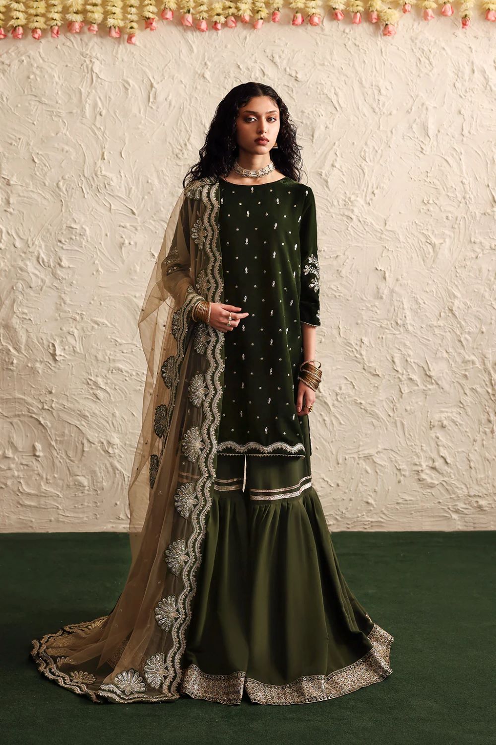 A deep green velvet shirt adorned with delicate hand embroideries pairs beautifully with a rich raw silk gharara.