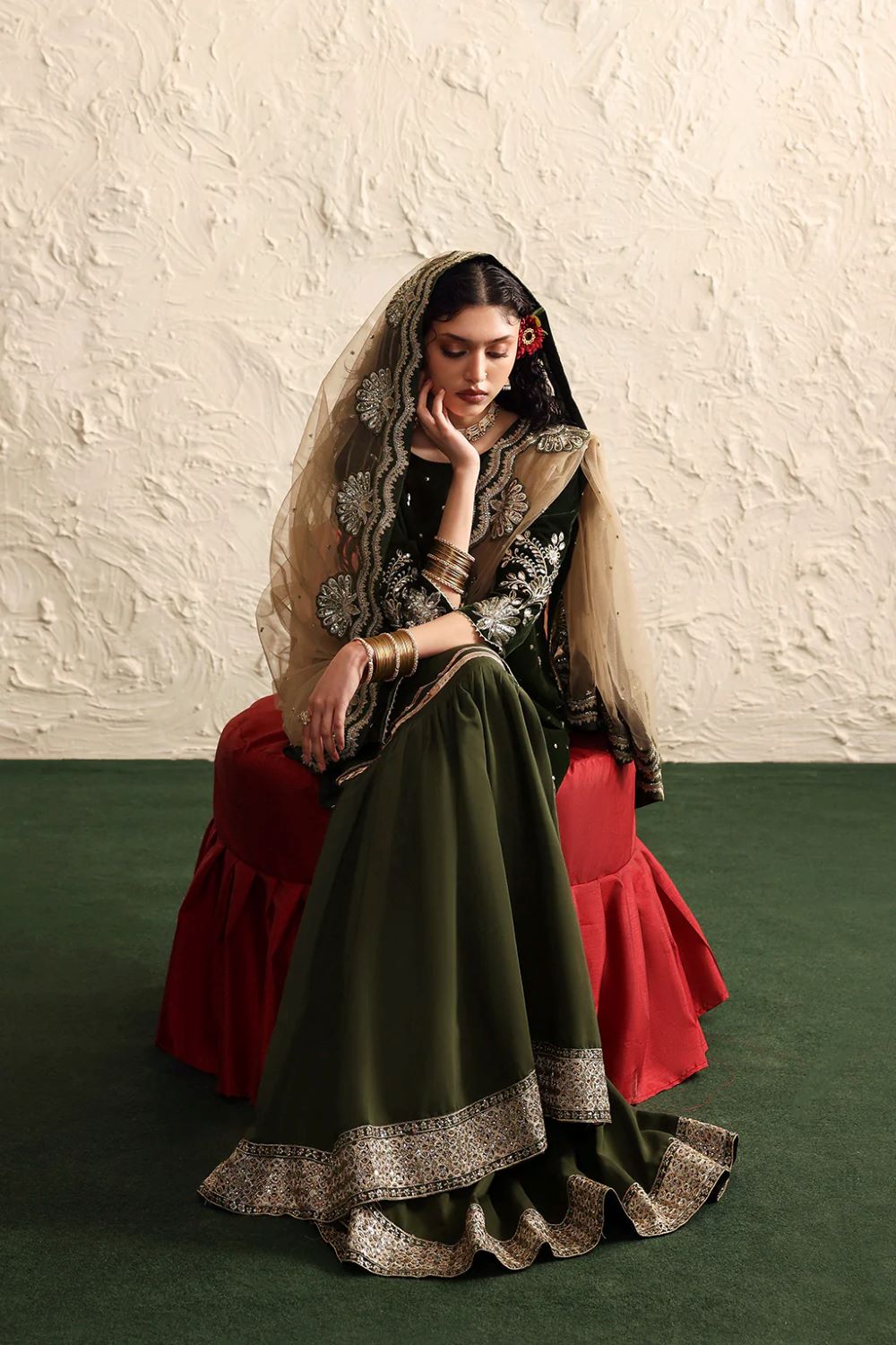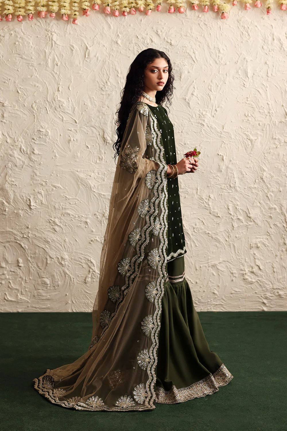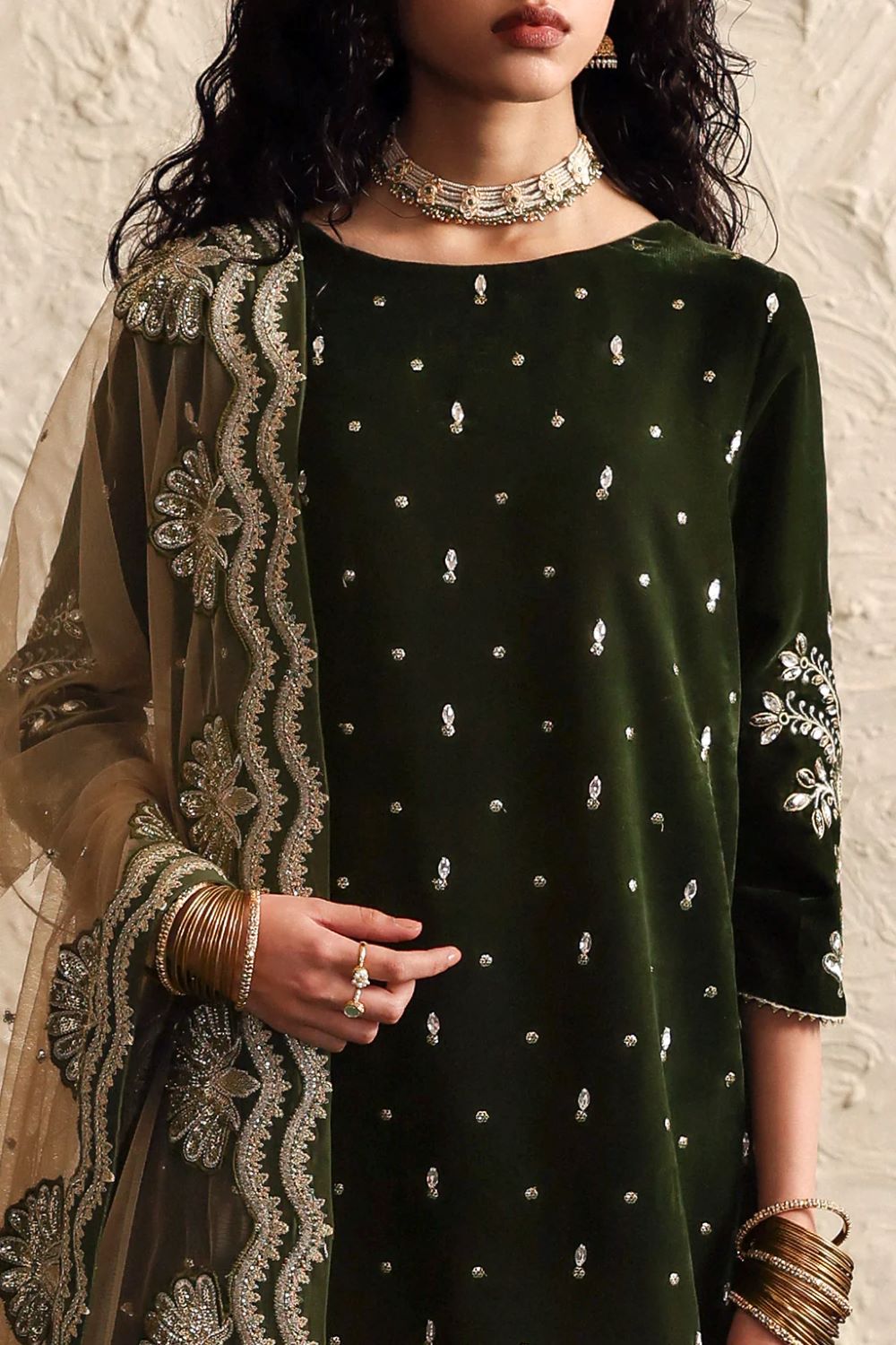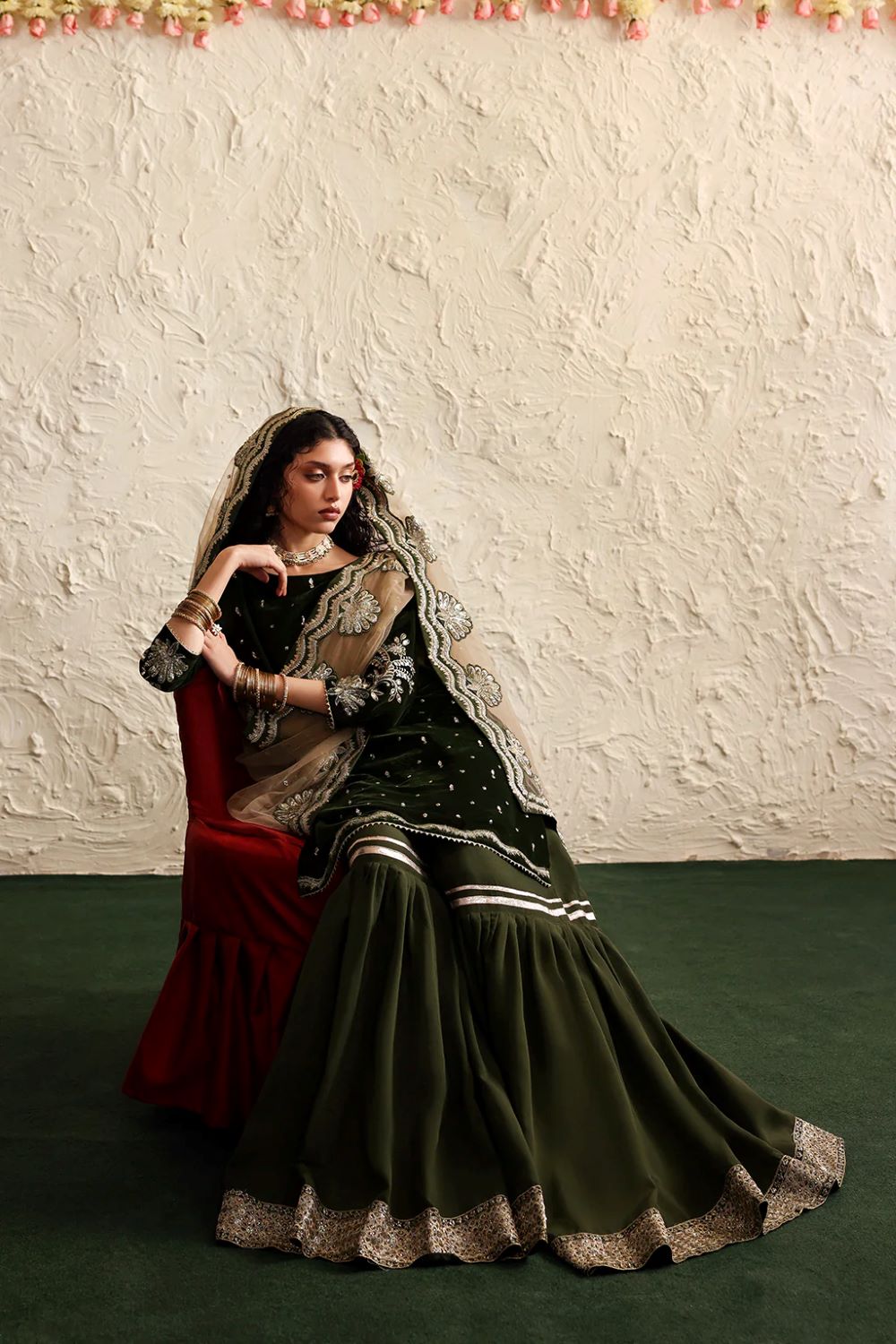 A deep green velvet shirt adorned with delicate hand embroideries pairs beautifully with a rich raw silk gharara.