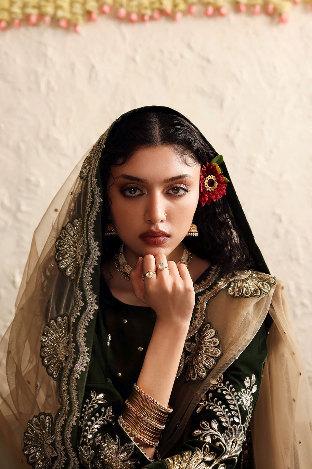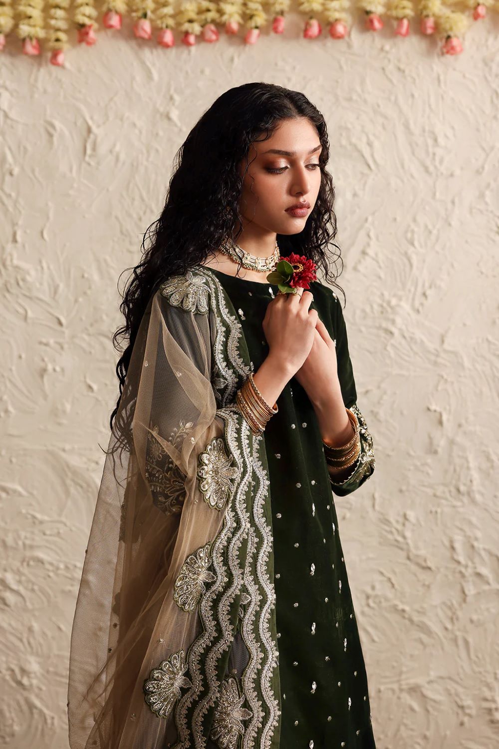 The look is completed with a sheer net dupatta featuring intricate embroidered motifs and scalloped edging.