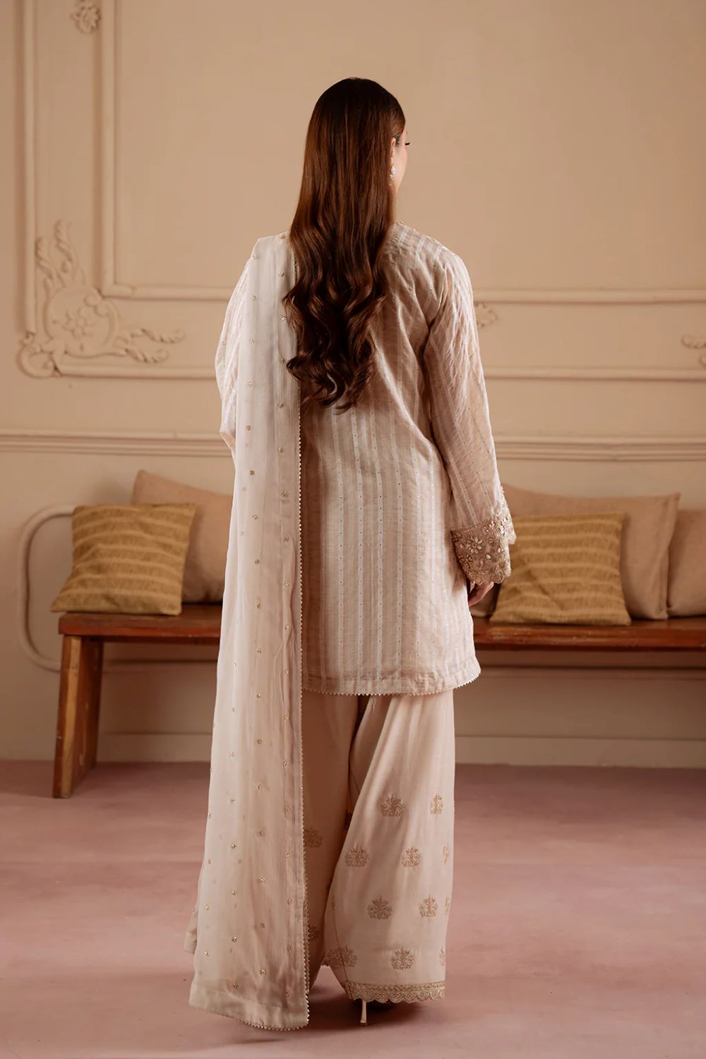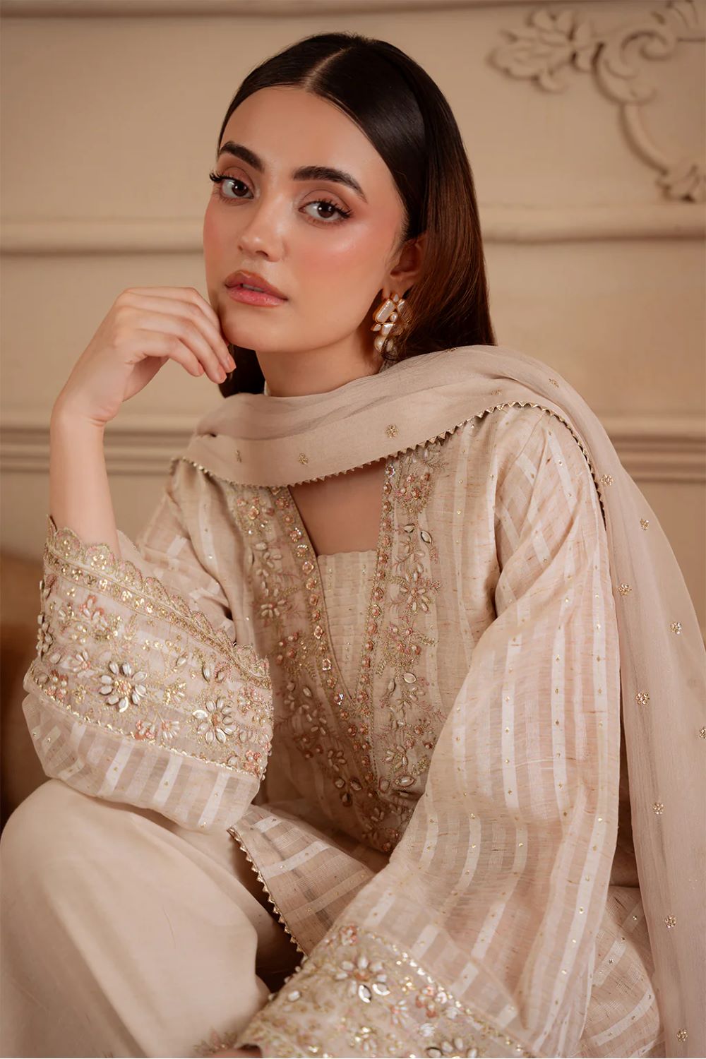 Embroidered and embellished zari brochia shirt paired with rawsilk trouser and embroidered chiffon dupatta