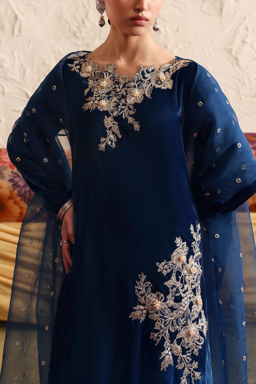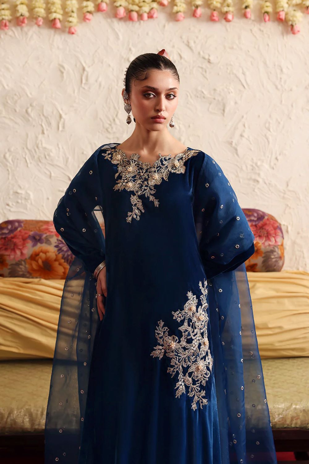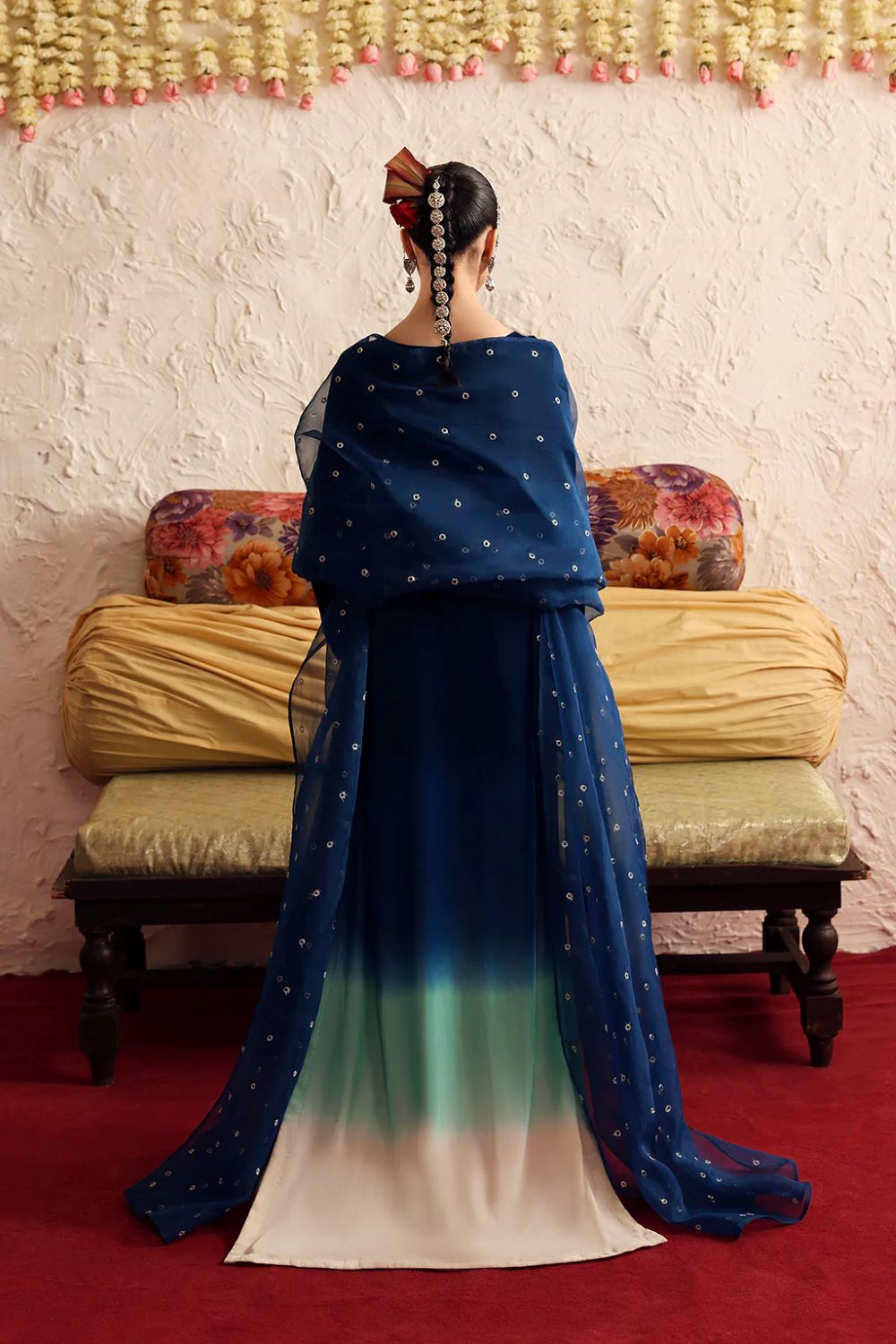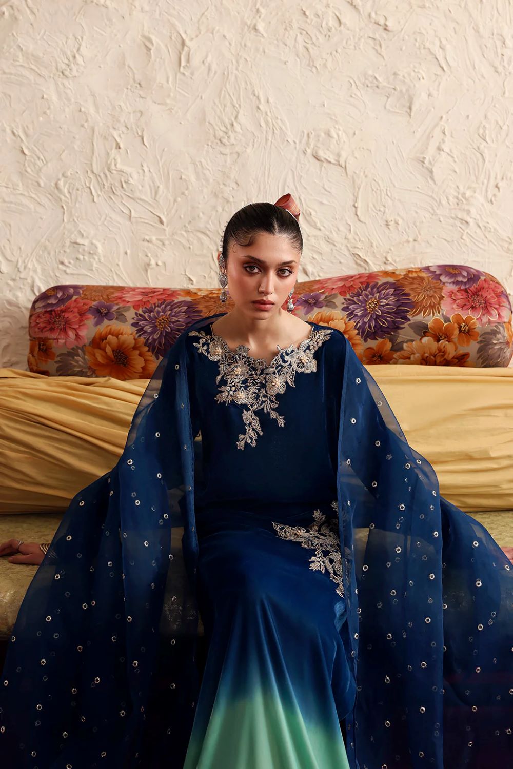 A stunning ombré in velvet ensemble featuring a captivating blend of rich and serene hues, beautifully enhanced with intricate embroidered motifs and refined adda work. The look is completed with a delicately embellished net dupatta and coordinated trousers in raw silk, creating an effortlessly elegant and timeless silhouette.