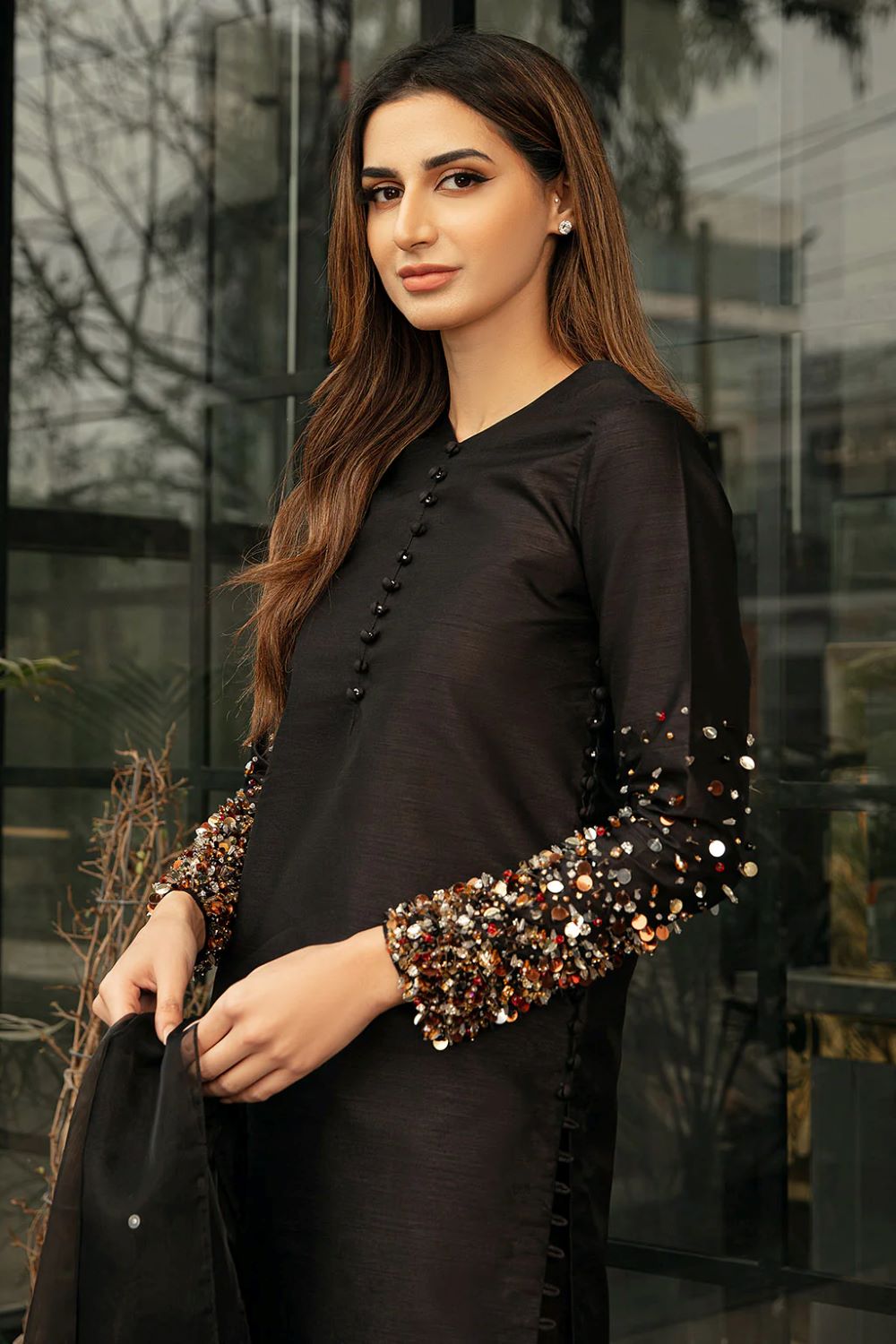 • An Exquisite Black Straight Shirt With Buttoned Detailed On The Front & Heavily Embellished Sleeves Paired With short Length Trouser & Organza Dupatta (Adda Work & Embroidery On Shirt)