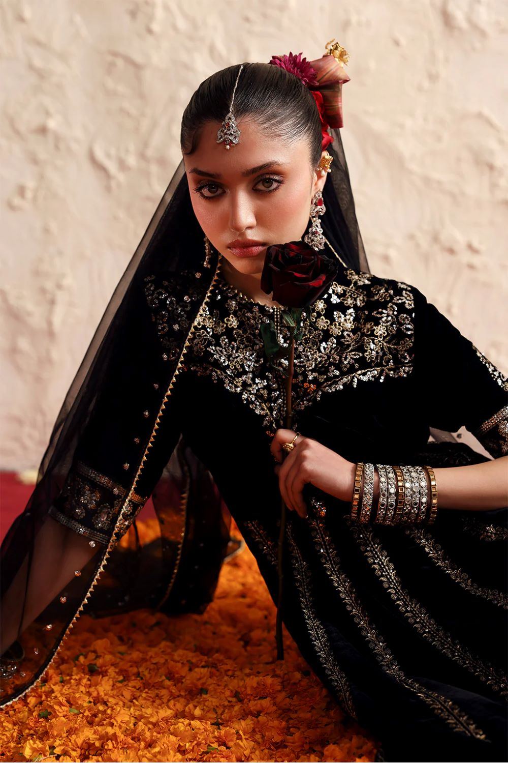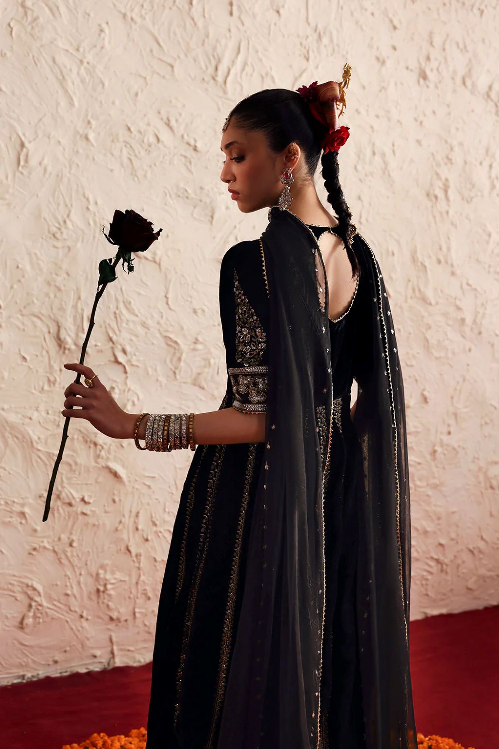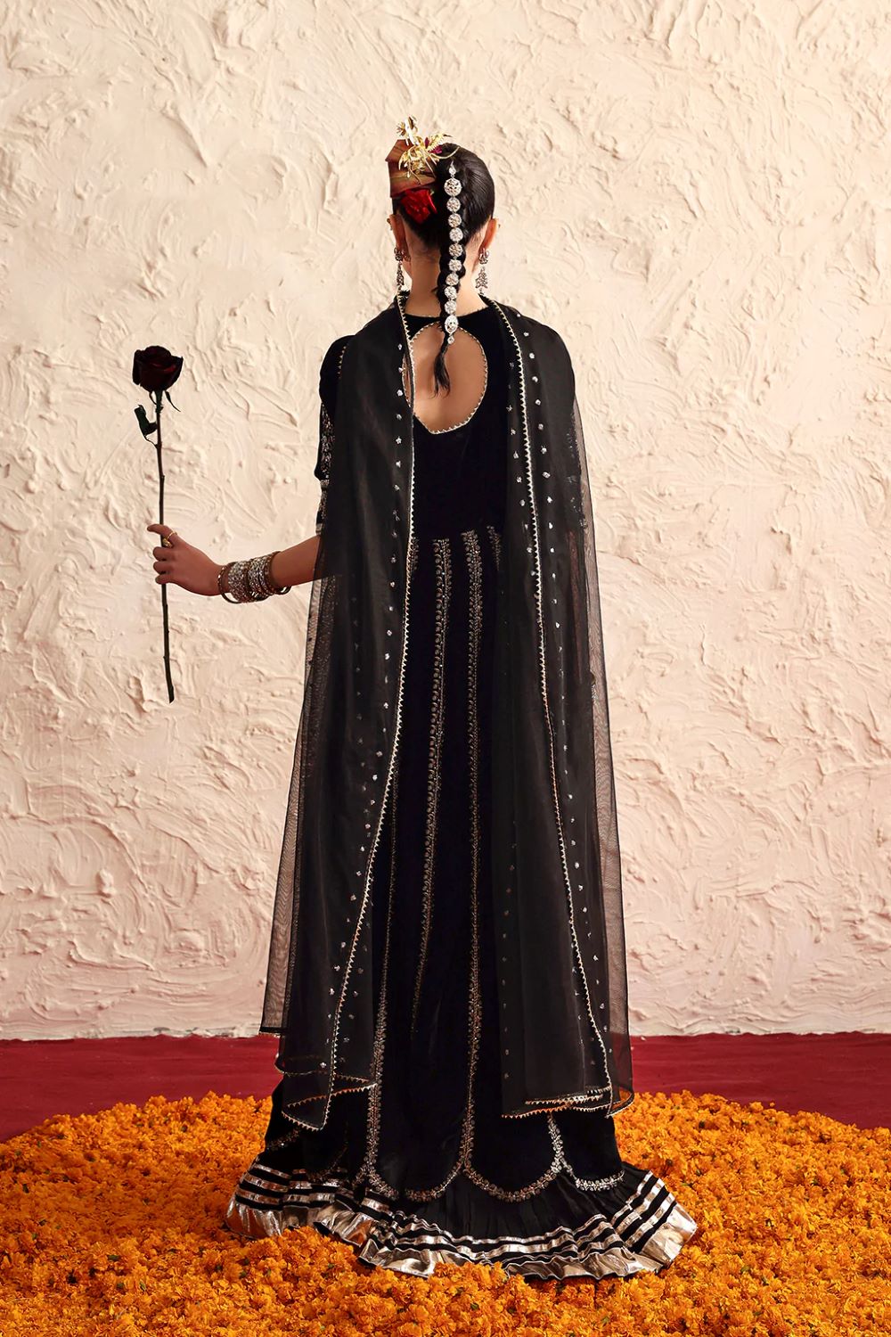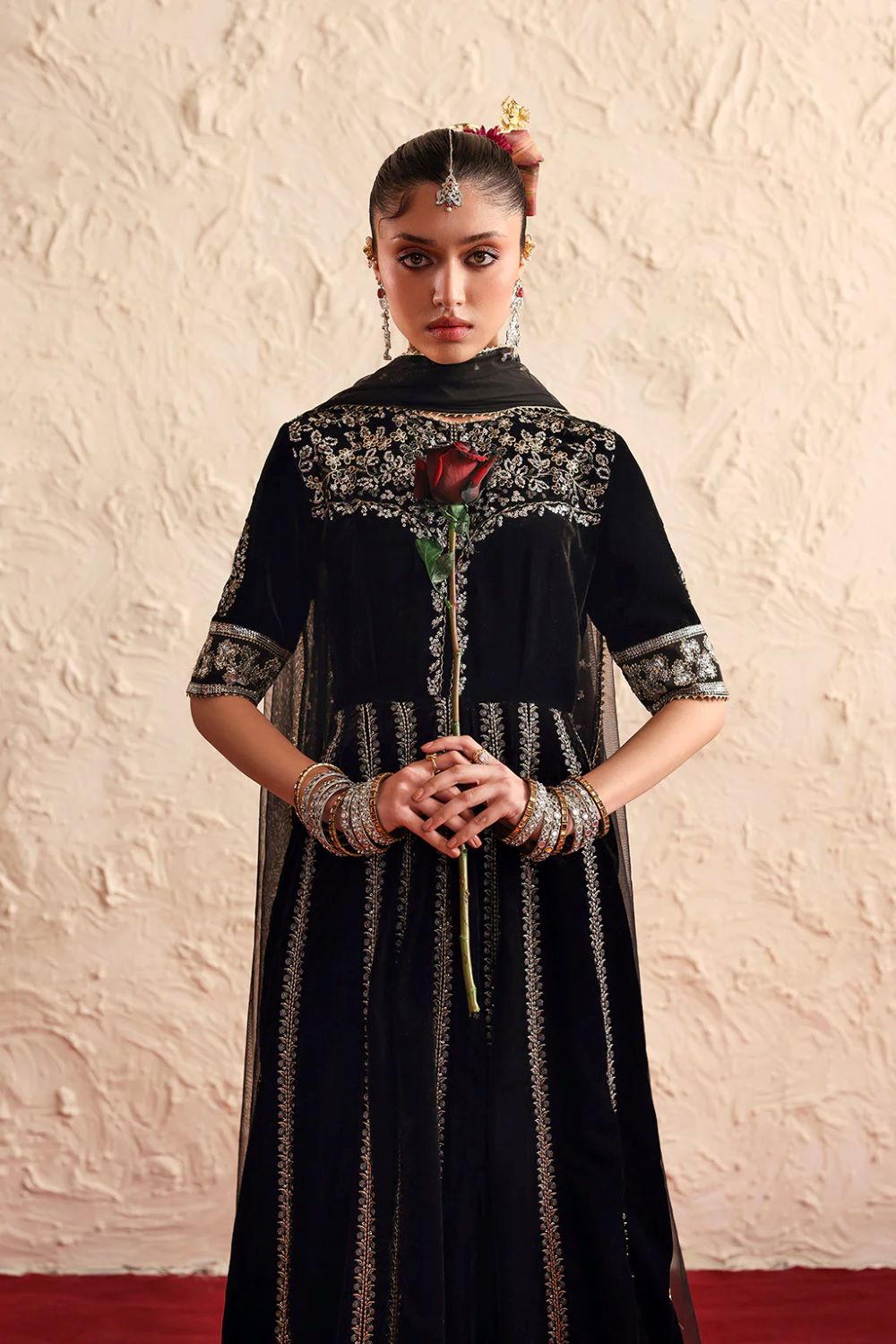 A luxurious velvet peshwas featuring intricate silver embroidery flows gracefully with its rich fall. It is paired with a delicate net dupatta adorned with matching embroidered details.