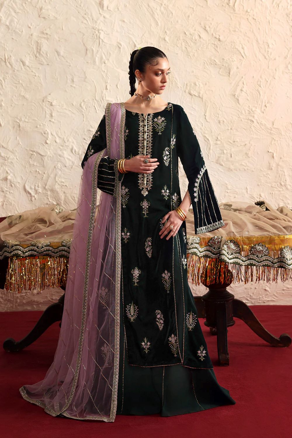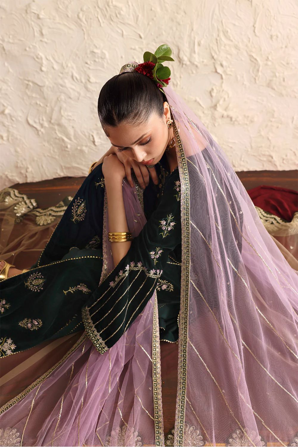 An elegant velvet shirt designed with a contemporary fusion cutline, beautifully enriched with a harmonious blend of embroidery and adda work that adds depth and intricacy to the entire ensemble. The look is completed with a contrasting, delicately embroidered net dupatta and flared pants, creating a regal yet modern silhouette perfect for festive and formal occasions.