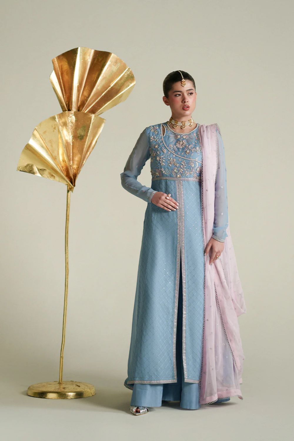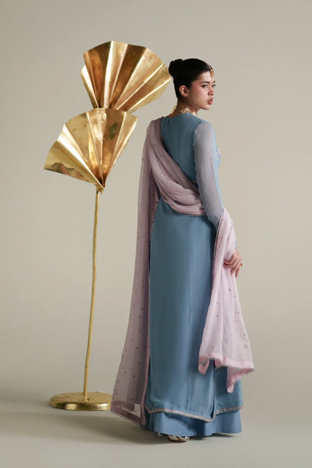 A soft pastel fusion-cut shirt featuring a delicately embroidered and hand-embellished bodice, paired with a contrasting dupatta and sharara for an elegant, contemporary look.