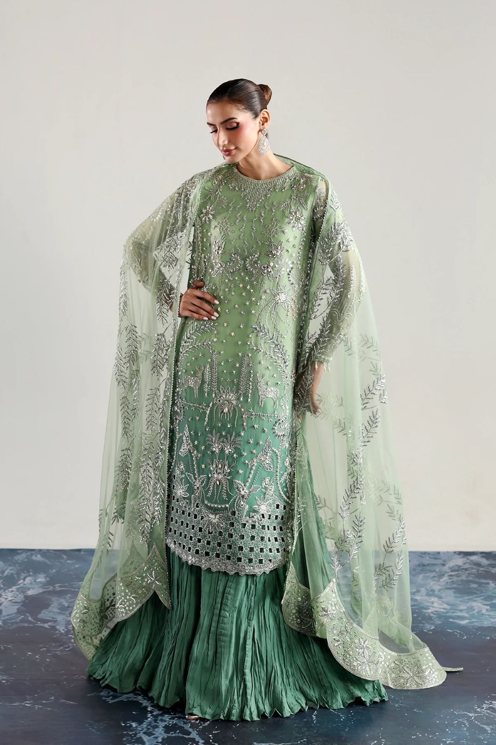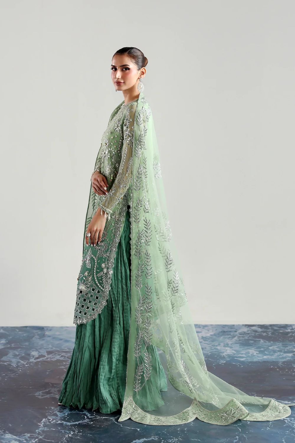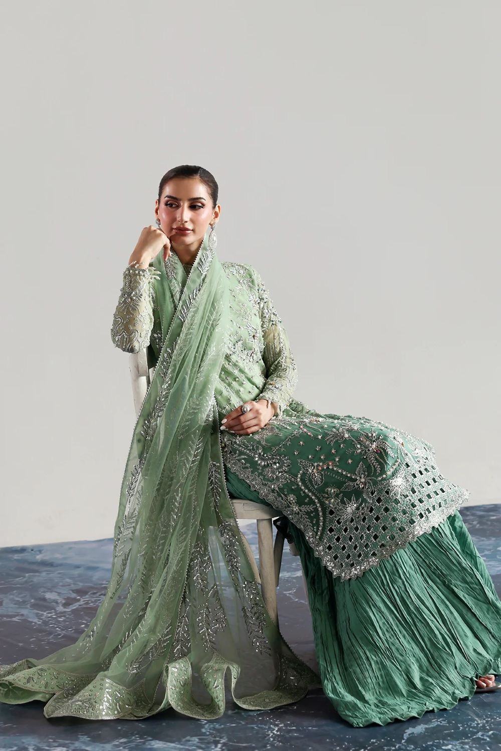 Elegant chiffon shirt with intricate embroidery and hand embellishments, paired with an embroidered chiffon dupatta and a crushed silk sharara. Perfect for festive occasions