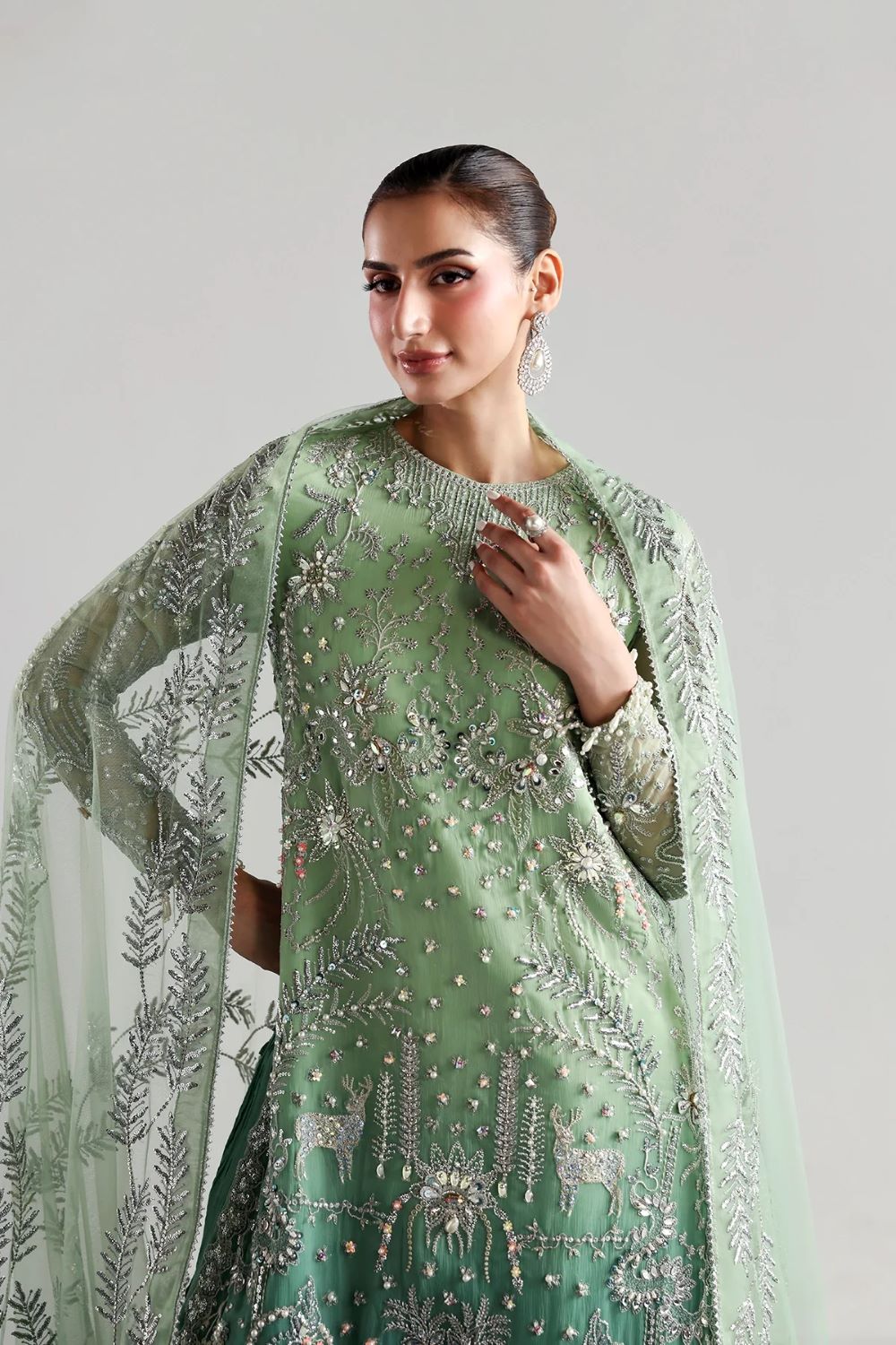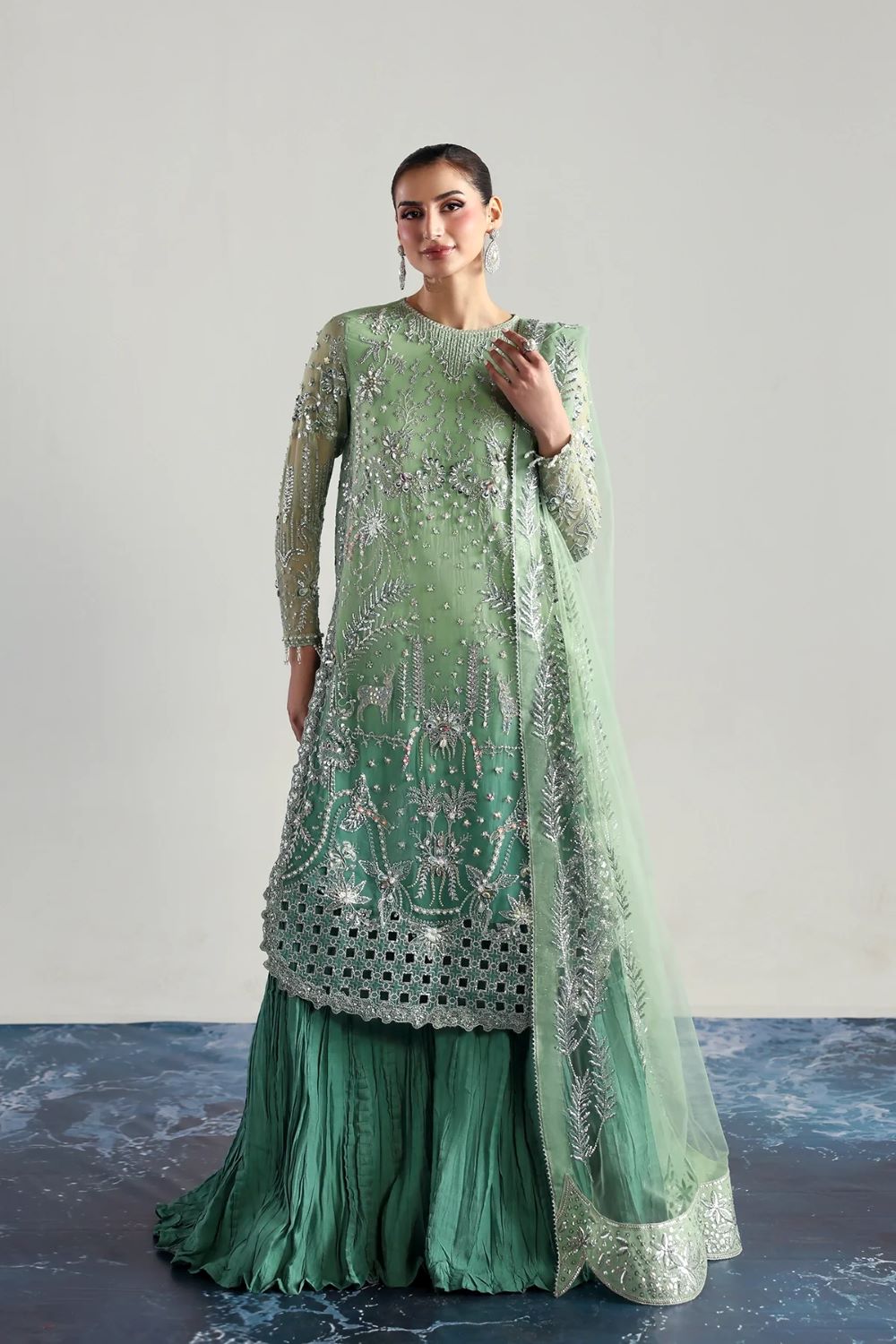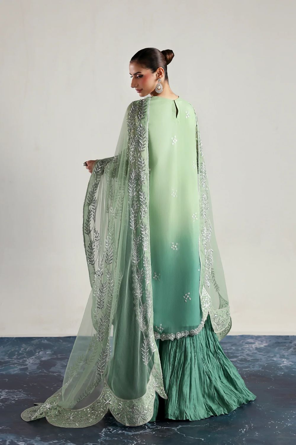 Elegant chiffon shirt with intricate embroidery and hand embellishments, paired with an embroidered chiffon dupatta and a crushed silk sharara. Perfect for festive occasions