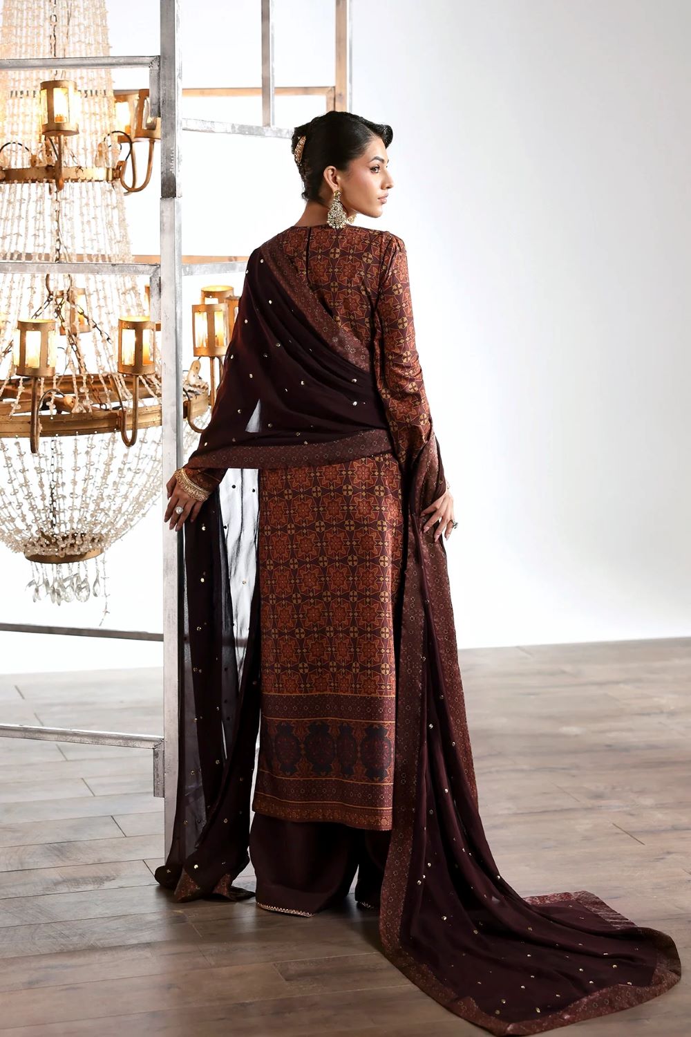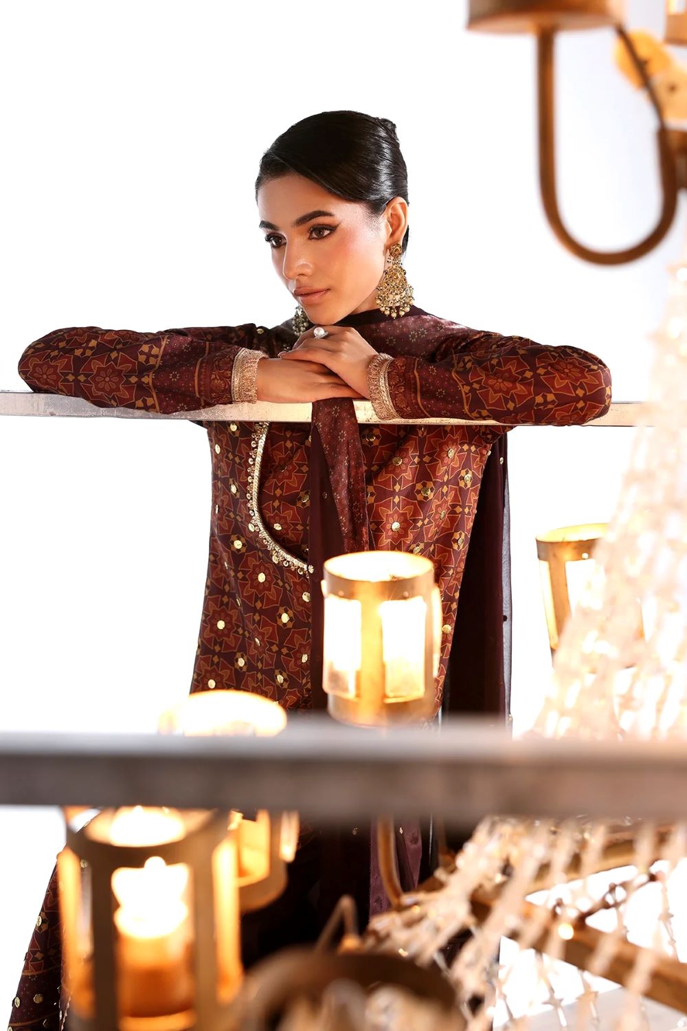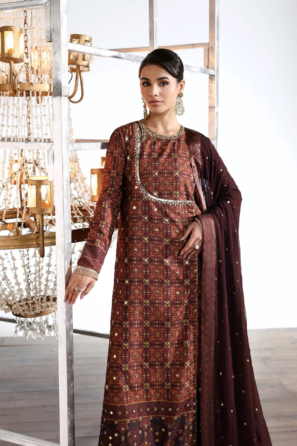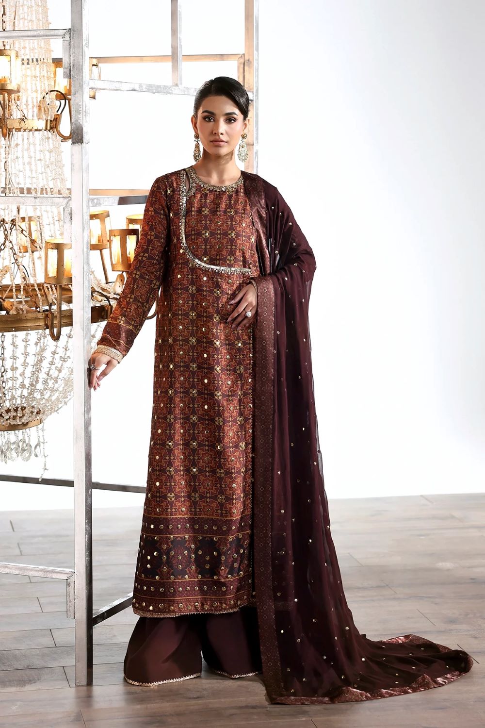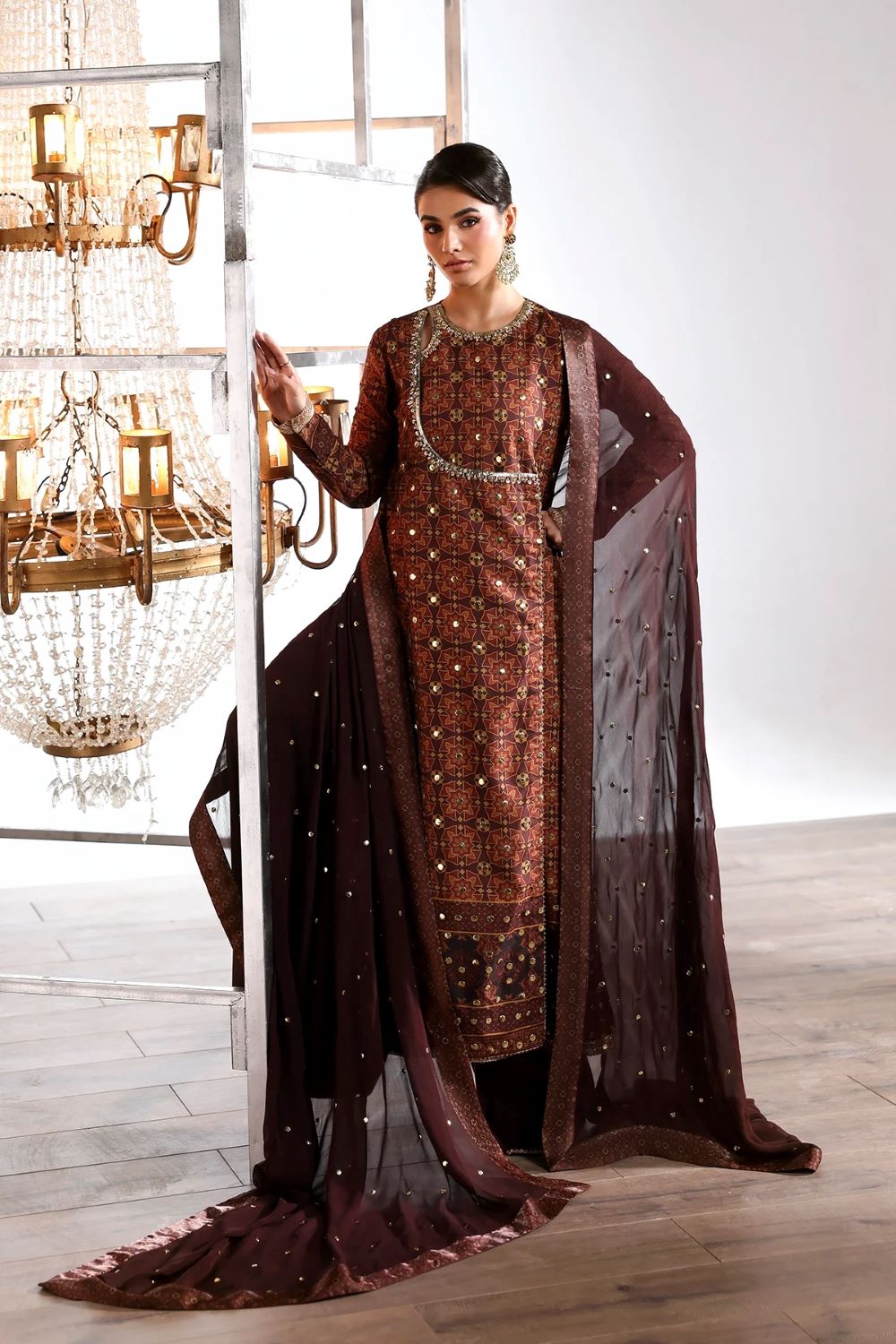 A stunning and classy ethnic print ensemble enhanced with delicate mukesh work that beautifully elevates the look, paired with a chiffon dupatta and plain trousers for timeless elegance.