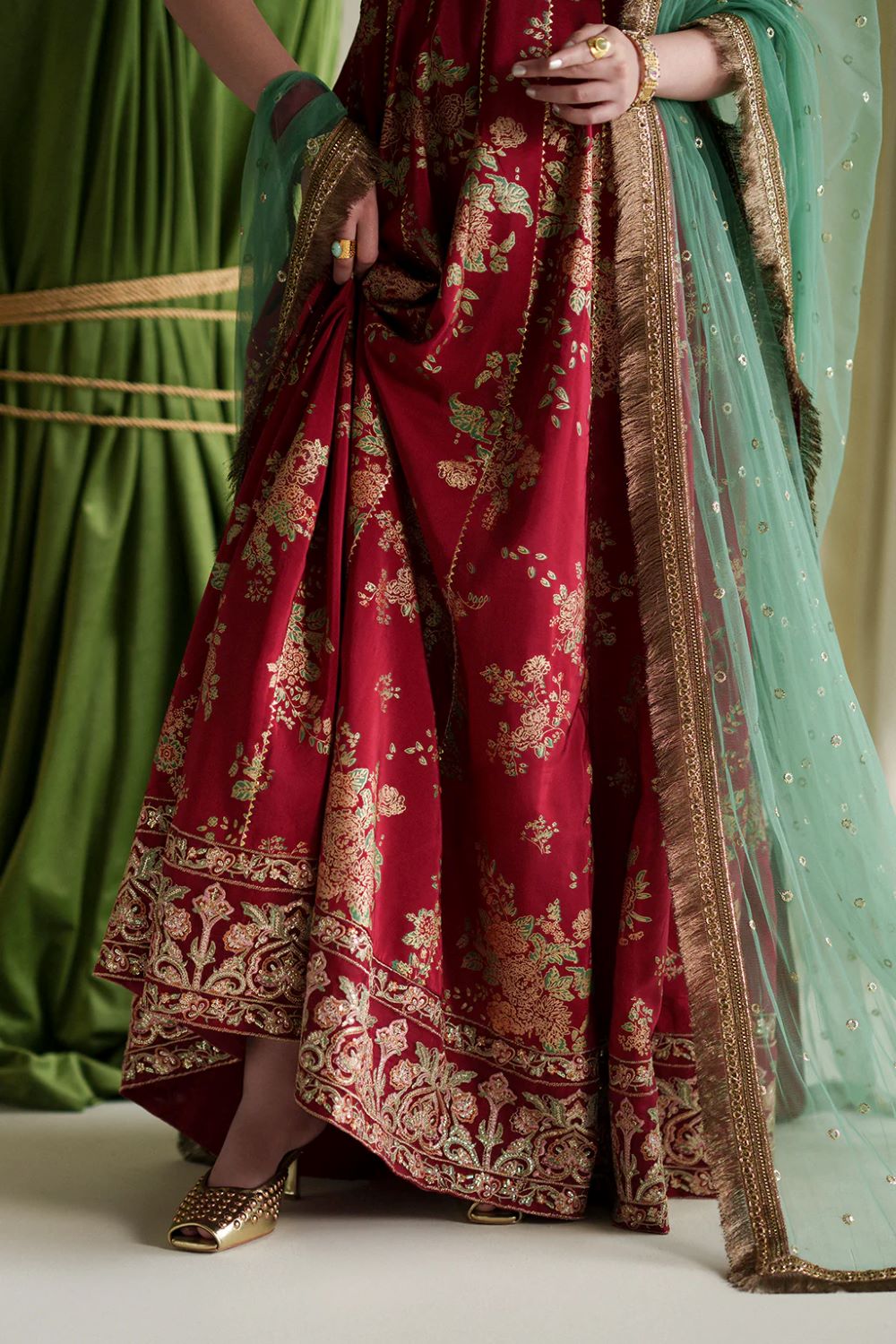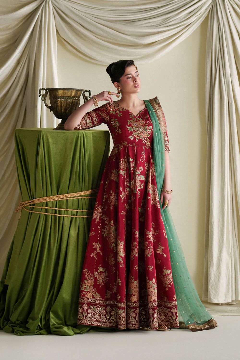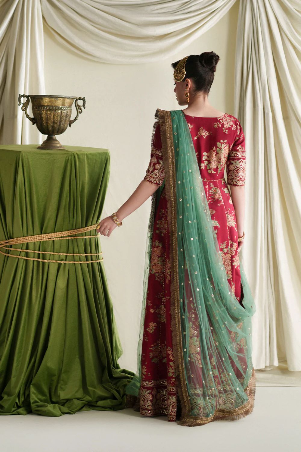 A timeless red screen-printed kalidar crafted in rich silk,