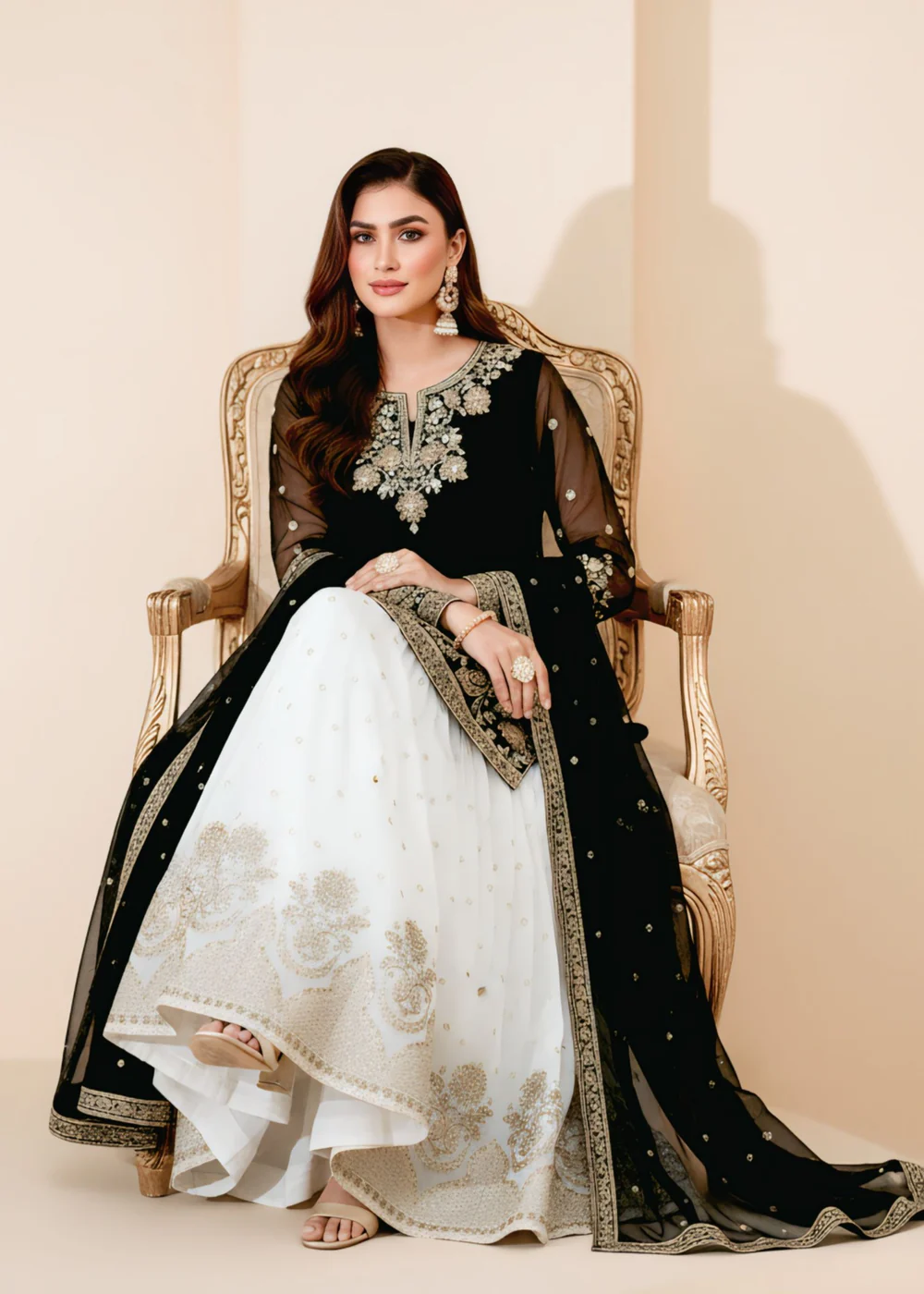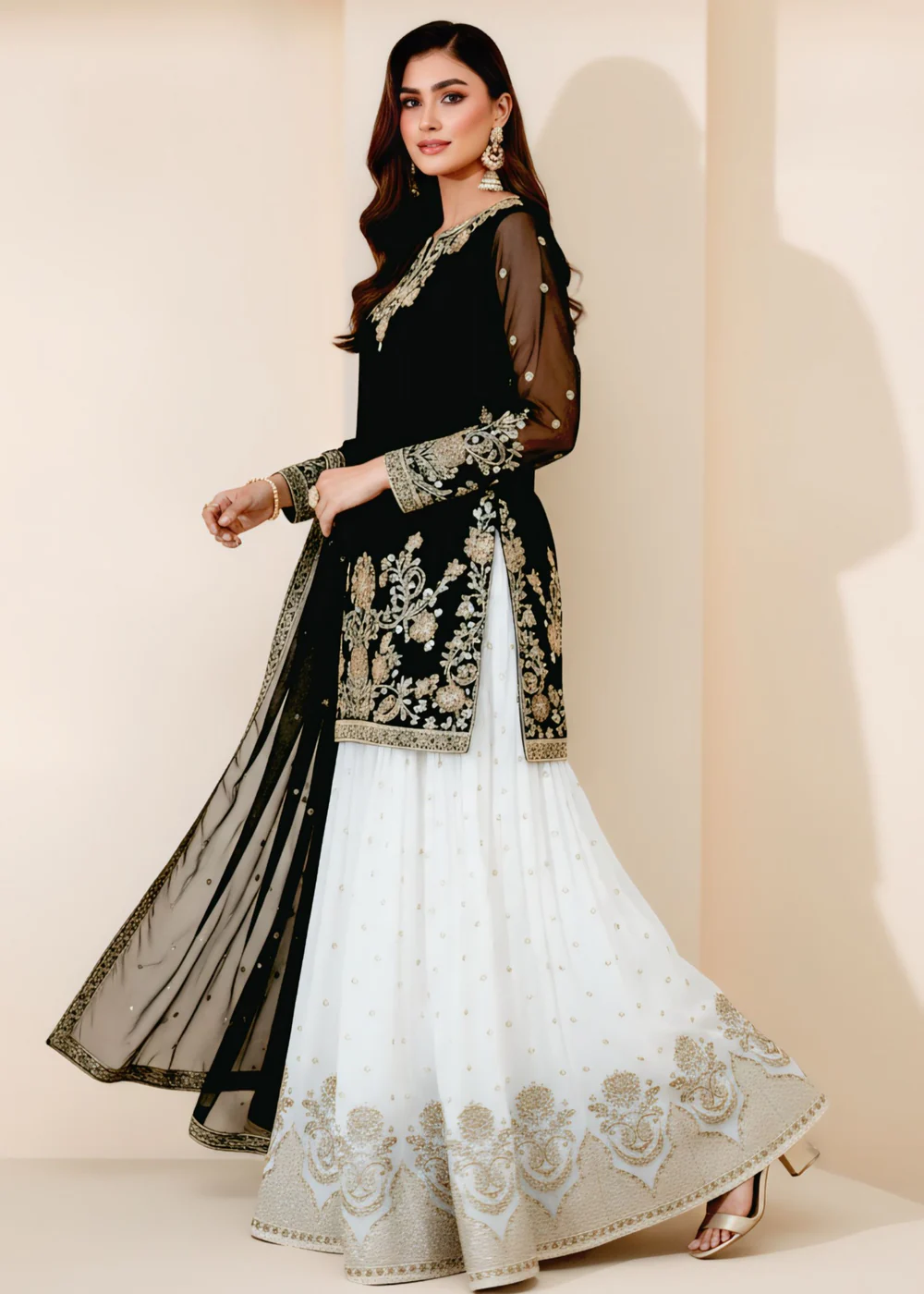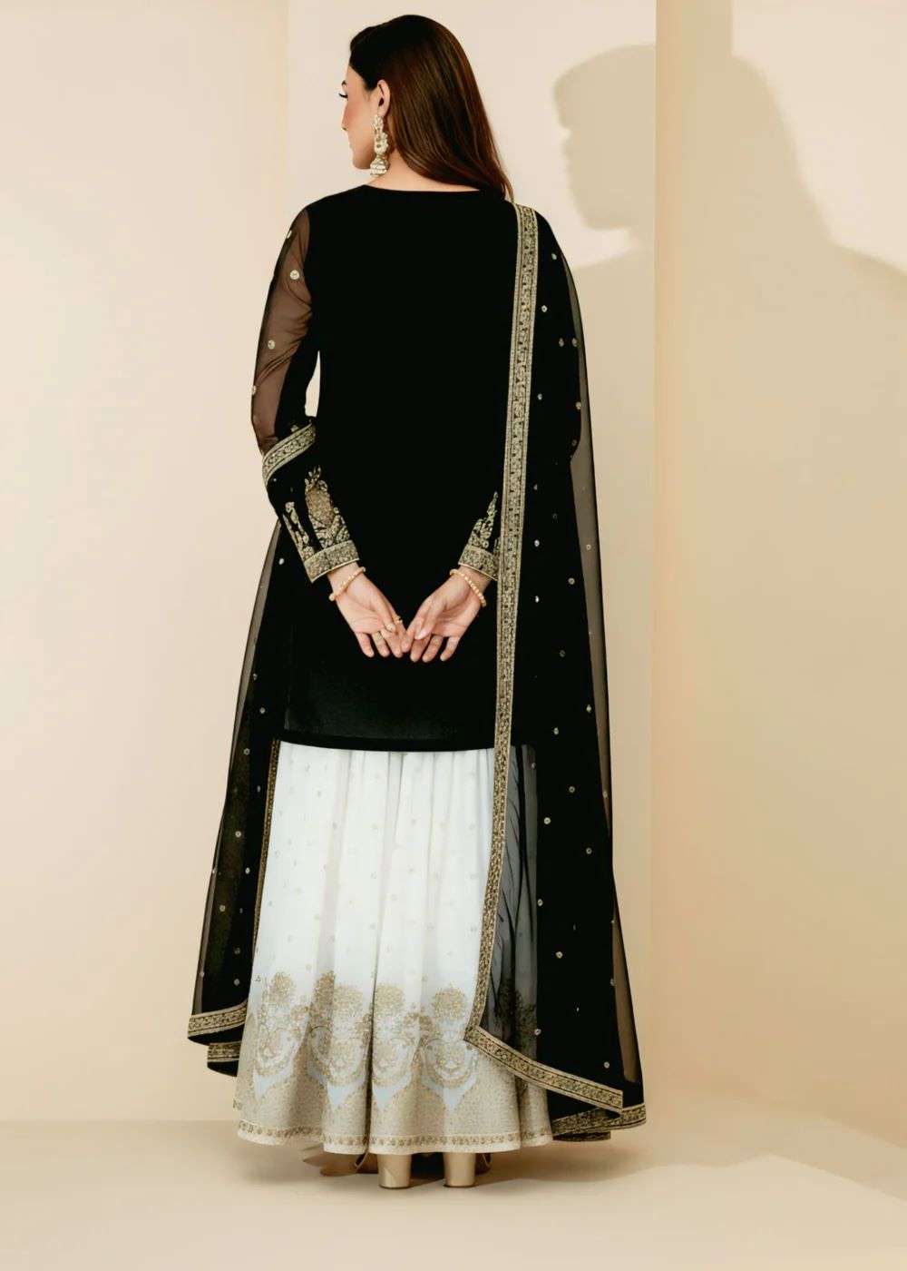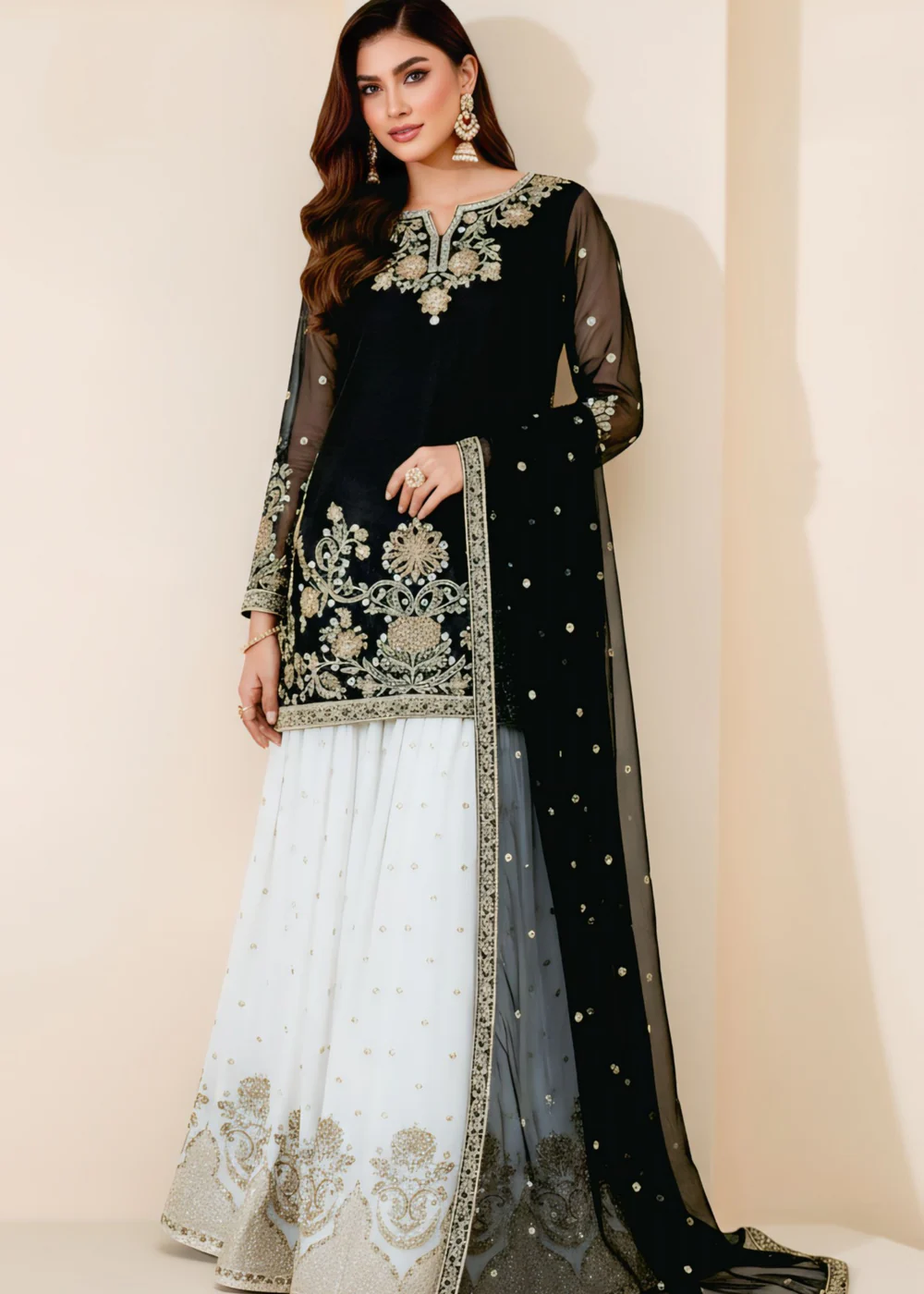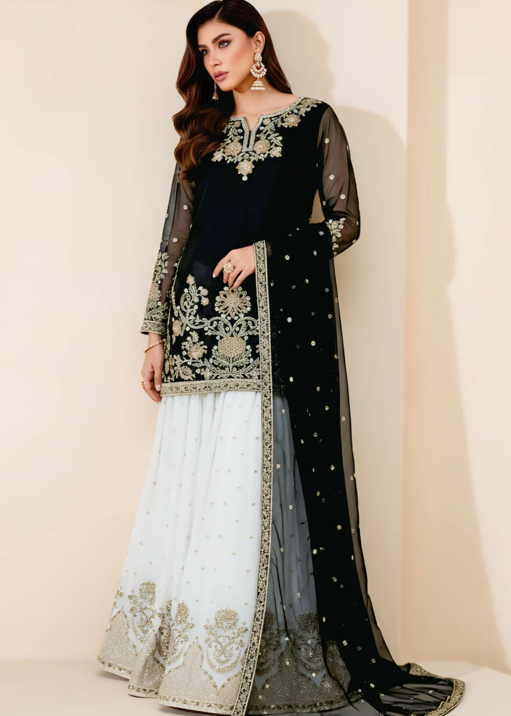 This exquisite Festive/Party Wear Kurti Gharara Set in striking Black is a true masterpiece. The intricately embroidered top and chiffon dupatta add a touch of elegance. The straight-leg gharara bottom completes the ensemble with grace and style. Perfect for all seasons, this set by Agha Jaan is sure to make heads turn.