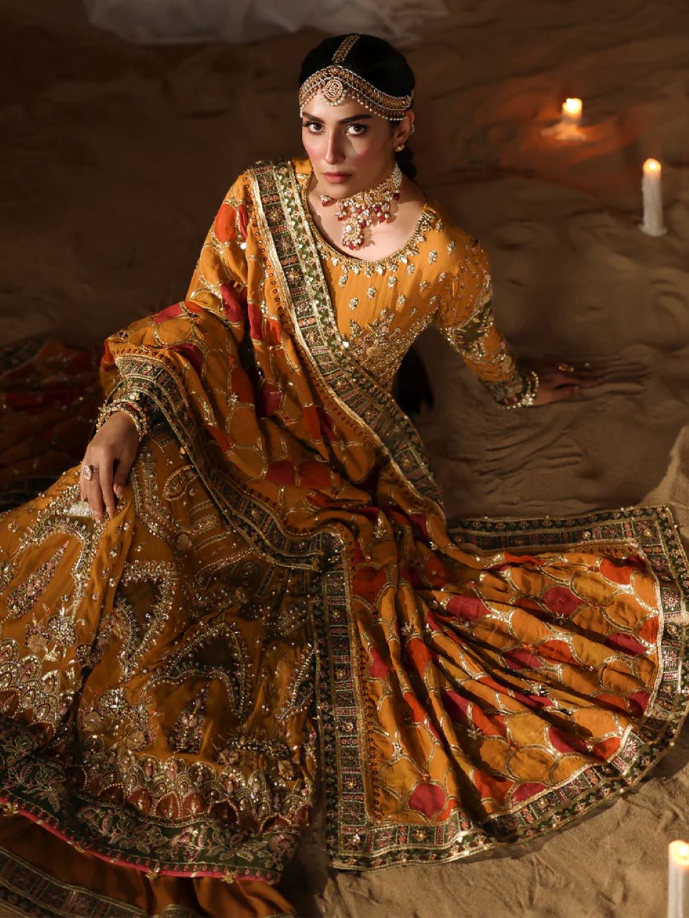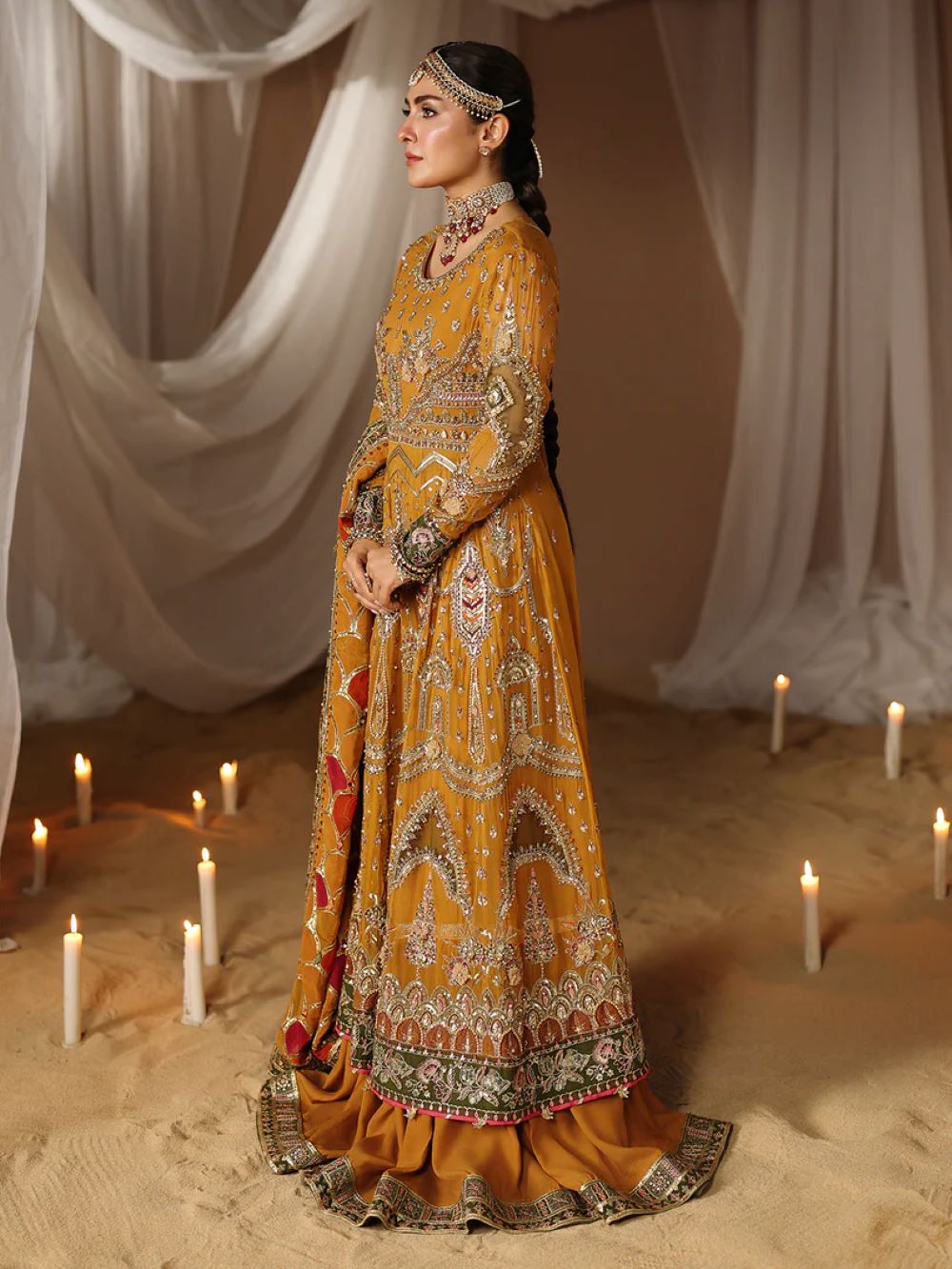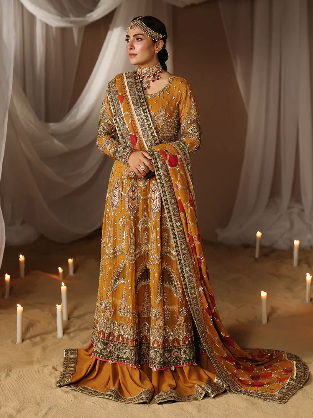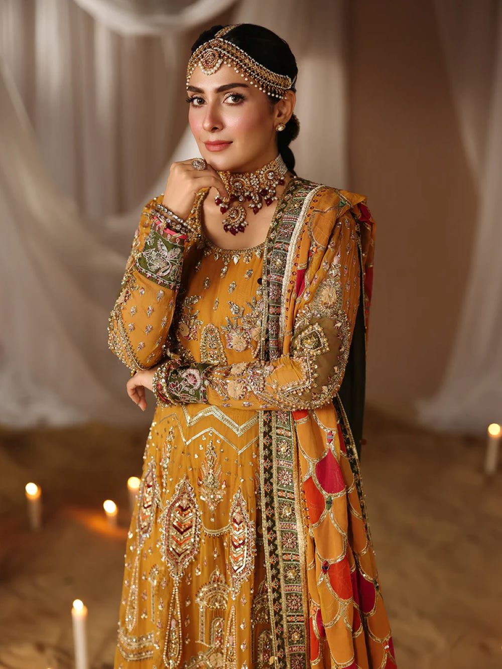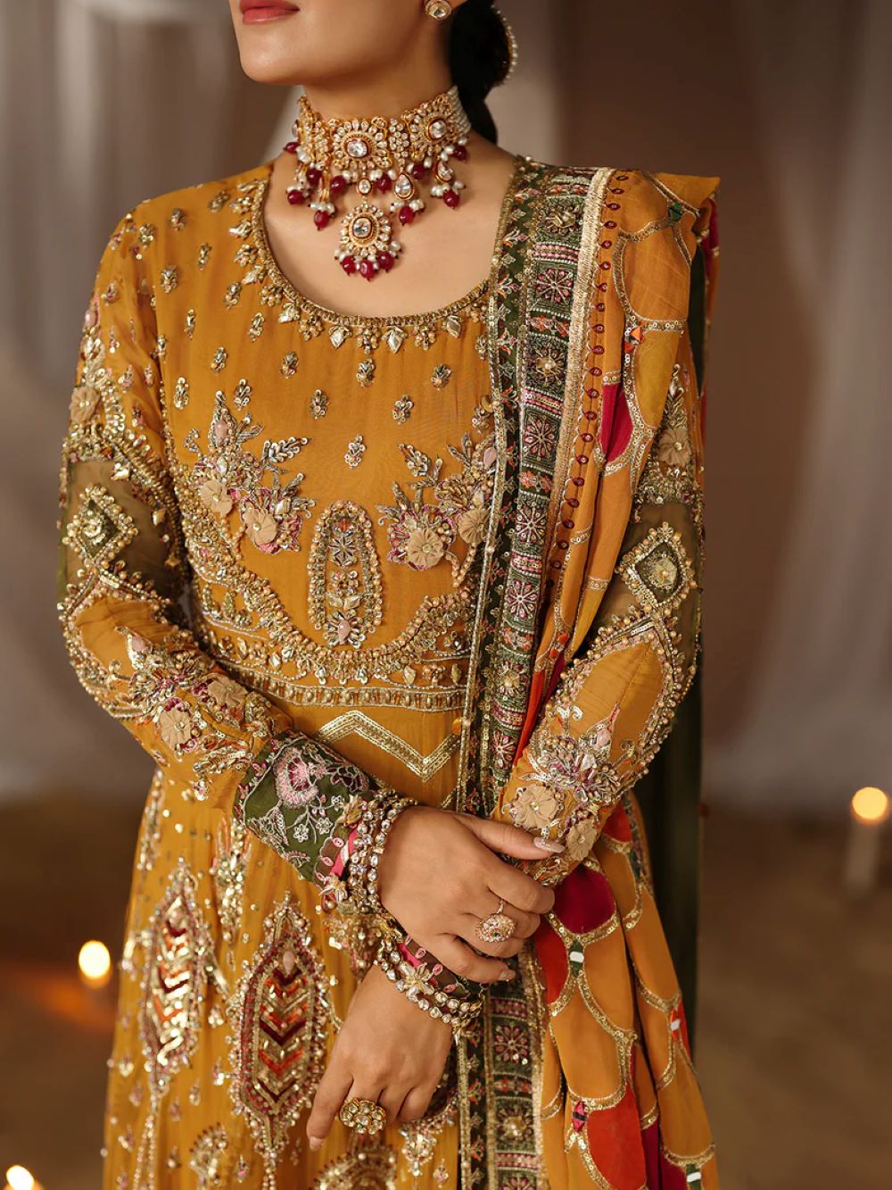 Chiffon maxi, exquisite with handcrafted adda work featuring pearls, naqshi, dabka, and crystals. Revel in the dazzling spangle embroidery and breathtaking 3D floral embellishments that make this piece truly unforgettable