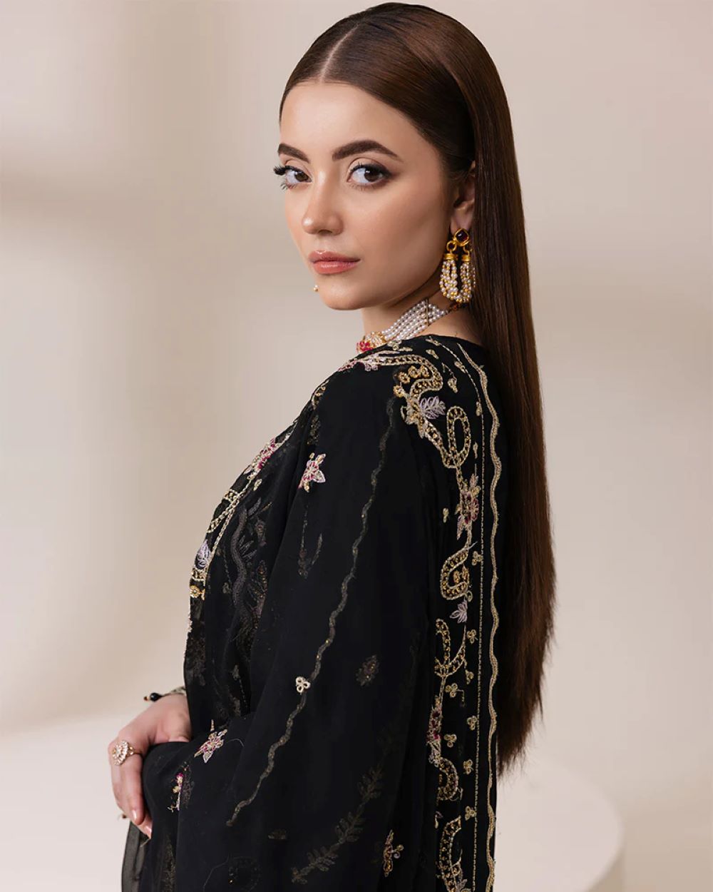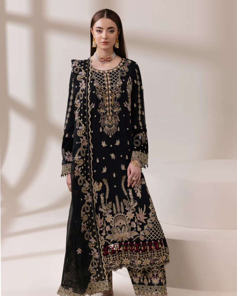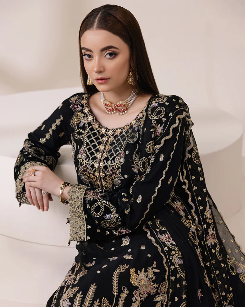 Shirt: Chiffon shirt with sequin embroidery, crystals, pearls, and a luxurious velvet touch on the sleeves and shirt. Complete the look with tassels