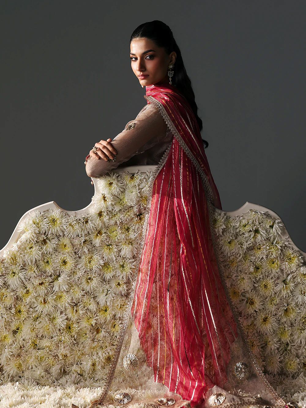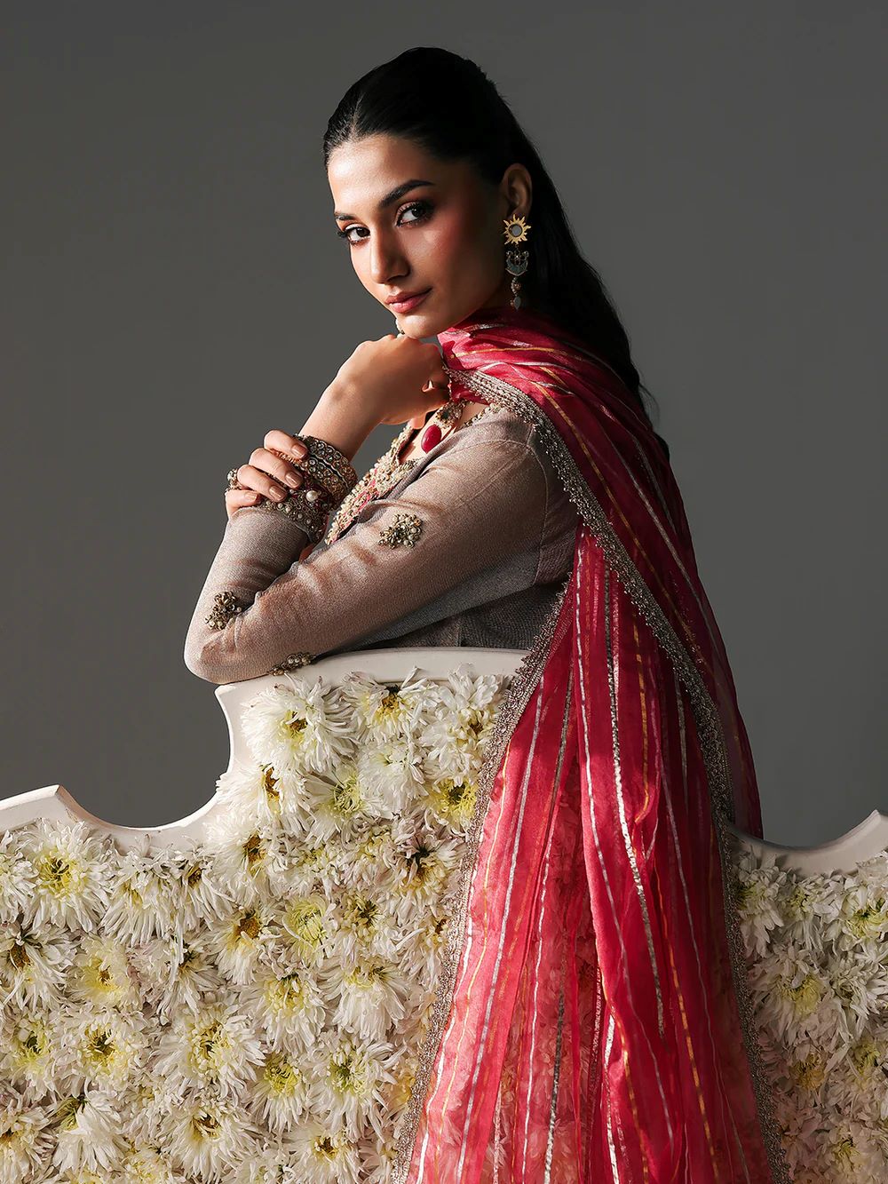 Dupatta: Organza lurex dupatta adorned with elegant laces and playful tussles
