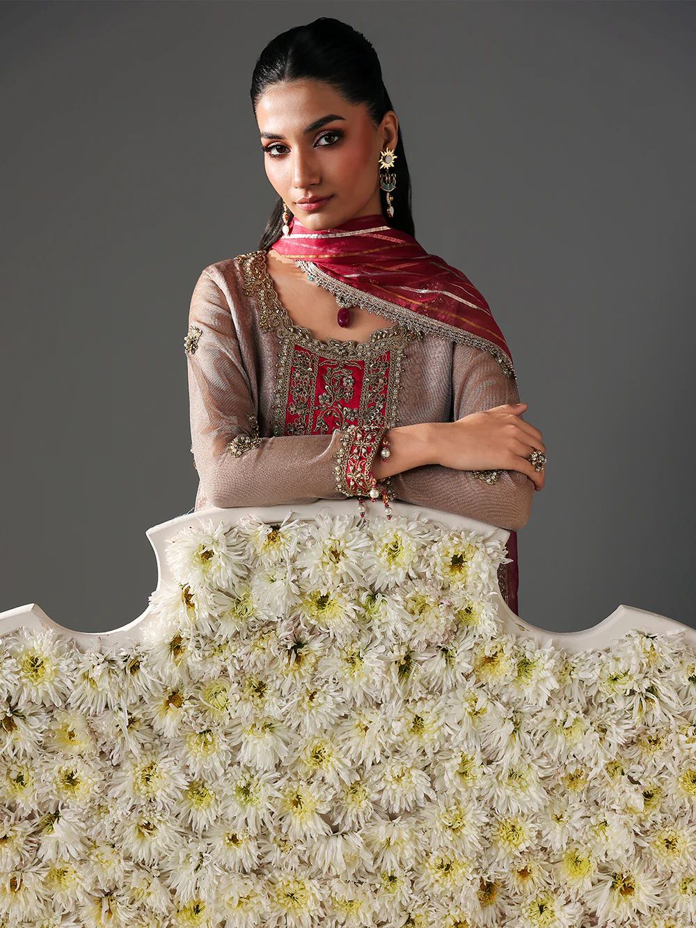 Shirt: Masoori net shirt, beautifully crafted with intricate hand-stitched adda work.combination of pearls, crystals, stones, and chainwork, along with naqshi detailing. luxurious jamawar inner