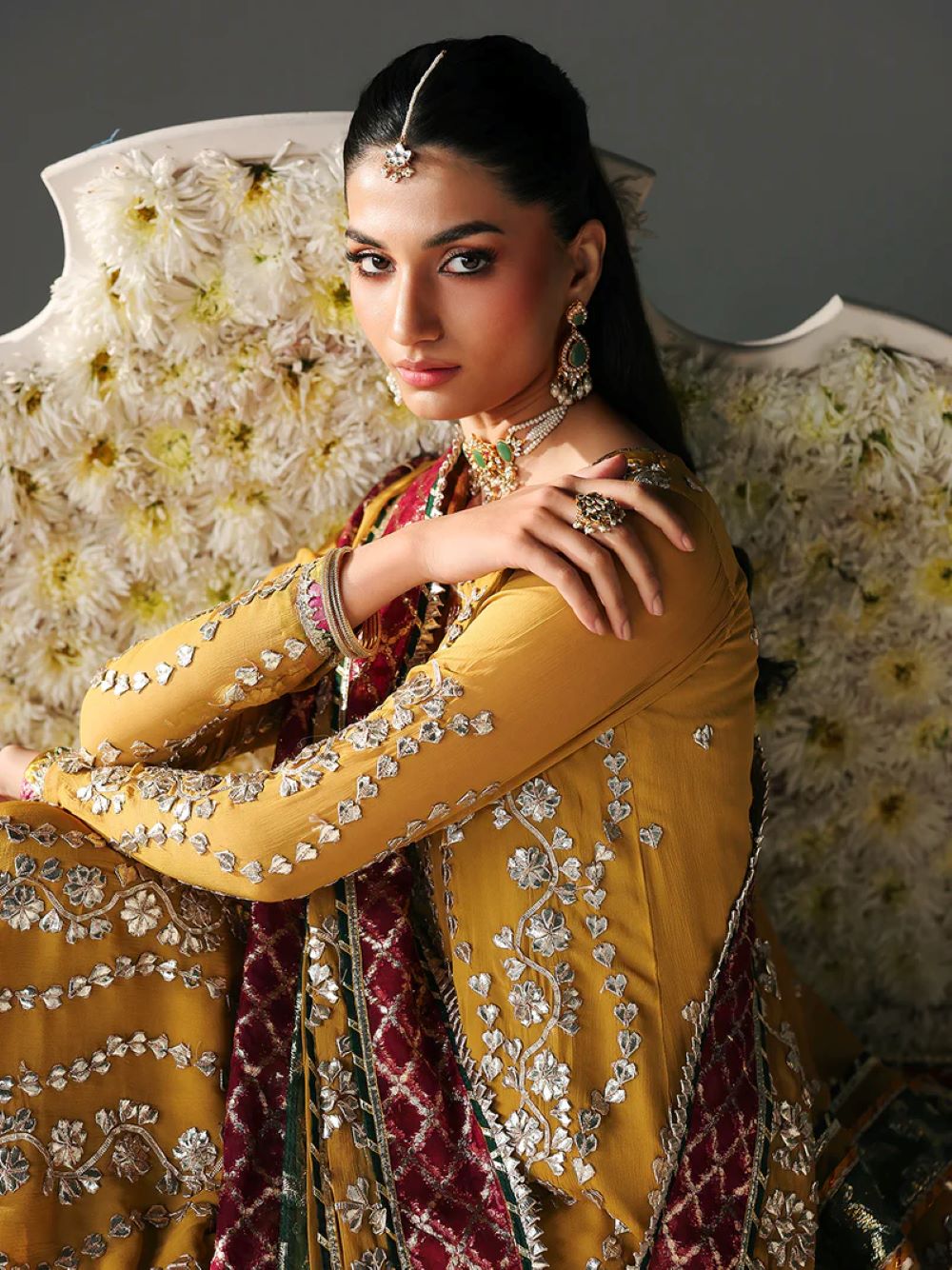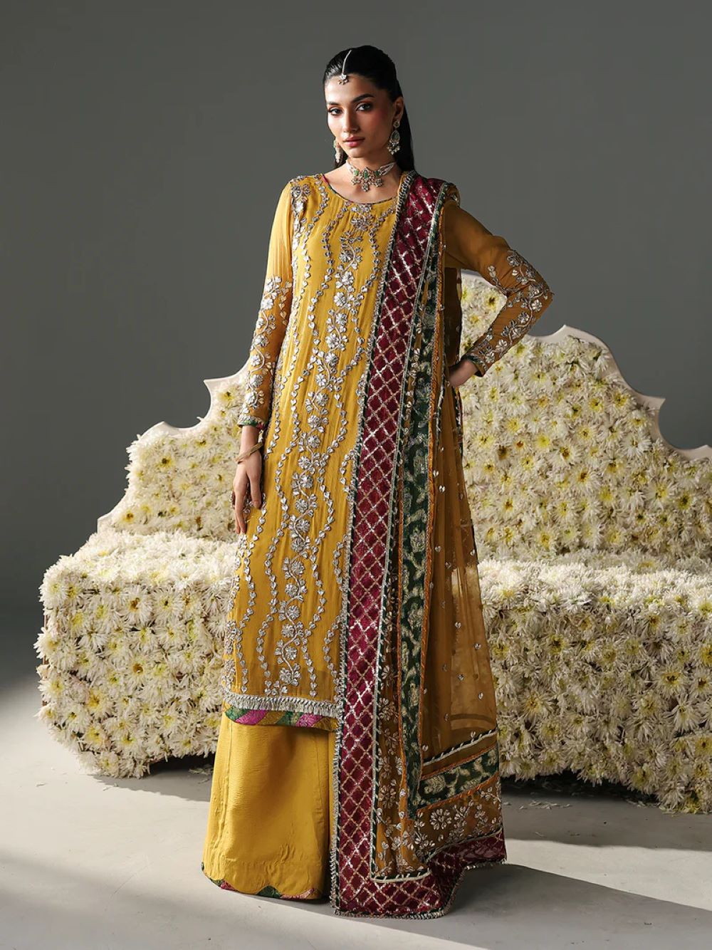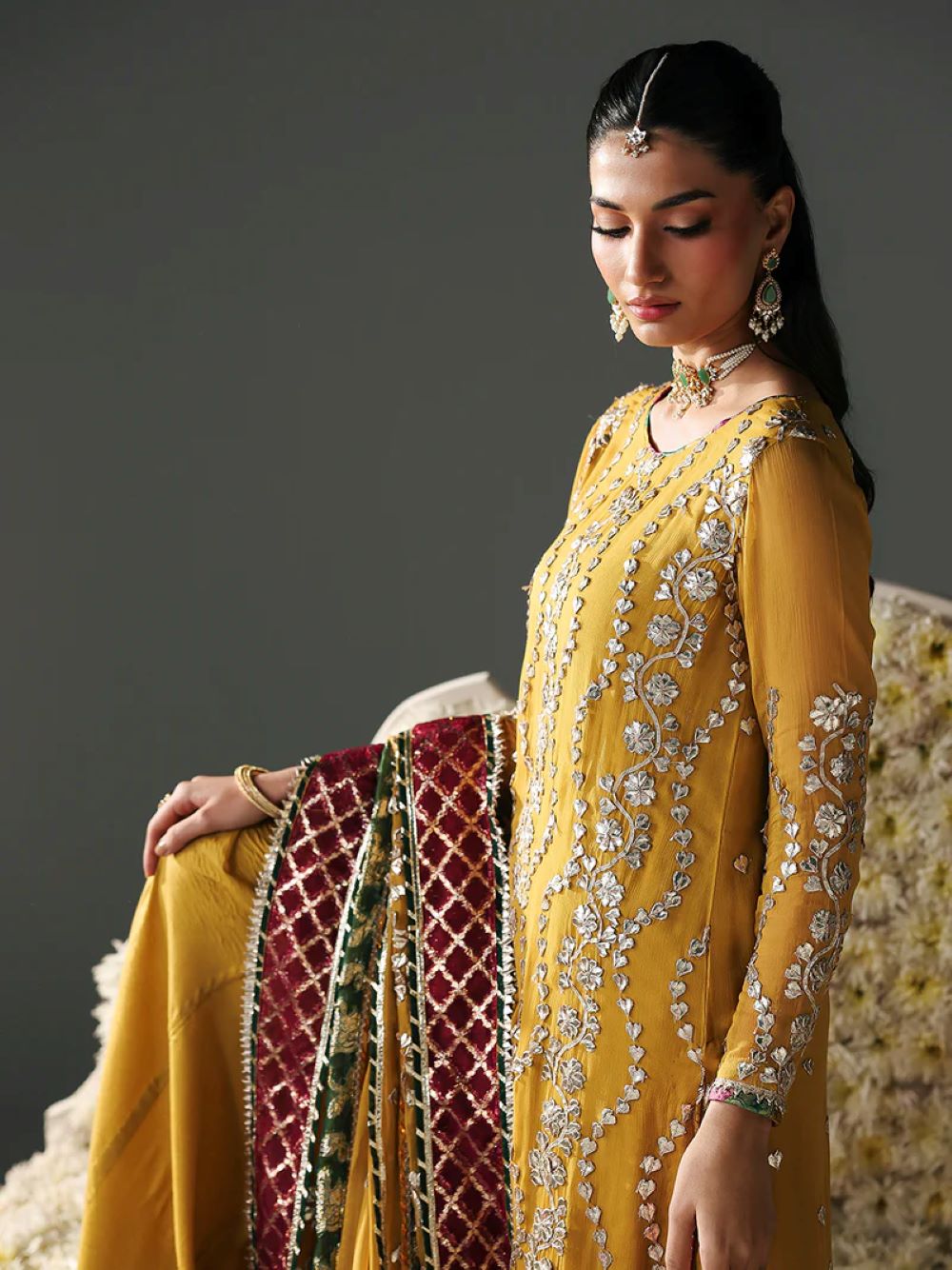 Dupatta: Chiffon dupatta, which showcases both gotta patti embellishments and organza lurex patches