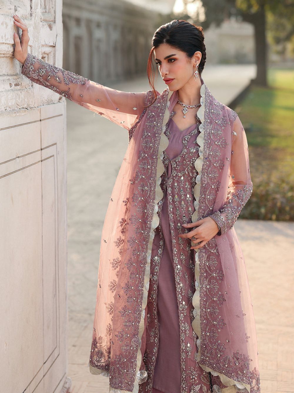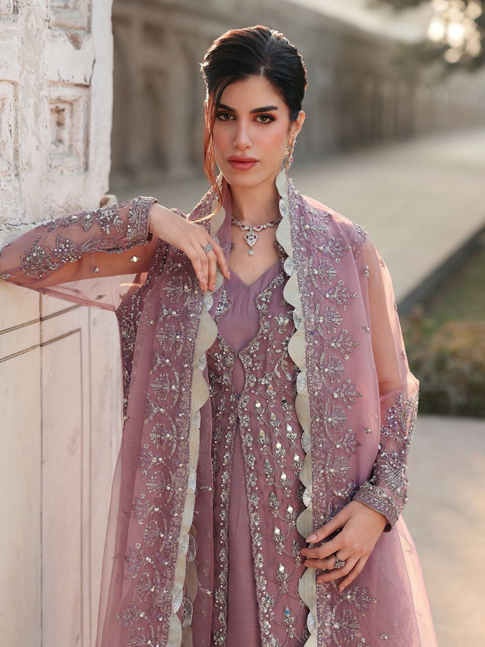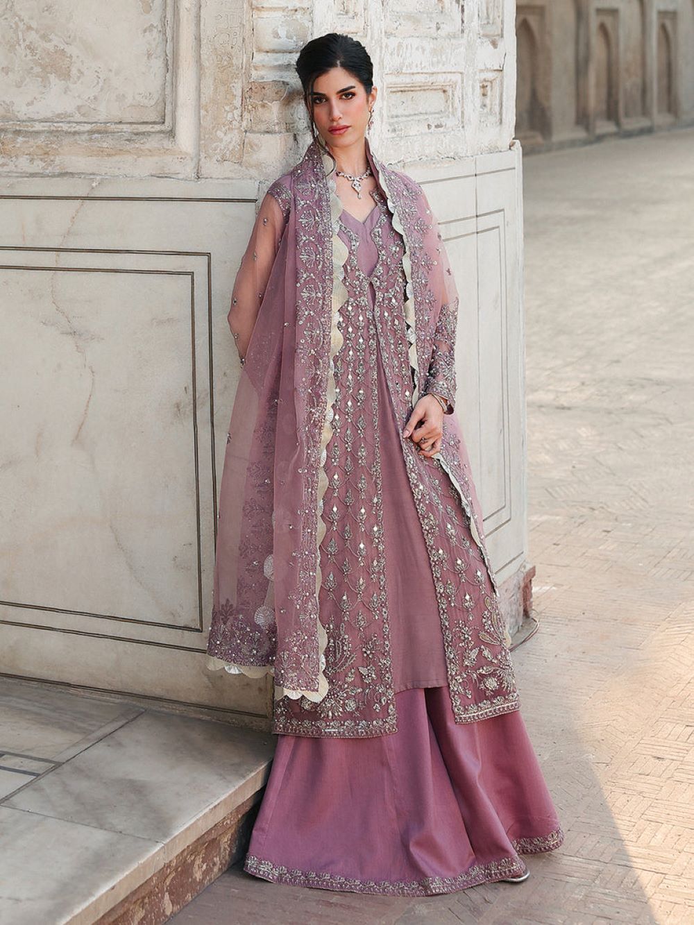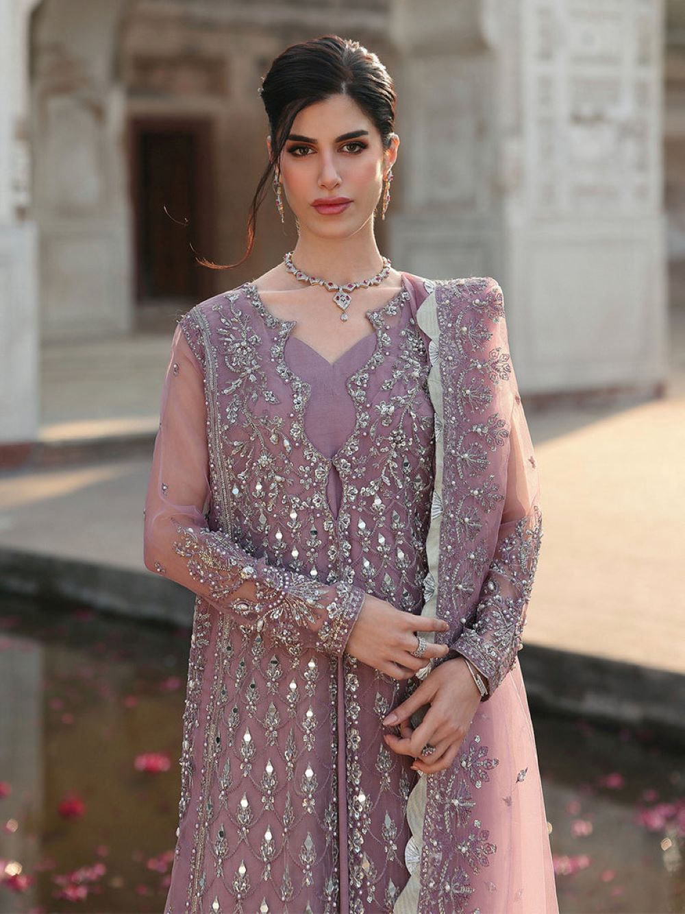 Organza dupatta exquisite sequin embroidery along with pearl embellishments and delicate lace details.