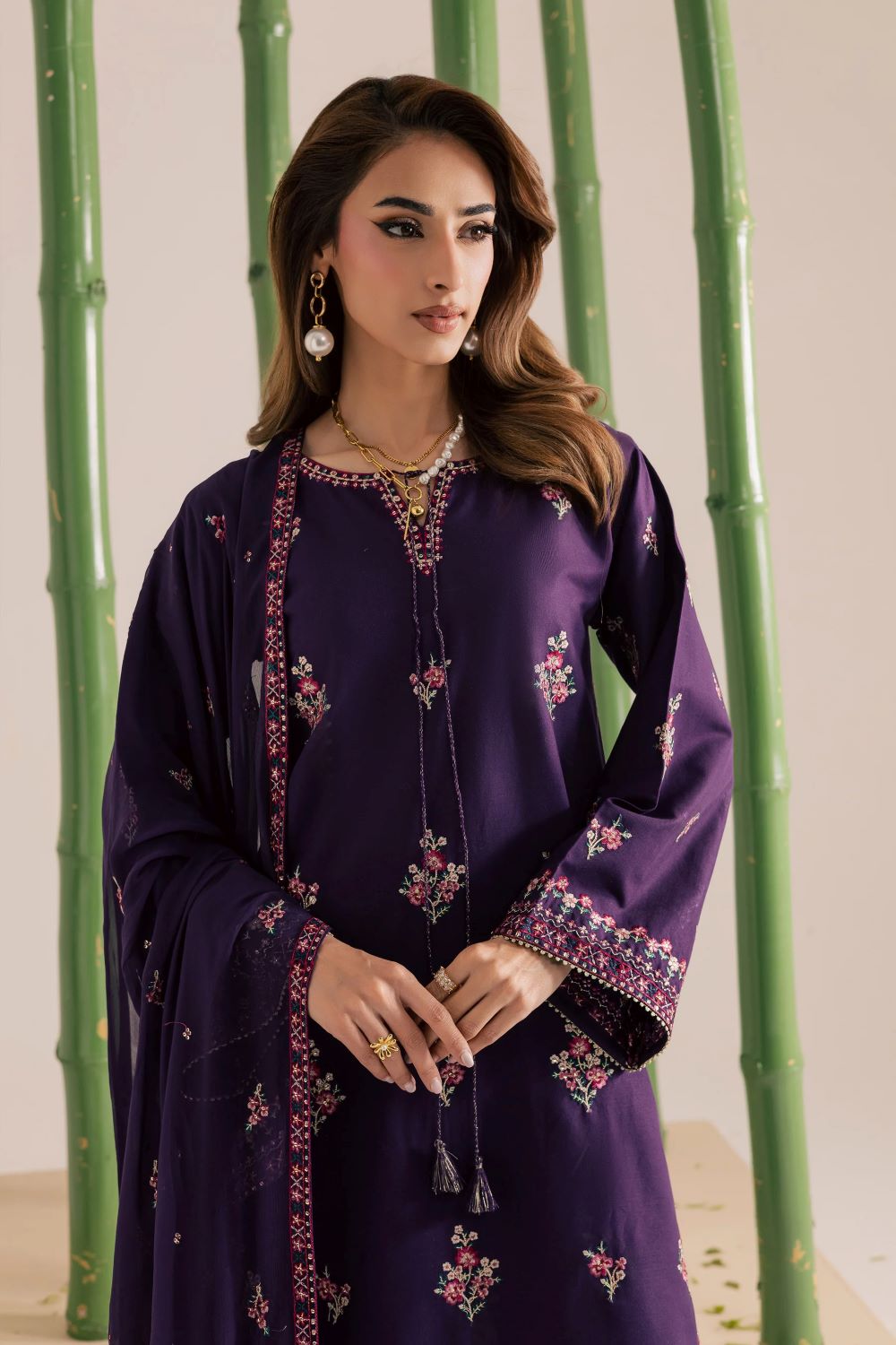 This khaddar outfit features an long shirt with an embroidered front with a detailed neckline finished with dori and tassels, along with a round hem. The sleeves carry an embroidered spread and are finished with borders at the hem, adding a well defined touch.